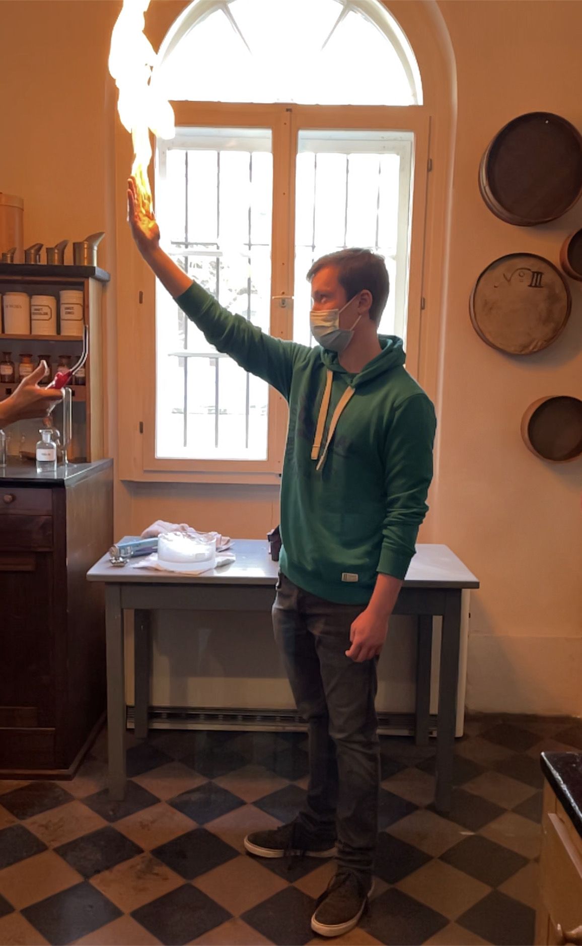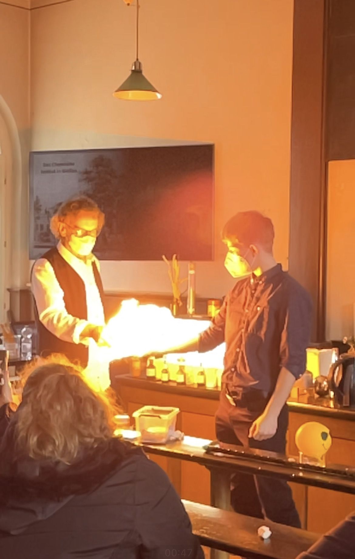 Im Anschluss wurden die Schülerinnen und Schüler durch die historischen Räumlichkeiten des berühmten Chemikers geführt und auch hier blieben spannende Experimente nicht aus. Am Ende fand ein beeindruckender Trick statt, bei dem in Sekundenschnelle aus zwei farblosen Flüssigkeiten „Bier“ hergestellt und die Gäste augenzwinkernd mit den Worten nach Hause geschickt wurden, dass man Experimente immer auch hinterfragen müsse bzw. nichts von Fremden annehmen dürfe, denn auch wenn es wie Bier aussehe, müsse es nicht Bier sein…
