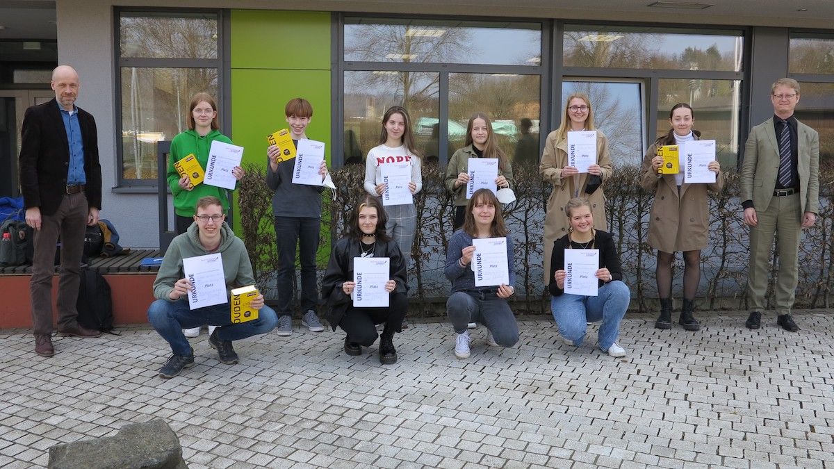 Von den Schülerinnen und Schülern der E-Phase erreichten mit jeweils 13 Fehlern Ben Kring, Josefine Kumst, Benedikt Steinberg und Paula Weber die beste Platzierung. Paula Reimann, Luisa Scheidt, Emilia Thielmann und Paula Würtz teilten sich mit 15 Fehlern den zweiten Rang, gefolgt von Ira Peter, Valentin Reich und Emma Weil mit je 17 Fehlern. Außer Konkurrenz erzielte Jonatan Schmidt (Jahrgangsstufe 8) mit elf Fehlern ein beeindruckendes Ergebnis. Im Rahmen einer kleinen Siegerehrung, die am 25. März stattfand, beglückwünschten Schulleiter Martin Hinterlang, Fachbereichsleiter Markus Hoffmann und Jan Harms, Organisator des Rechtschreibwettbewerbs, die Schülerinnen und Schüler zu ihren Leistungen.