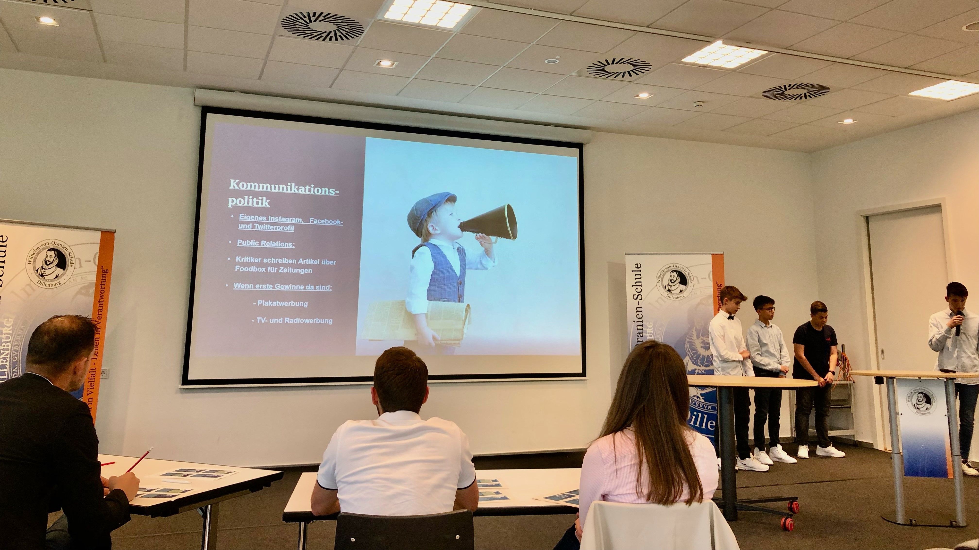 Wie in der gleichnamigen TV-Sendung bestand das Projektergebnis in einem Pitch zur Unternehmensidee vor einer Jury, den „Löwen“. An die WvO kamen hierfür eigens Gäste aus der Wirtschaft, um sich ein Bild von den Präsentationen der Geschäftsideen zu machen und im Anschluss in einer Fragerunde den jungen Gründern auf den Zahn zu fühlen. Diese Prüfung bestanden die Gruppen sehr überzeugend: Sicher und souverän sowie fachlich fundiert agierten sie in den Bereichen der Produktideen und –innovation, Marketingstrategie, Preiskalkulation, Marktanalyse etc. Die Jury zeigte sich sichtlich beeindruckt von den professionellen Ergebnissen.