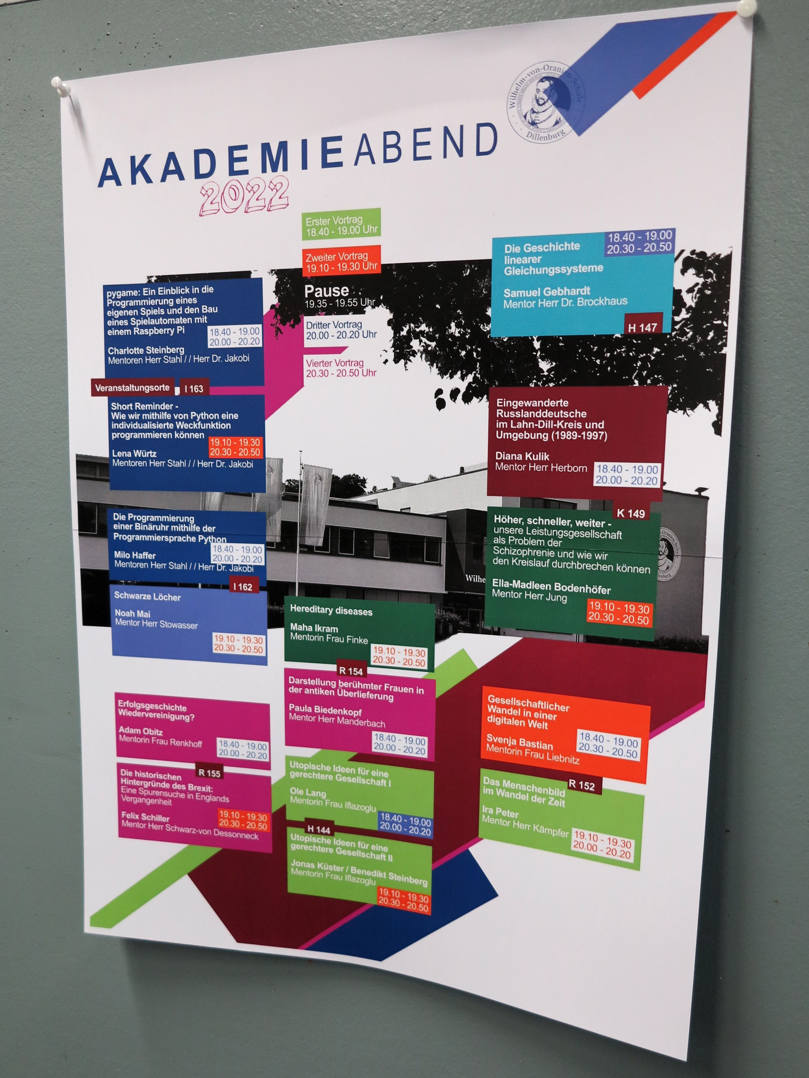 Als Abschluss dessen bot der Akademieabend den Schülerinnen und Schülern die Gelegenheit, ihre Projekte vorzustellen. Aus den Projektideen wurden, in einem Zeitraum von bis zu einem Dreivierteljahr, 15 gelungene Projekte in den Fächern Latein, Geschichte, Politik, Ethik, Mathematik, Informatik, Physik, Biologie und Psychologie. Dies geschah weitestgehend selbstständig, doch bei Schwierigkeiten standen die jeweiligen Mentorinnen und Mentoren den Schülerinnen und Schülern zur Seite.