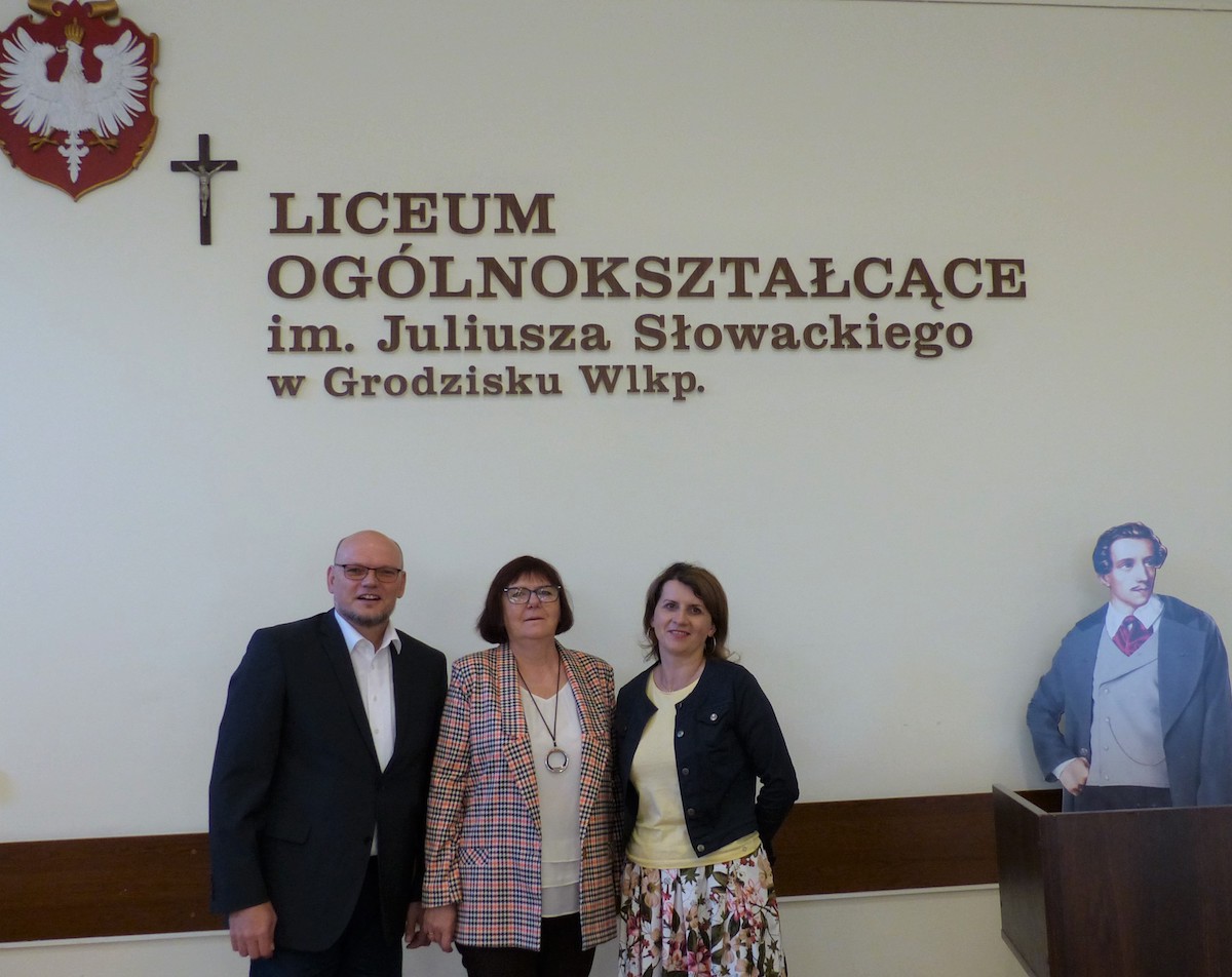 An der Büste des pol. Nationaldichters Juliusz Słowacki (Namensgeber d. Lyzeums) _v.l.n.r.: Paul Sajon + Vizeleiterin Grażyna Skrzypczak