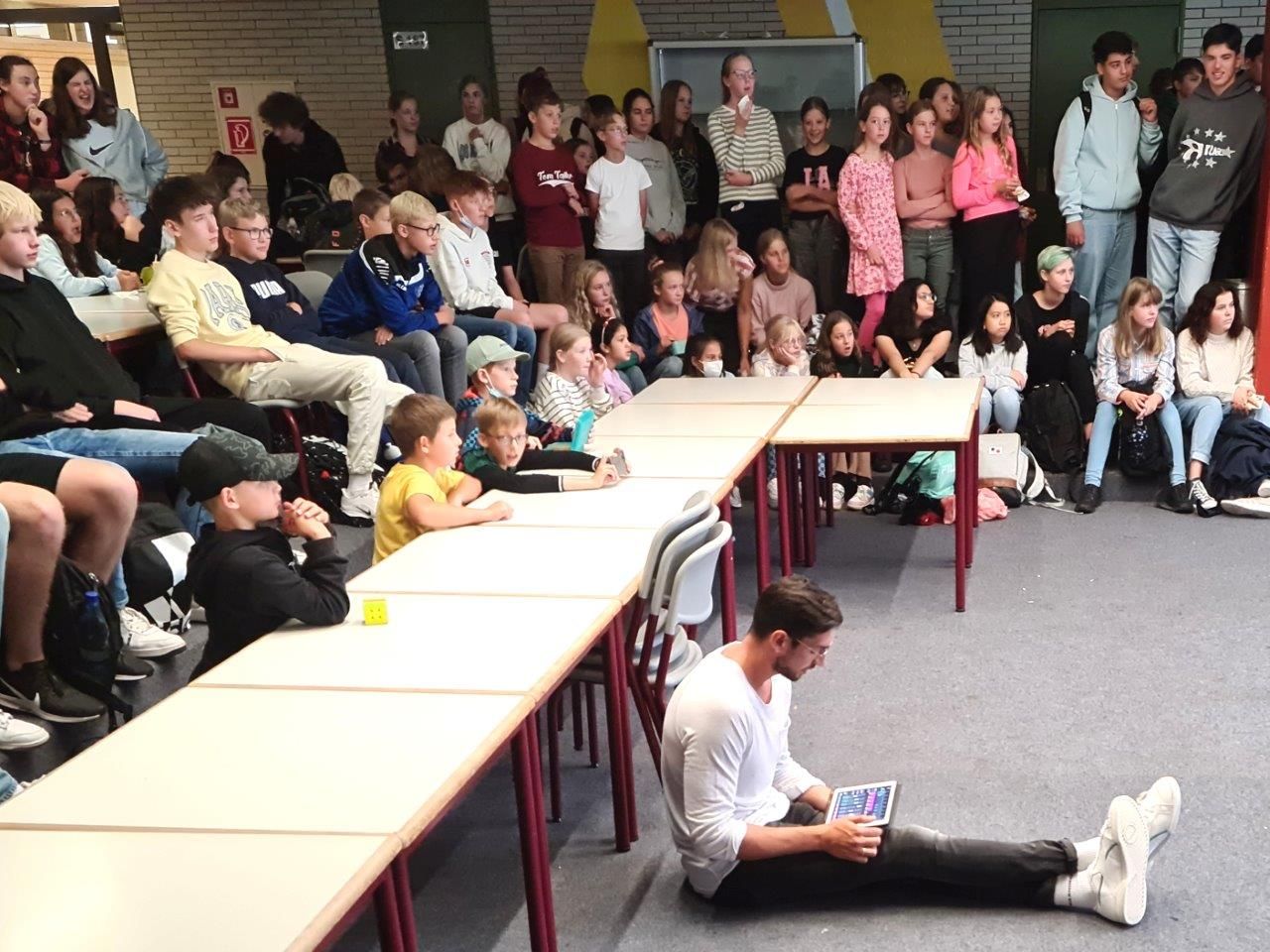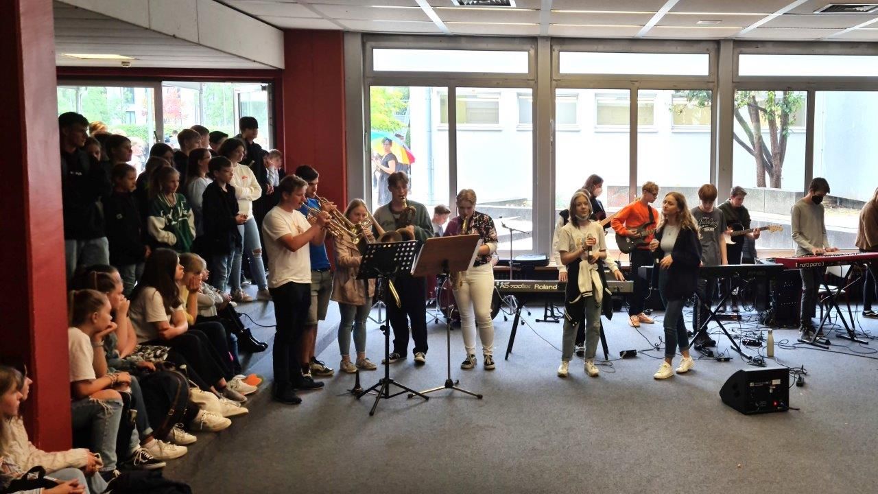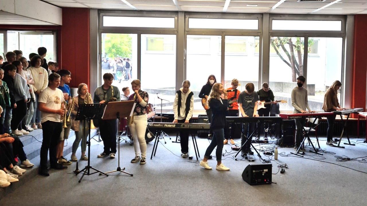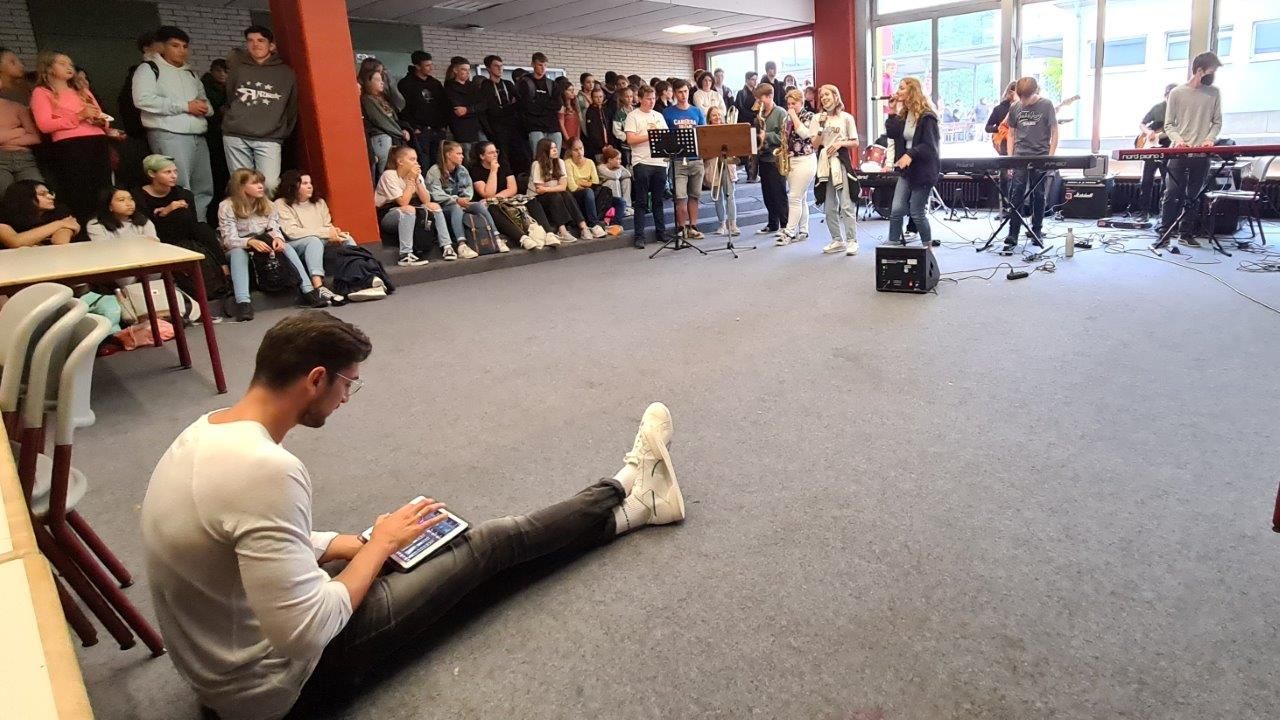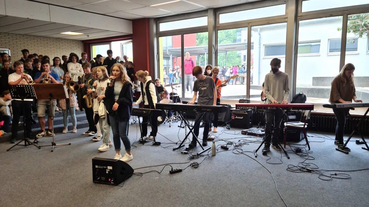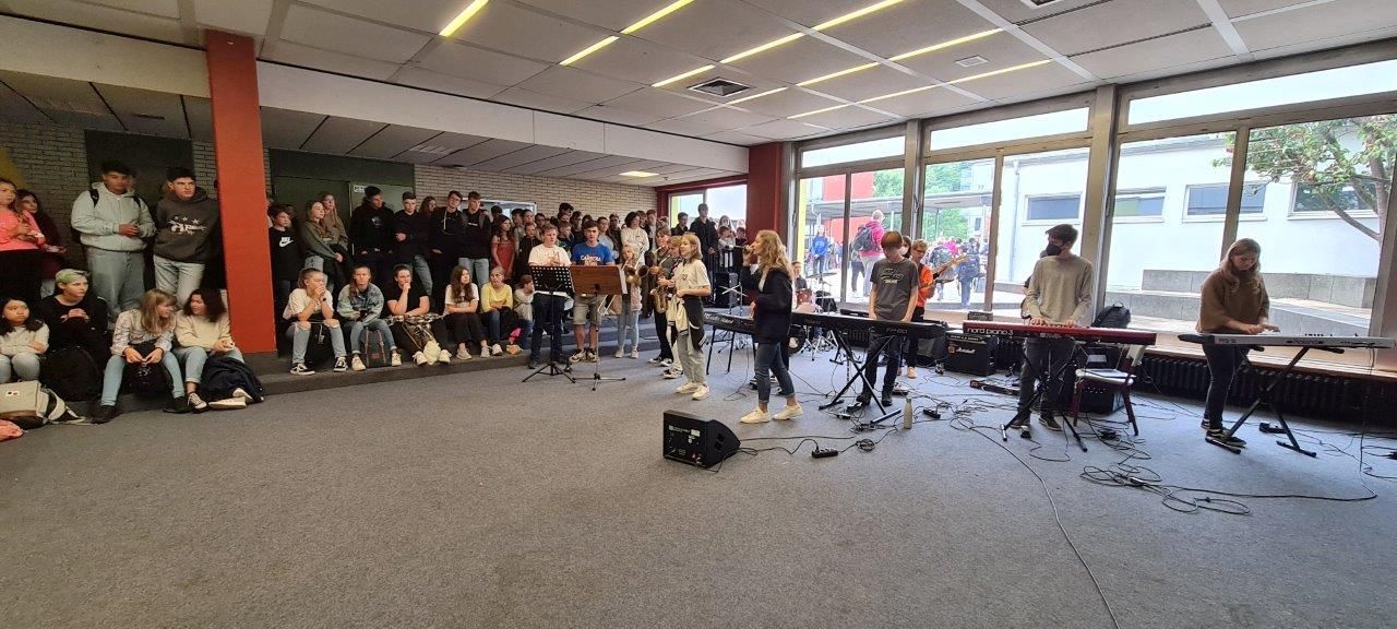 Eigentlich war der Auftritt „open air“ geplant, aber das regnerische Wetter machte einen Strich durch die Rechnung. Flugs wurde das Pausenkonzert, welches die Schulband unter Leitung von Jakob Tollerian vorbereitet hatte, ins sog. „Schwimmbad“ verlegt. Zahlreiche Zuhörer lauschten dem vollen Sound der Band in dem beliebten Pausenbereich und freuten sich über die willkommene musikalische Abwechslung im Schulalltag. Für die hervorragend präsentierten Songs gab es dann auch einen fetten Applaus – sofern das Pausenbrot in den Händen dies zuließ.