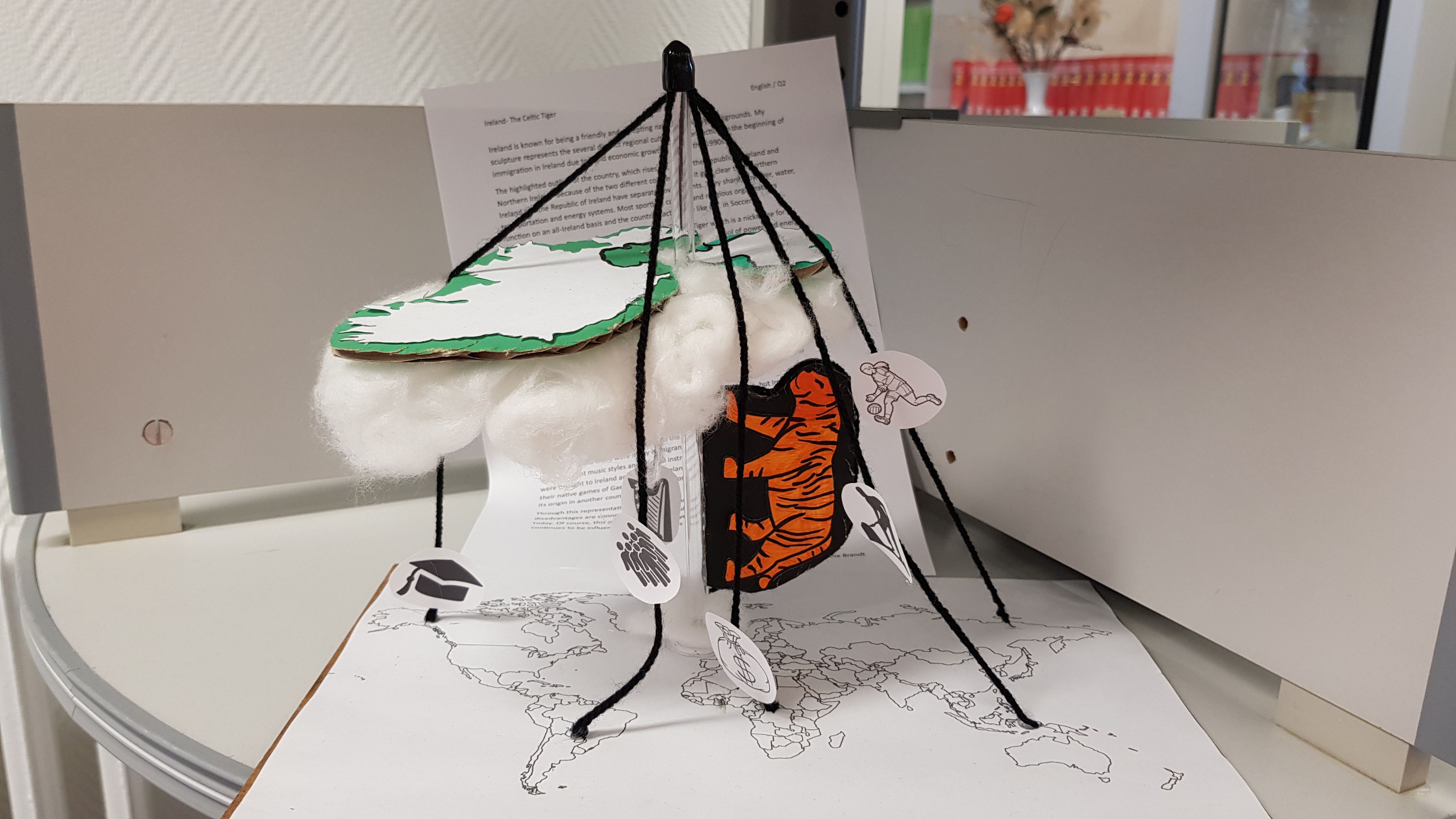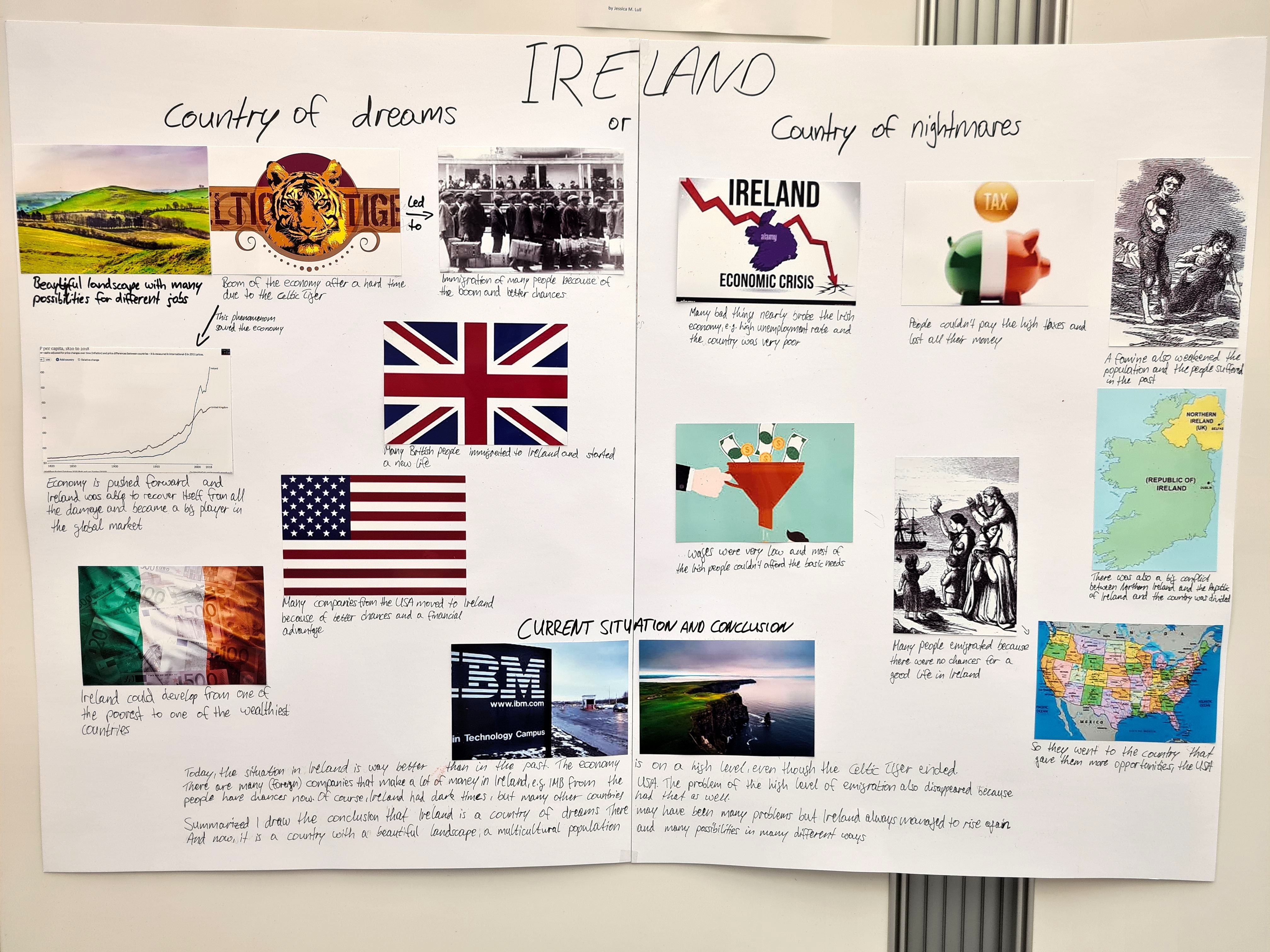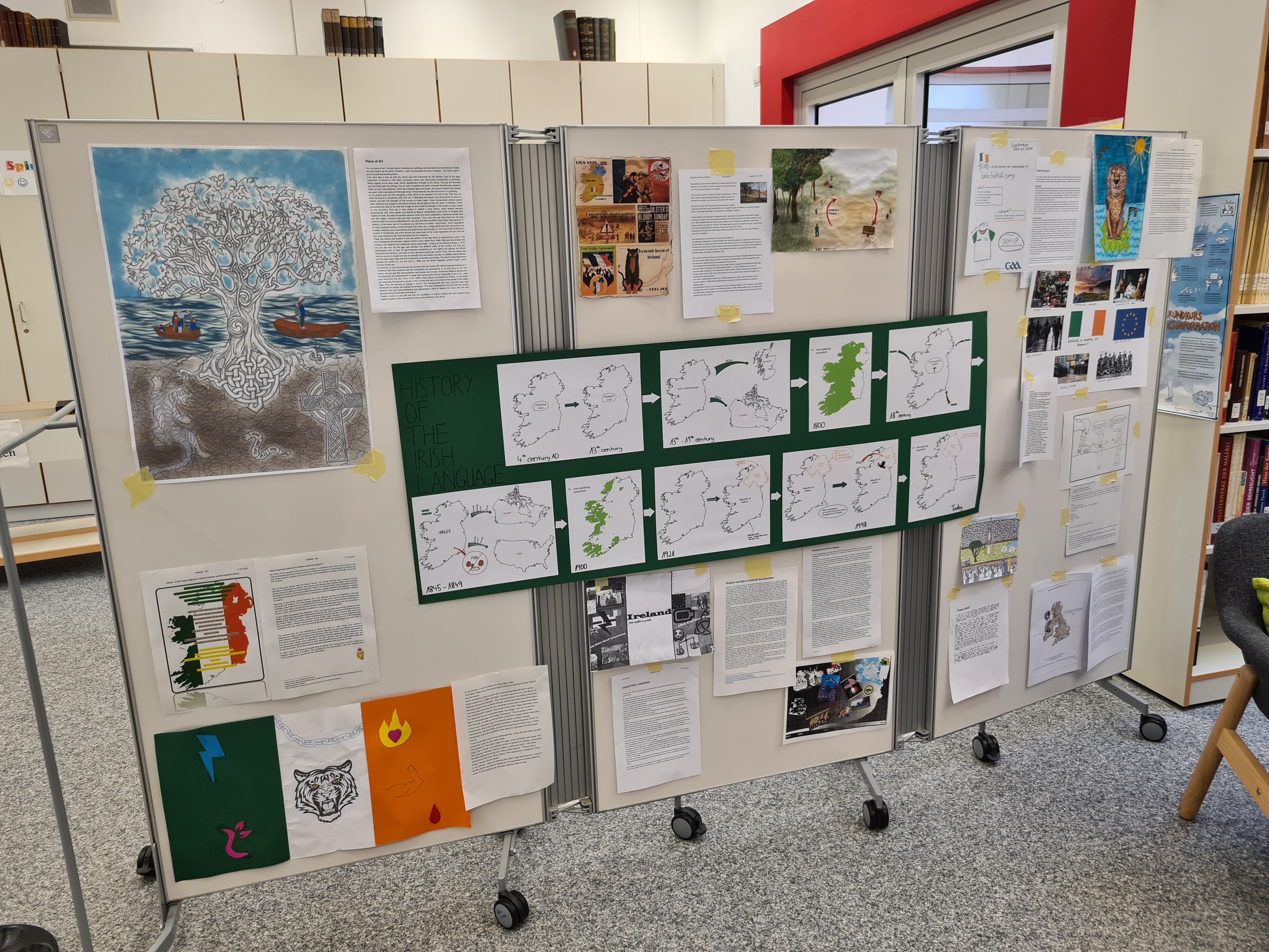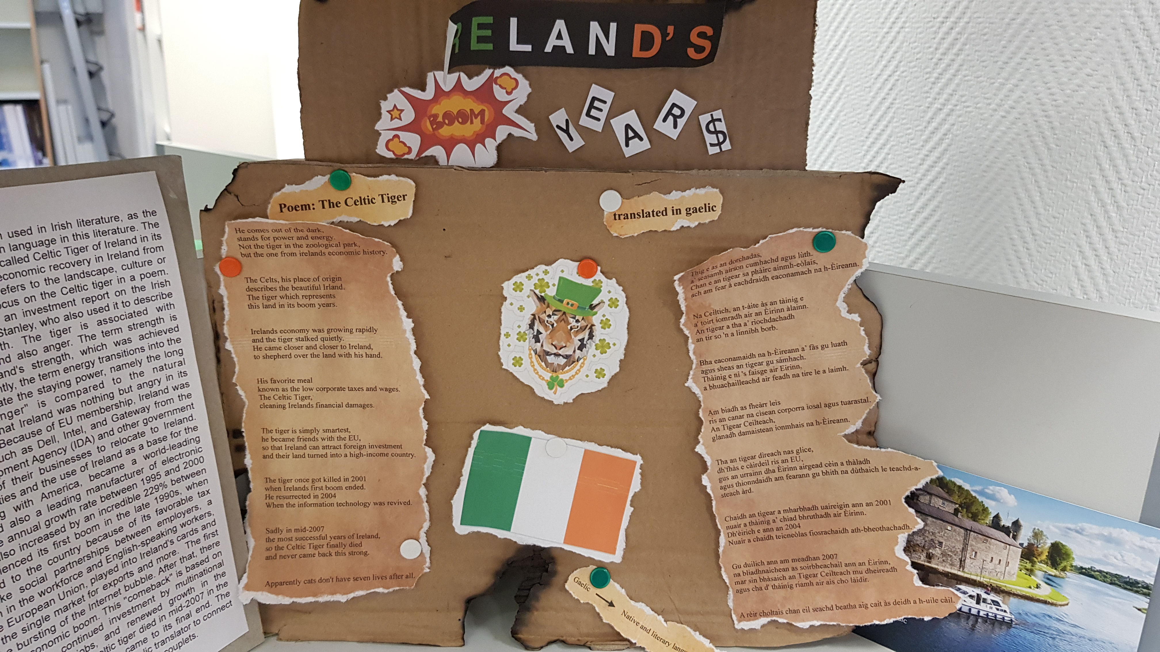 Auf der Grundlage intensiver Recherche zu den Themenbereichen „Ireland – A country of dreams?“, „Ireland - A country of nightmares?“ , „Ireland – The Celtic Tiger“ sowie frei wählbarer Aspekte aus den Bereichen Musik, Literatur und Kunst erarbeiteten die Schülerinnen und Schüler zunächst ein inhaltliches Konzept sowie eine Skizze des herzustellenden Exponats. Die in der Bibliothek ausgestellten Arbeitsergebnisse bieten nun vielfältige Einblicke in Irlands Geschichte, Wirtschaft, Kultur und Menschen.