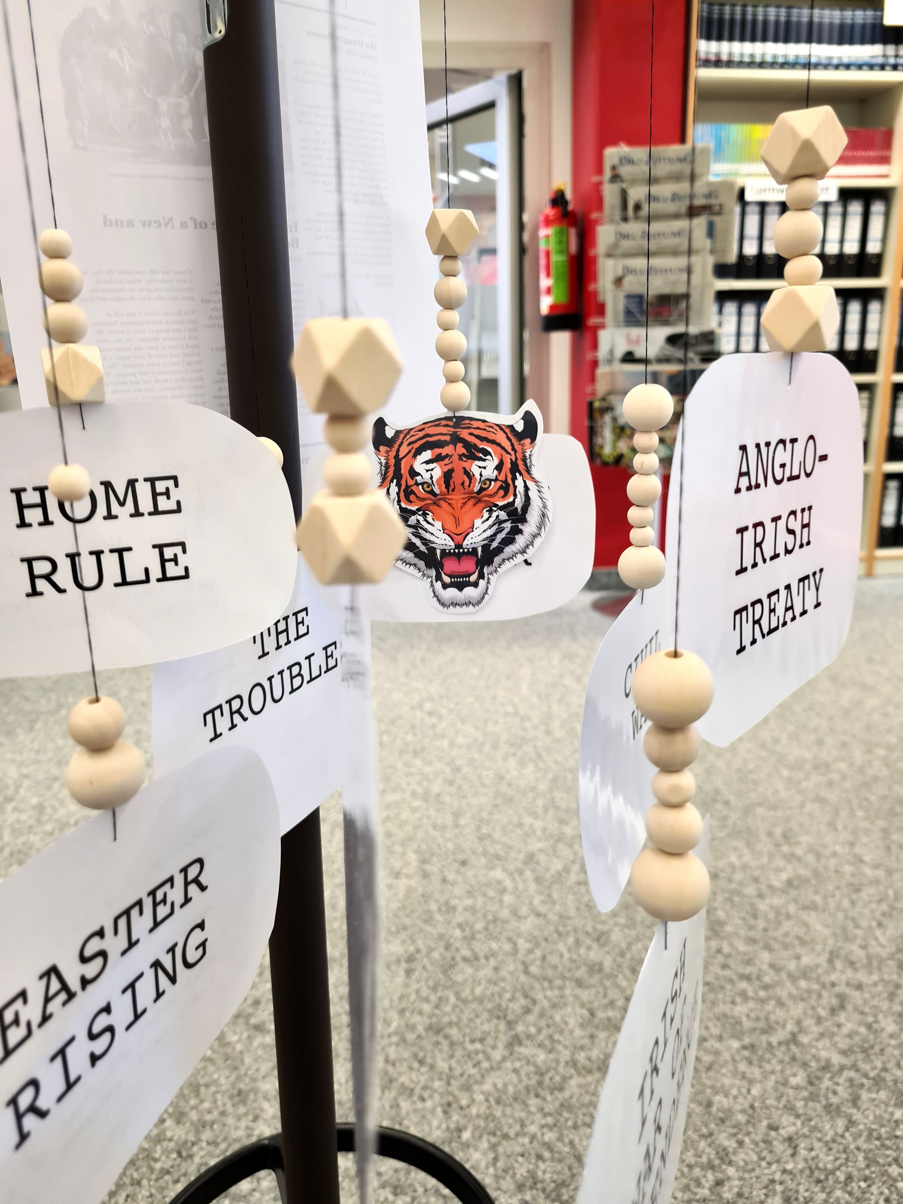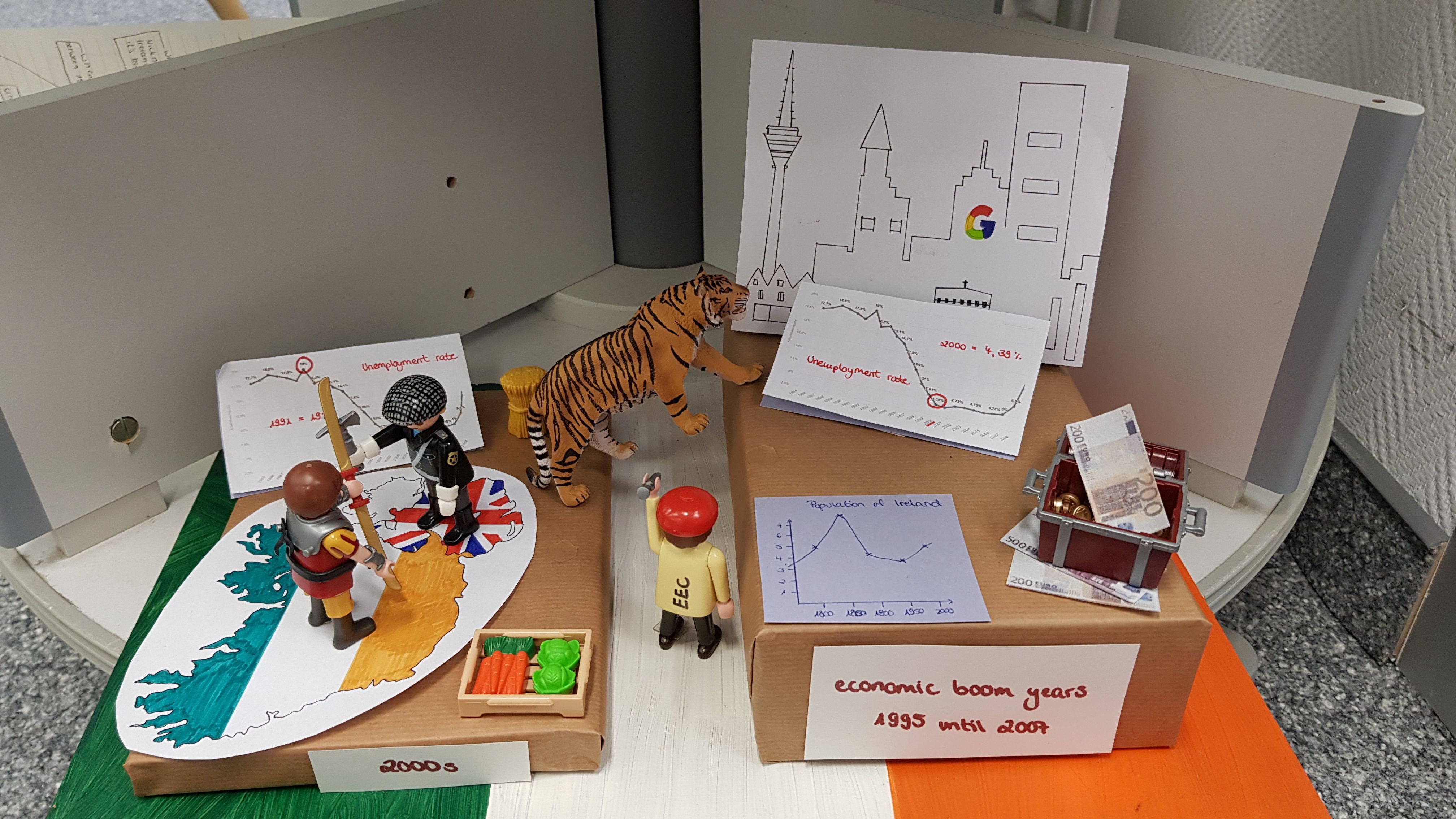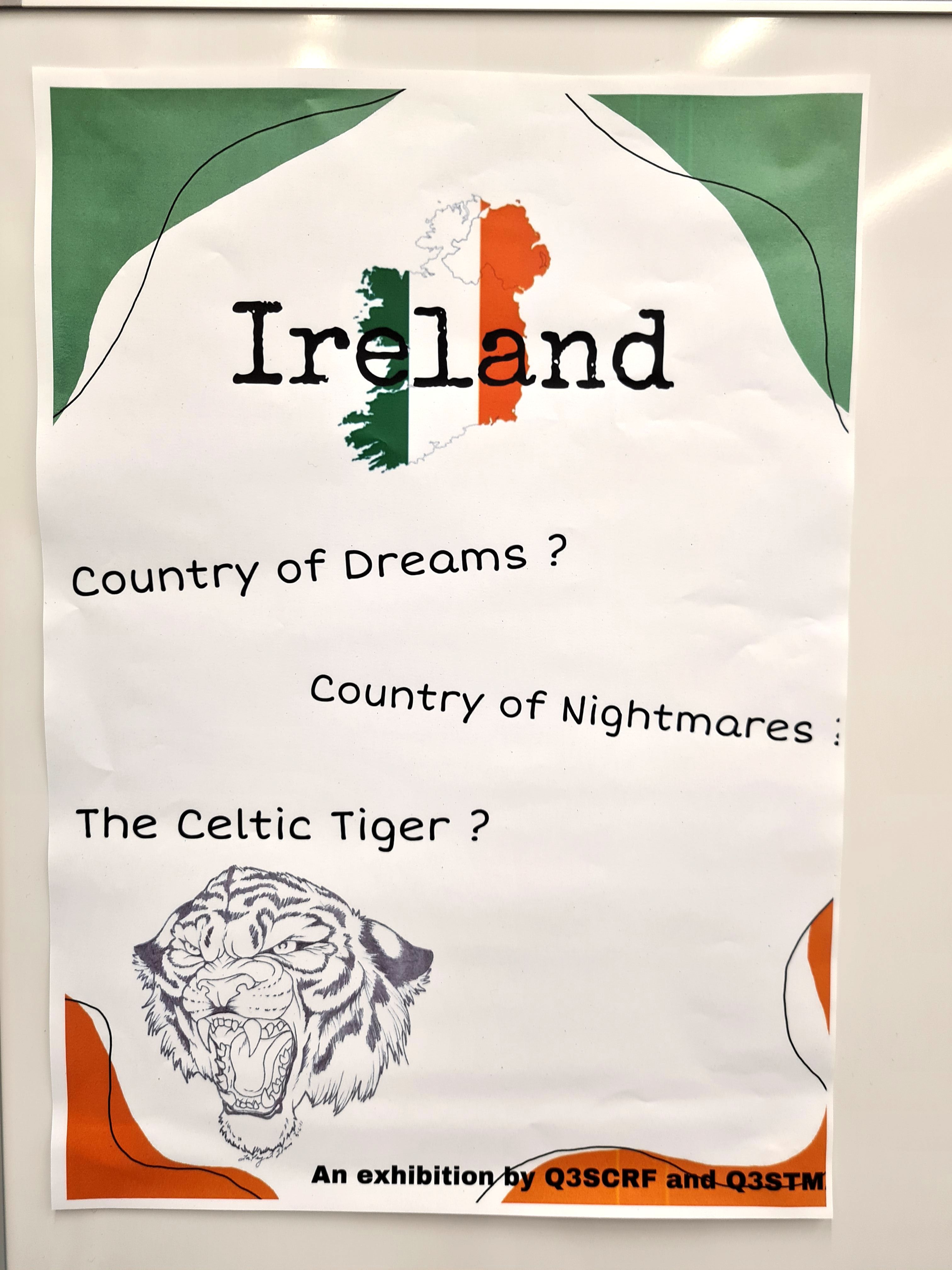 Auf der Grundlage intensiver Recherche zu den Themenbereichen „Ireland – A country of dreams?“, „Ireland - A country of nightmares?“ , „Ireland – The Celtic Tiger“ sowie frei wählbarer Aspekte aus den Bereichen Musik, Literatur und Kunst erarbeiteten die Schülerinnen und Schüler zunächst ein inhaltliches Konzept sowie eine Skizze des herzustellenden Exponats. Die in der Bibliothek ausgestellten Arbeitsergebnisse bieten nun vielfältige Einblicke in Irlands Geschichte, Wirtschaft, Kultur und Menschen.
