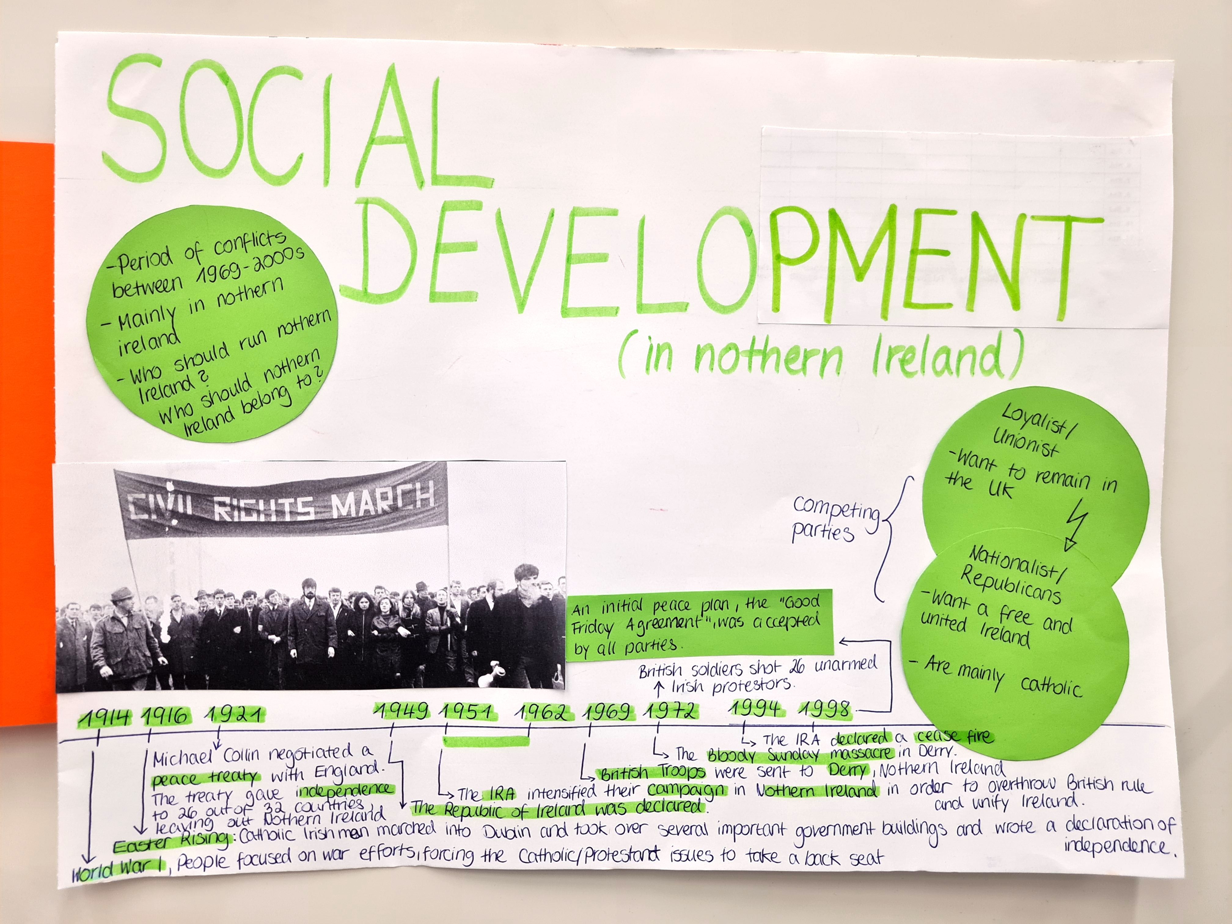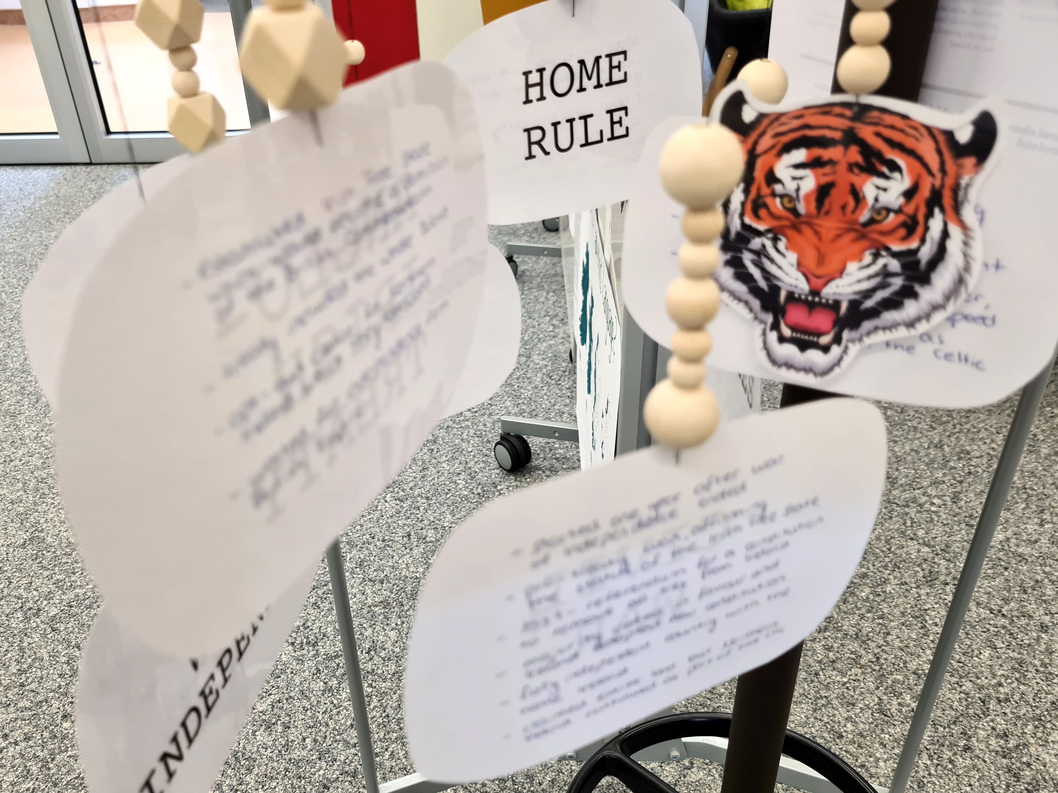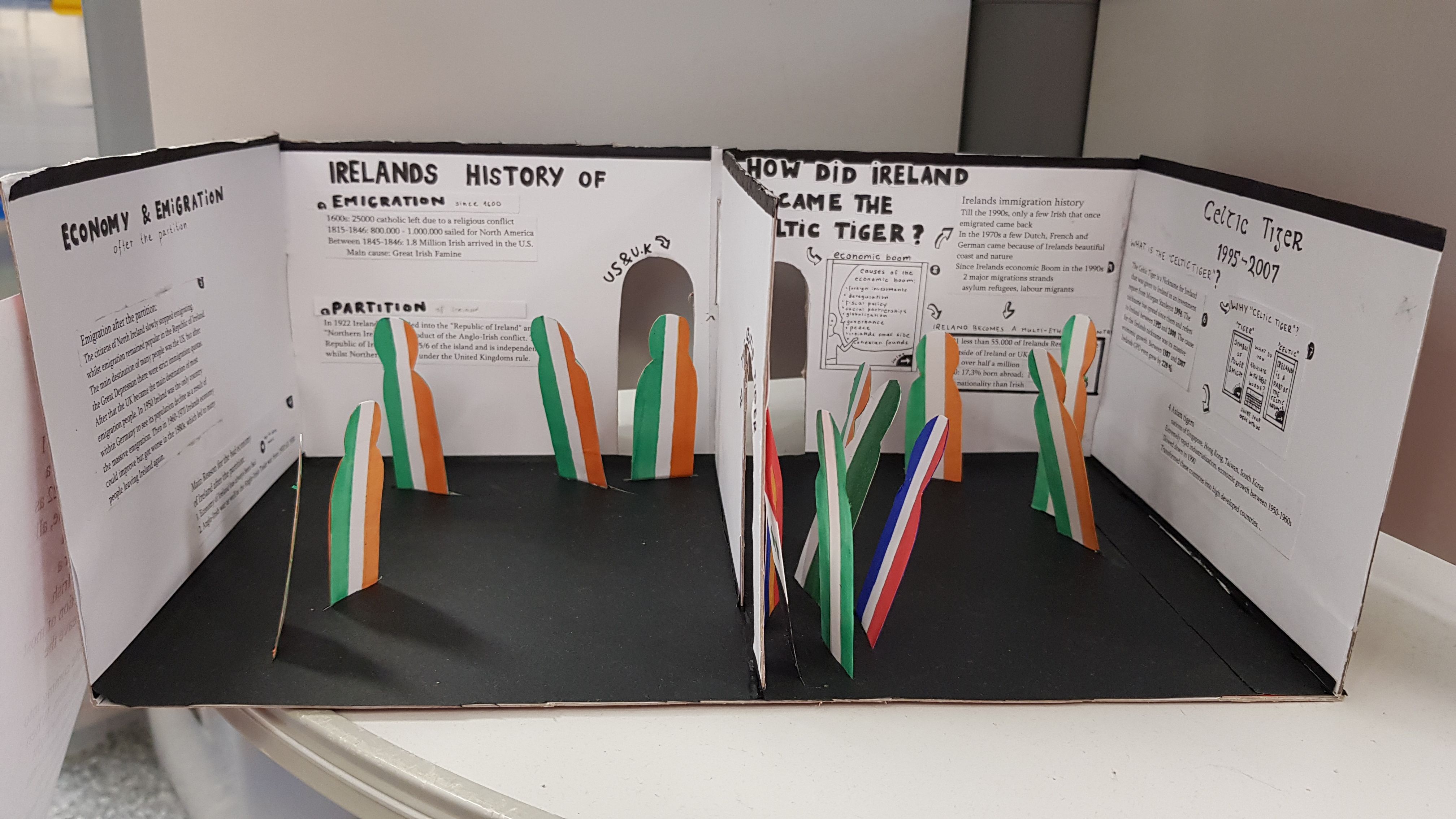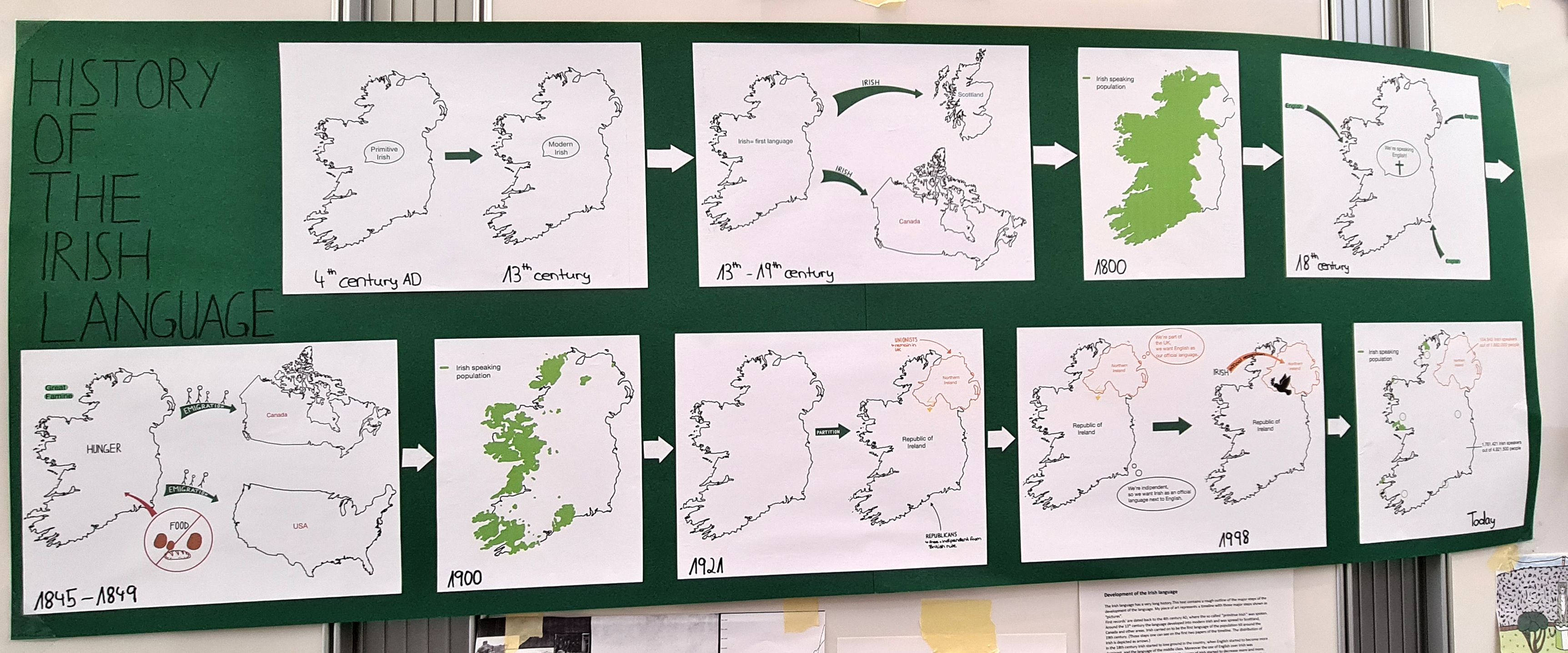 Auf der Grundlage intensiver Recherche zu den Themenbereichen „Ireland – A country of dreams?“, „Ireland - A country of nightmares?“ , „Ireland – The Celtic Tiger“ sowie frei wählbarer Aspekte aus den Bereichen Musik, Literatur und Kunst erarbeiteten die Schülerinnen und Schüler zunächst ein inhaltliches Konzept sowie eine Skizze des herzustellenden Exponats. Die in der Bibliothek ausgestellten Arbeitsergebnisse bieten nun vielfältige Einblicke in Irlands Geschichte, Wirtschaft, Kultur und Menschen.