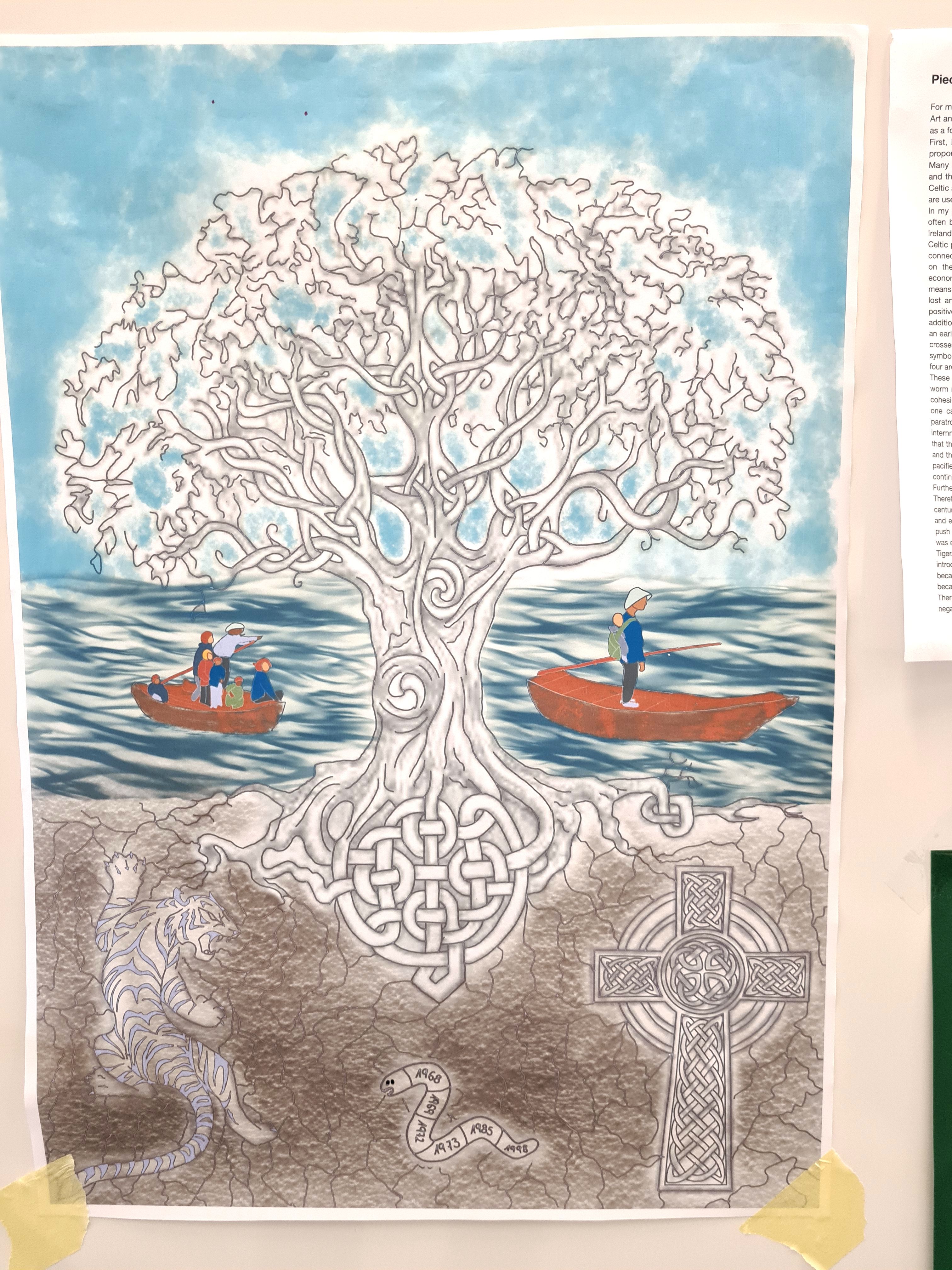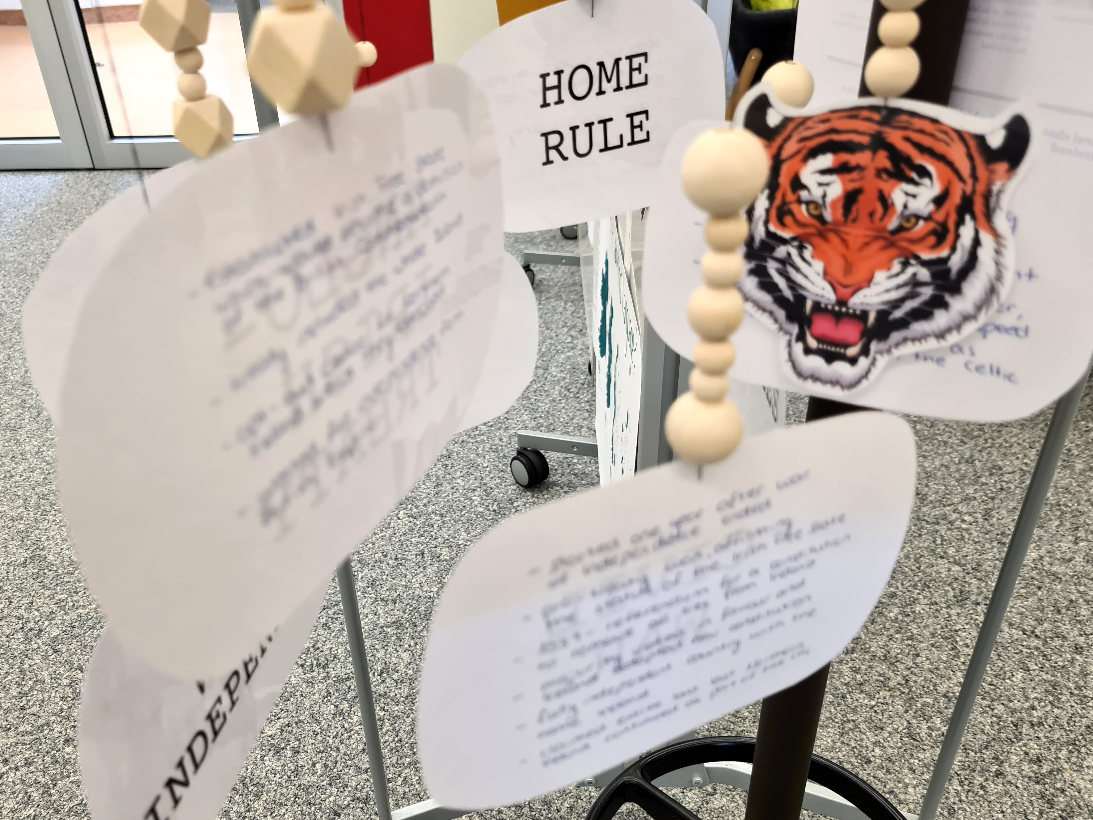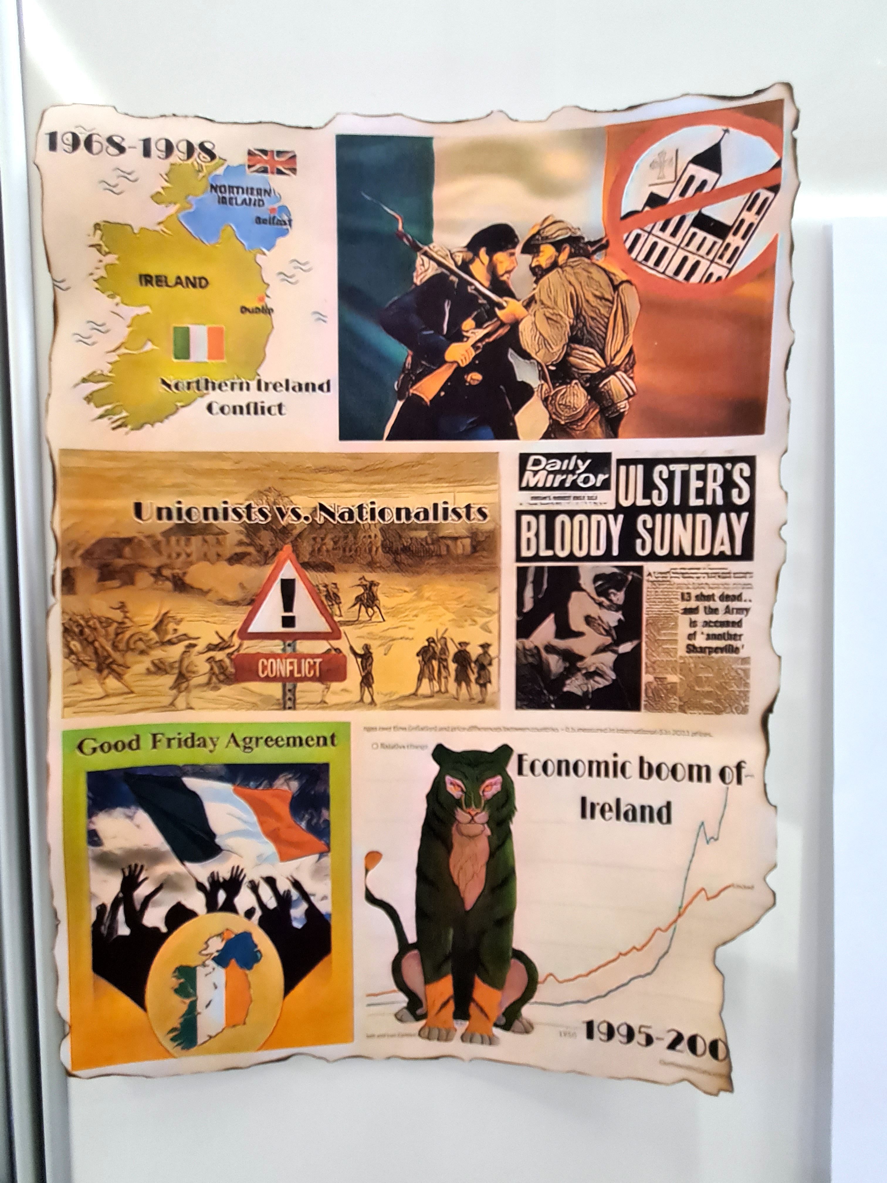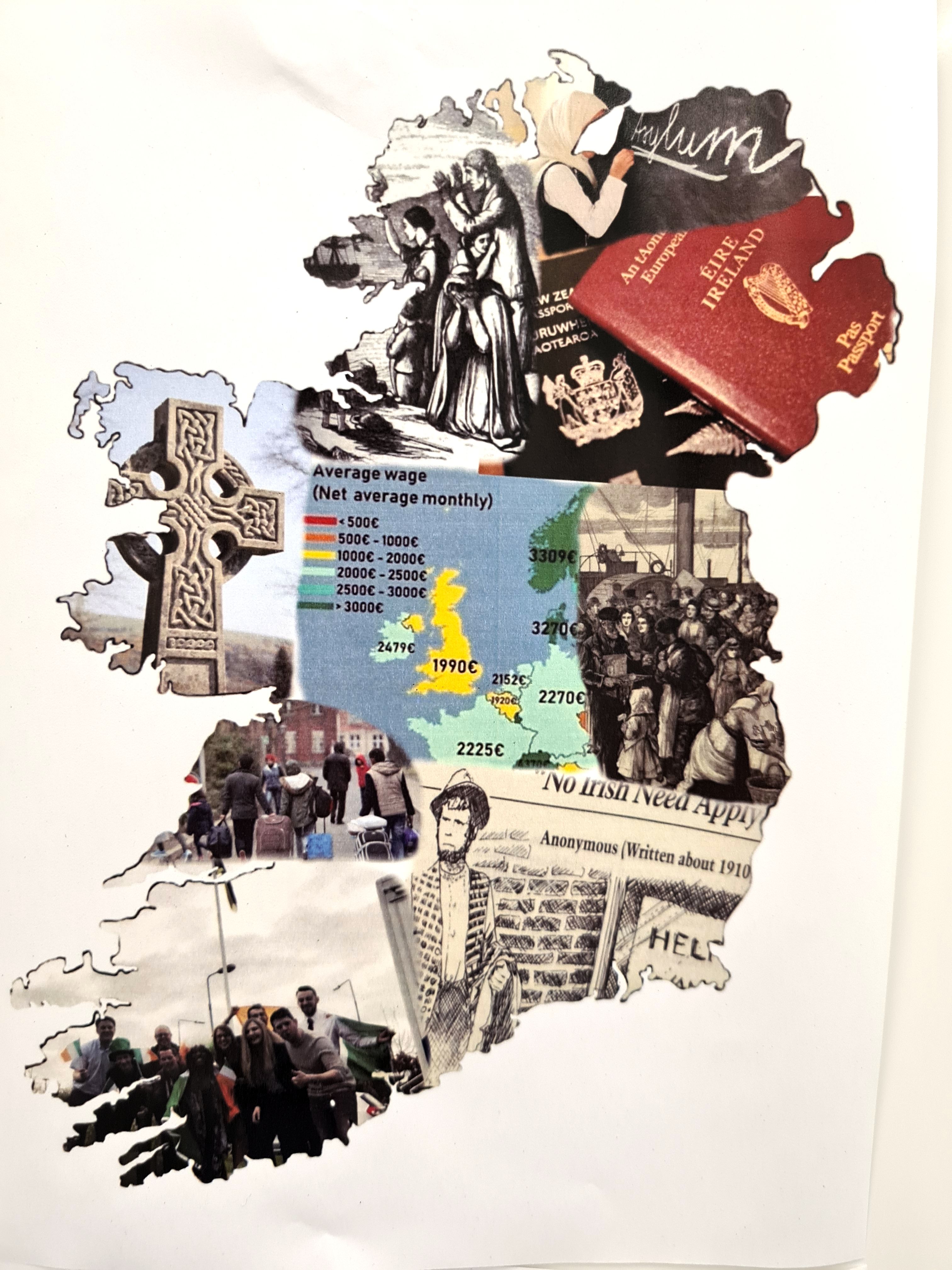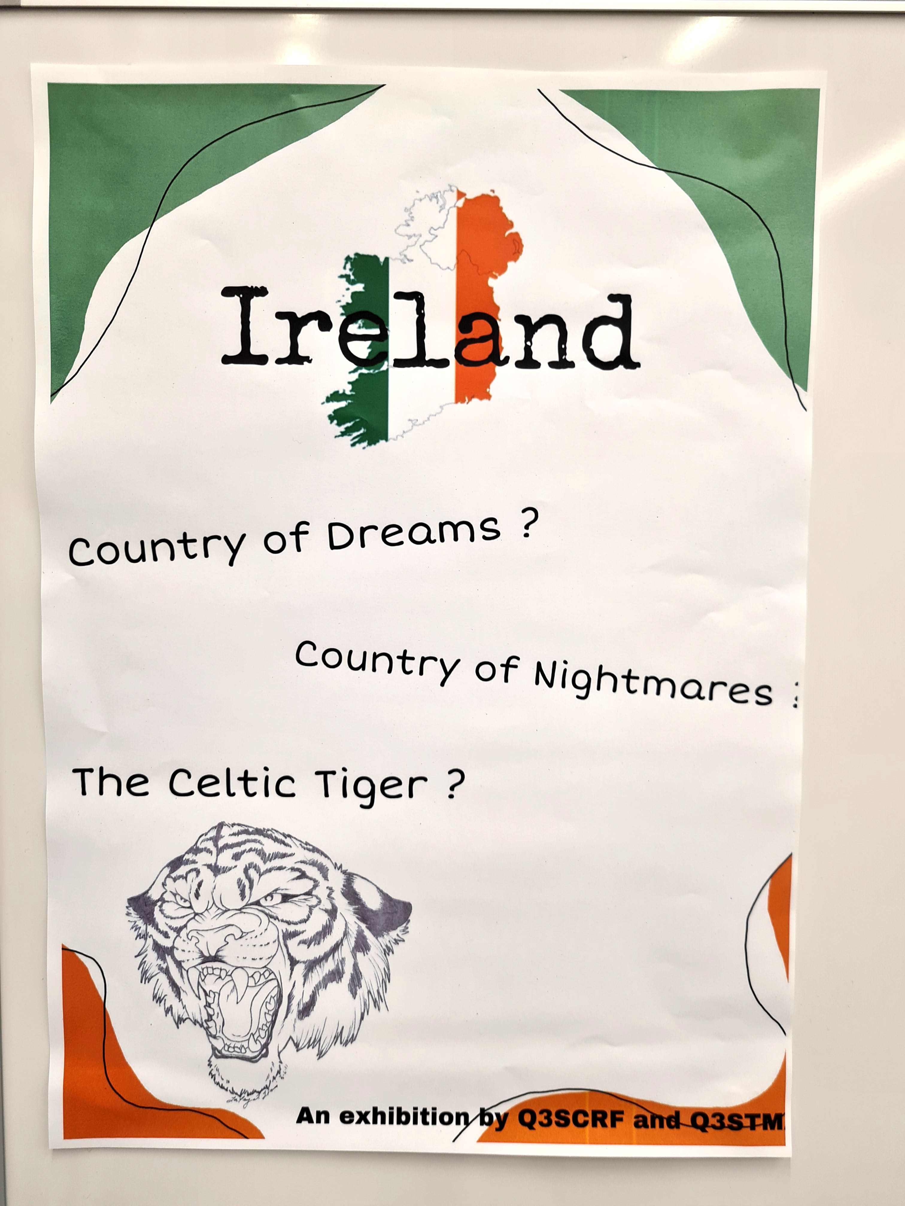 Die Schülerinnen und Schüler der Englisch-Leistungskurse von Ulrike Stahl-Matena und Claudia Scharf erstellten im Rahmen einer mehrwöchigen Projektarbeit zum Thema „Ireland“ facettenreiche künstlerische Exponate, die sich mit unterschiedlichen Aspekten dieses Landes auseinandersetzen.