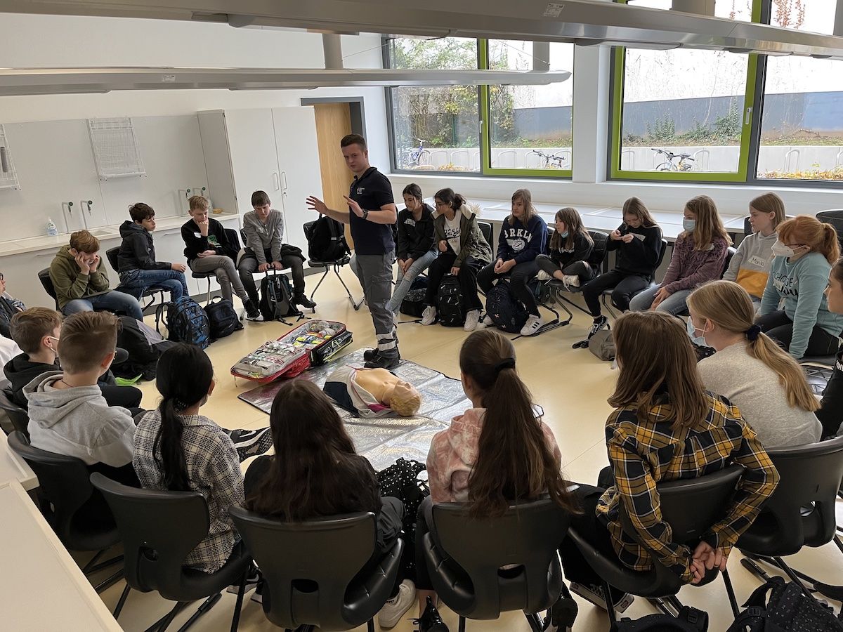 Am 20.10.2022 kam der Rettungssanitäter Hendrik Brill in den Biounterricht der Klassen 6B und 6E. Zuerst stellte er sich kurz vor und dann fragte er, was wir erwarten. Danach erklärte er uns, was man tut, wenn man zum Beispiel eine verunglückte Person auffindet: Als erstes die Person ansprechen, den Notruf wählen und den Puls am Hals oder Handgelenk überprüfen. Das nächste Thema, das der Lebensretter aufgriff, war die Herzdruckmassage. Nachdem er uns erklärt hatte, was das ist und wie es funktioniert (dreißig Mal fest auf den Brustkorb drücken und zwei Mal in Mund oder Nase pusten), zeigte der Sanitäter dies an einer Puppe, an der wir dies später auch selber ausprobieren durften. Anschließend lernten wir die stabile Seitenlage kennen. Zum Abschluss beantwortete Herr Brill all unsere Fragen rund um Verletzungen. Alle Kinder fanden diese Stunden sehr lehrreich.