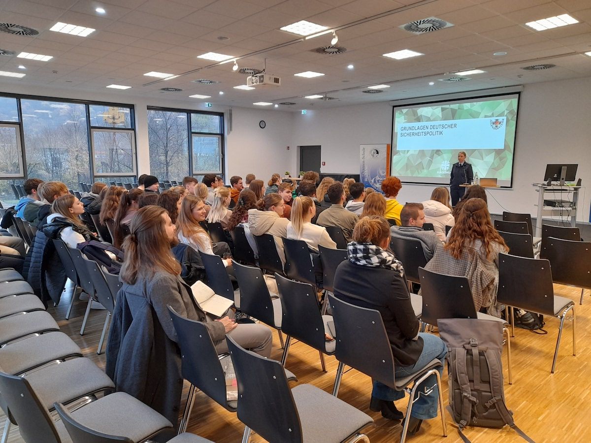 Unter dem Aspekt der veränderten Sicherheitspolitik speziell seit dem Angriffskrieg auf die Ukraine, betrachtete der vortragende Gast historische Ereignisse, die die sicherheitspolitische Lage in den letzten Jahrzehnten grundlegend für Deutschland und die Welt veränderten. Unter dem inhaltlichen Fokus aktueller politischer Herausforderungen skizzierte Hauptmann Vargas nicht nur die Schwierigkeiten internationaler Militäreinsätze im Rahmen von Verteidigungsbündnissen, sondern berichtete detailliert und informativ über ihre eigenen Erfahrungen im Auslandseinsatz und den Gefahren, die sich aus dem Angriffskrieg von Russland auf die Ukraine entwickelt haben.