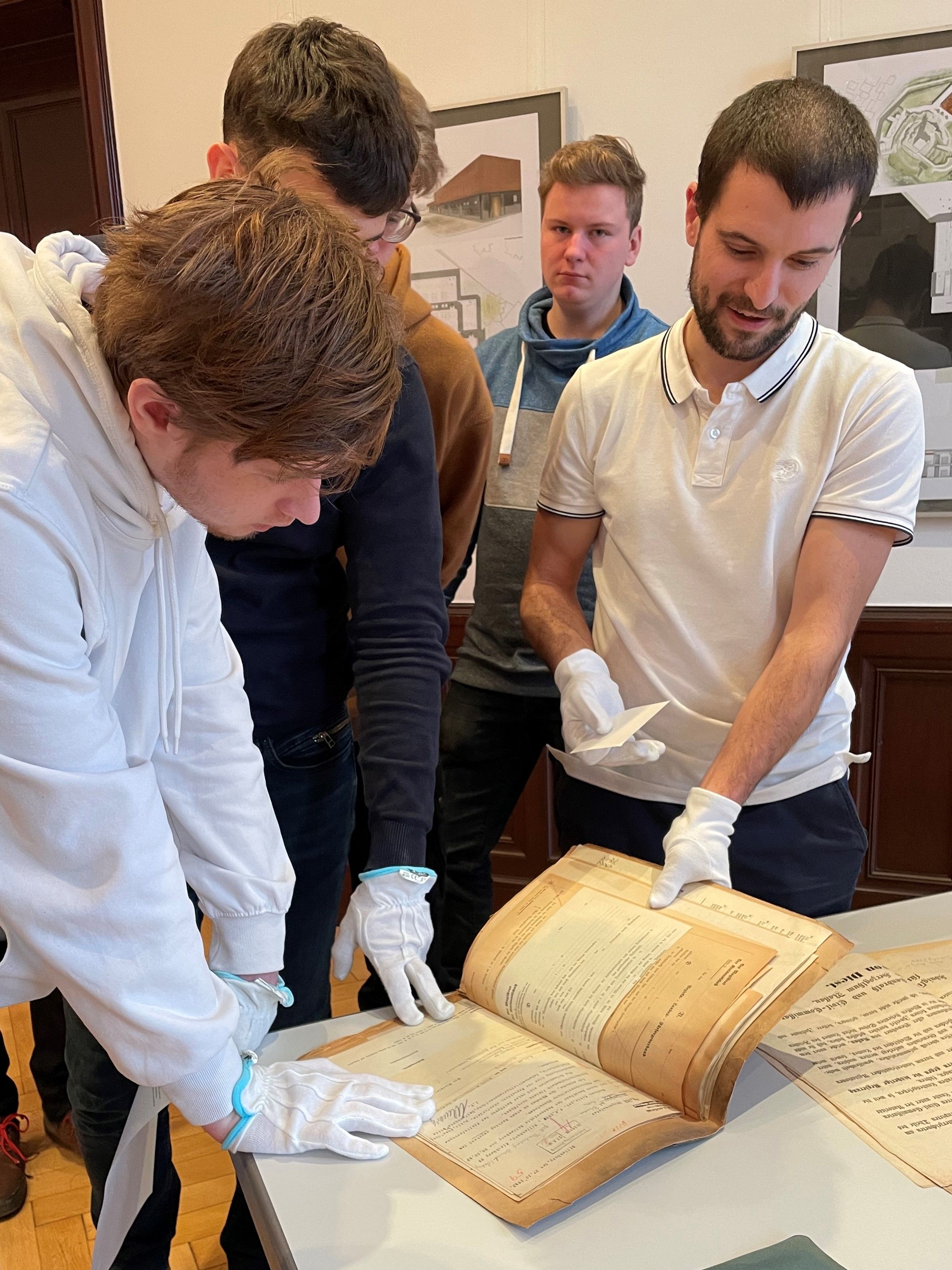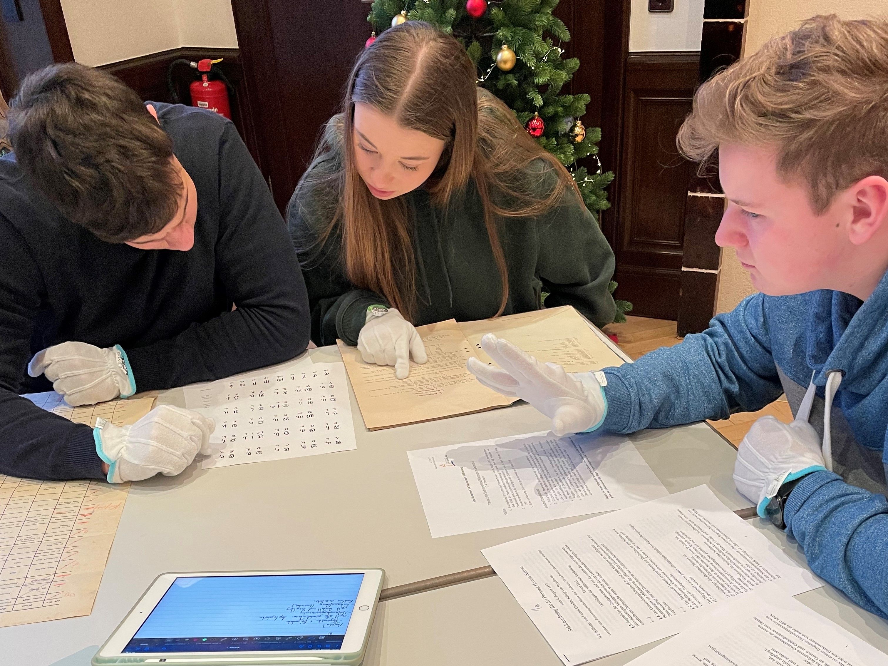 Herr Dietrich hat den Schülerinnen und Schülern einen Einblick in seine Arbeit als Stadthistoriker gegeben, die aus den drei Hauptaufgaben Bewertung/Übernahme von archivwürdigem Schriftgut, dessen Erschließung und schließlich der Sicherung und Bestandserhaltung besteht. All diese Aspekte des Berufs durften die Schülerinnen und Schüler danach vor Ort live sehen und anfassen – natürlich mit Handschuhen, um das teilweise viele hundert Jahre alte Schriftgut nicht zu beschädigen.