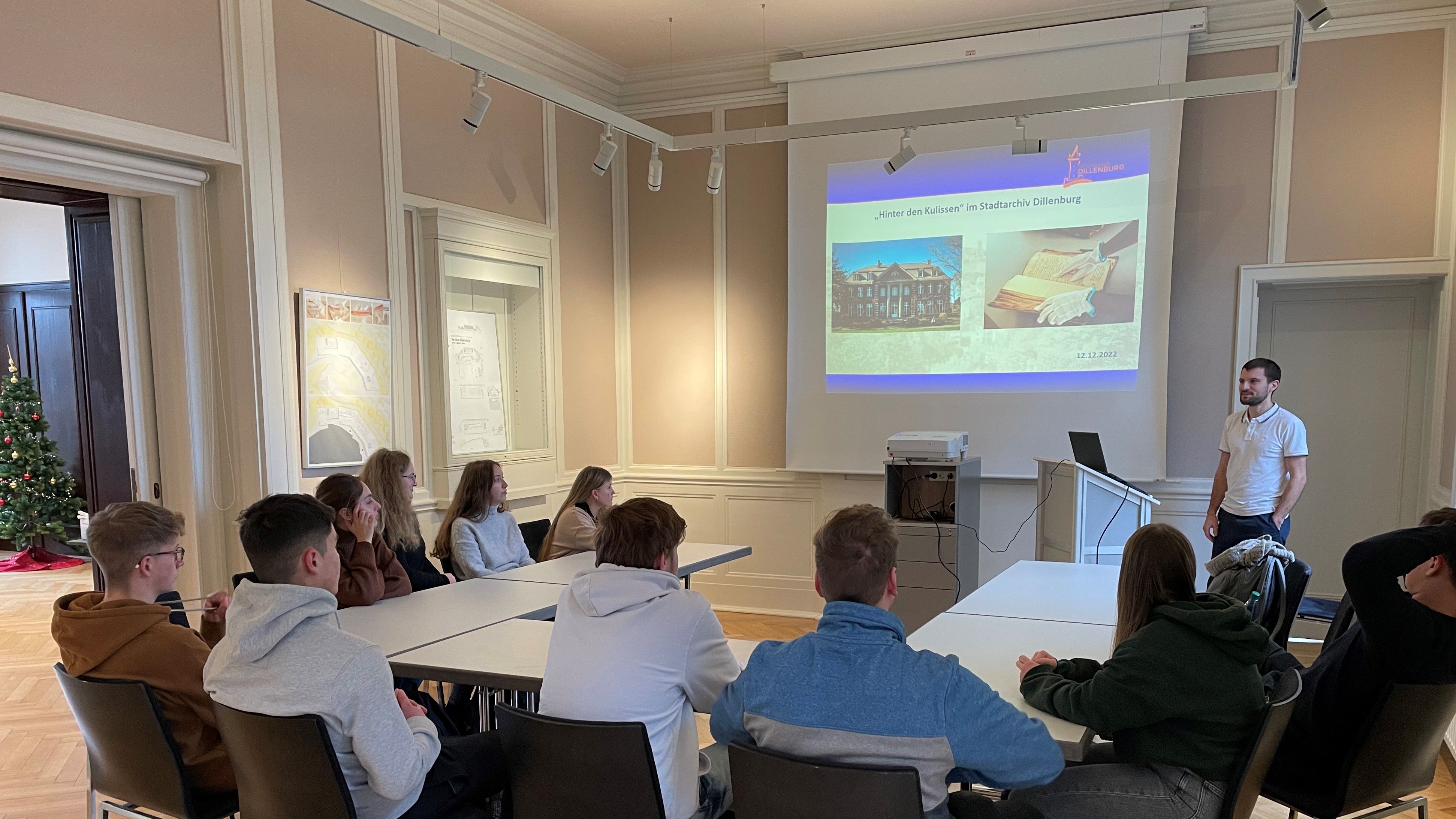 Der Stadthistoriker der Stadt Dillenburg, Herr Simon Dietrich, nahm die Schülerinnen und Schüler des Leistungskurses Geschichte der Jahrgangsstufe Q1 Anfang Dezember mit hinter die Kulissen des Stadtarchivs in der Villa Grün.