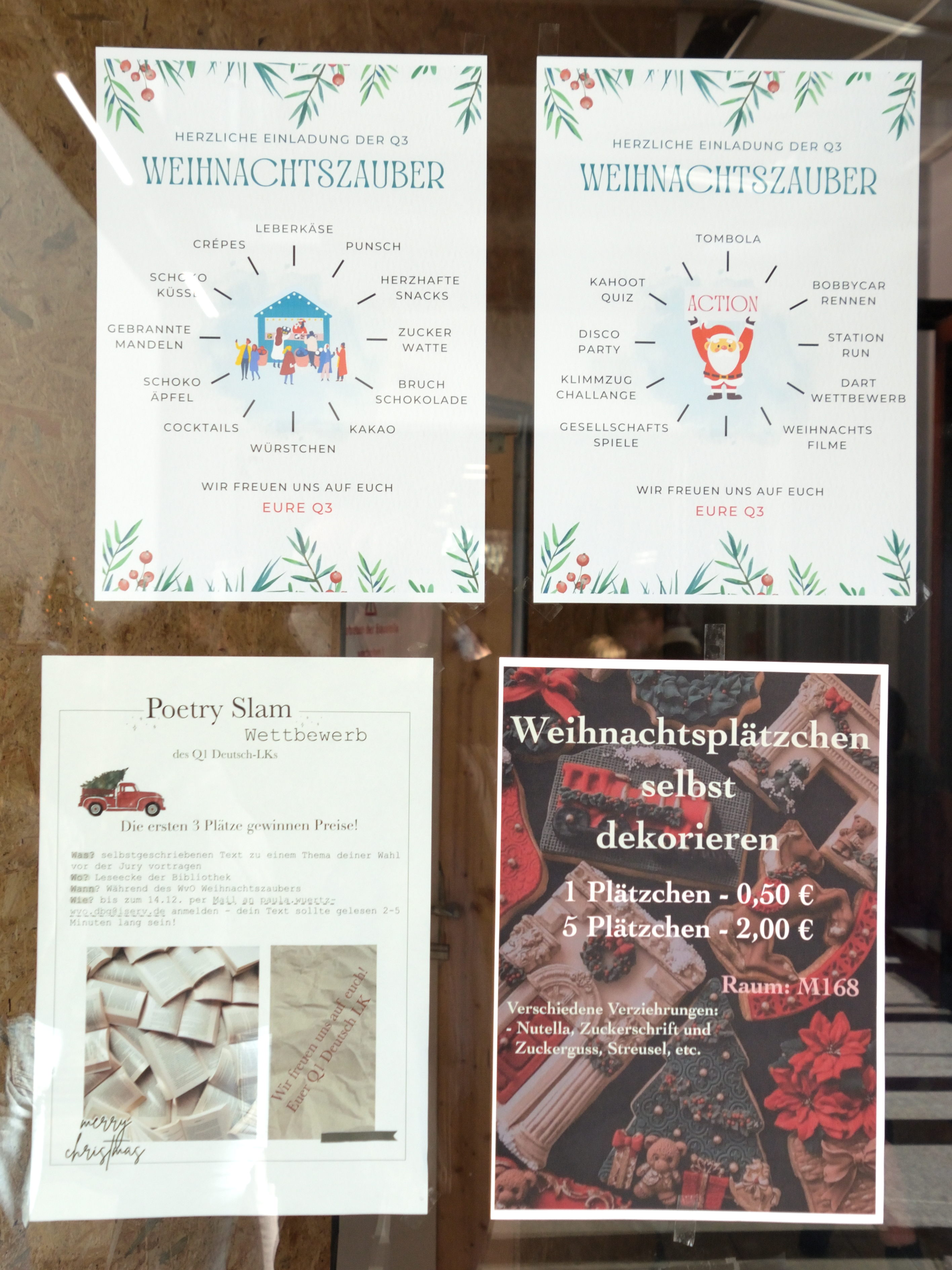 Hierfür wurde die ganze Schule in einen Weihnachtsmarkt verwandelt, mit verschiedenen Ständen und Angeboten, die hauptsächlich von den beiden ältesten Jahrgängen (Q1 und Q3) für die gesamte Schülerschaft angeboten wurden.