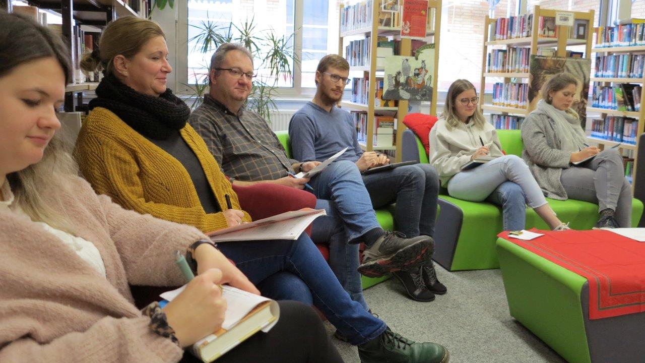 Die Siegerehrung des Vorlesewettbewerbs, mit (von links) Fachbereichsleiter Markus Hoffmann, Felicia Kring, Leonie Adamov, Leonie Lotz, Emma Schmidt, Lynn Waltersbacher, Levi Haus, Wettbewerbskoordinatorin Uta Sippel; vorn Sieger Simon Hennemann