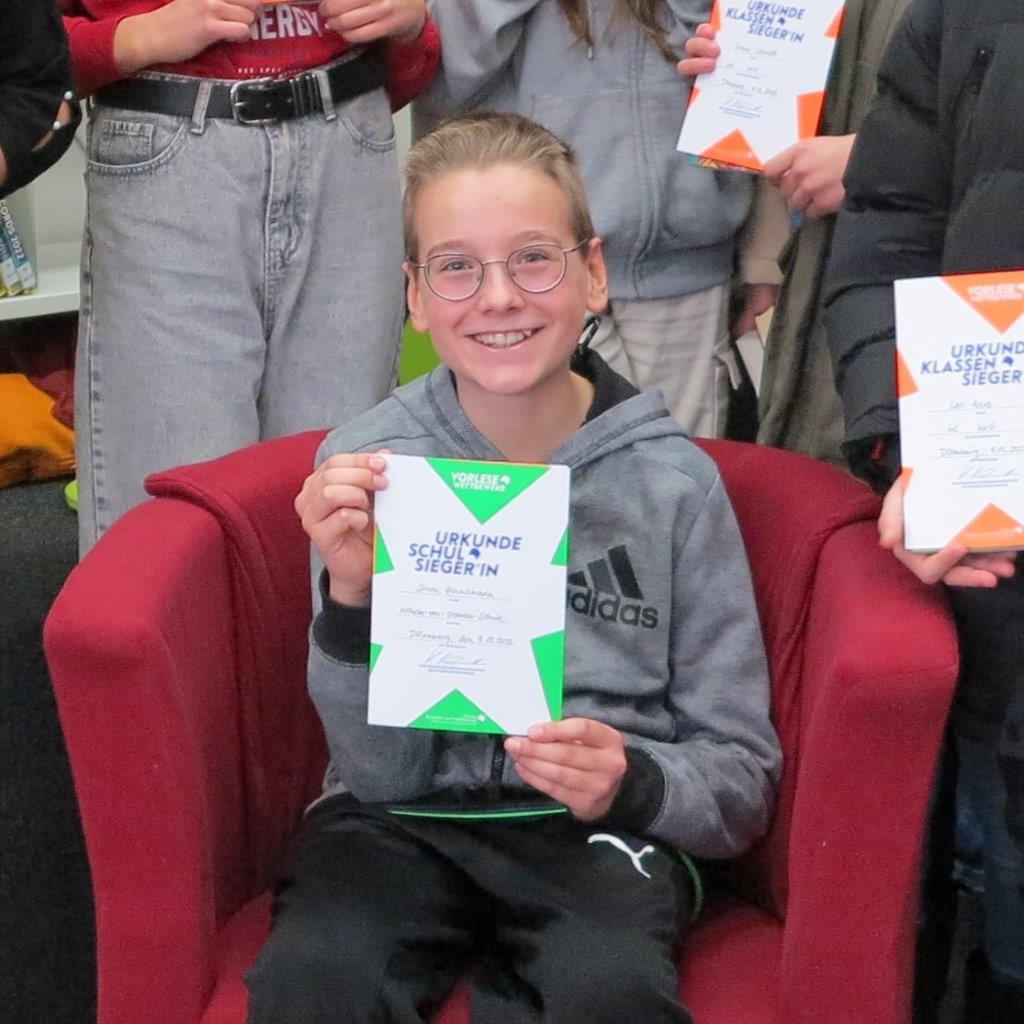 In der Besprechung der Jury wurde Simon Hennemann aus der 6D zum Schulsieger gekürt und bekam anschließend seine Urkunde von Fachbereichsleiter Markus Hoffmann überreicht. Simon überzeugte durch seinen souveränen Lesevortrag und seine lebendige Sprachgestaltung, die alle in ihren Bann gezogen hat. Viel Glück und Erfolg für den Kreisentscheid!