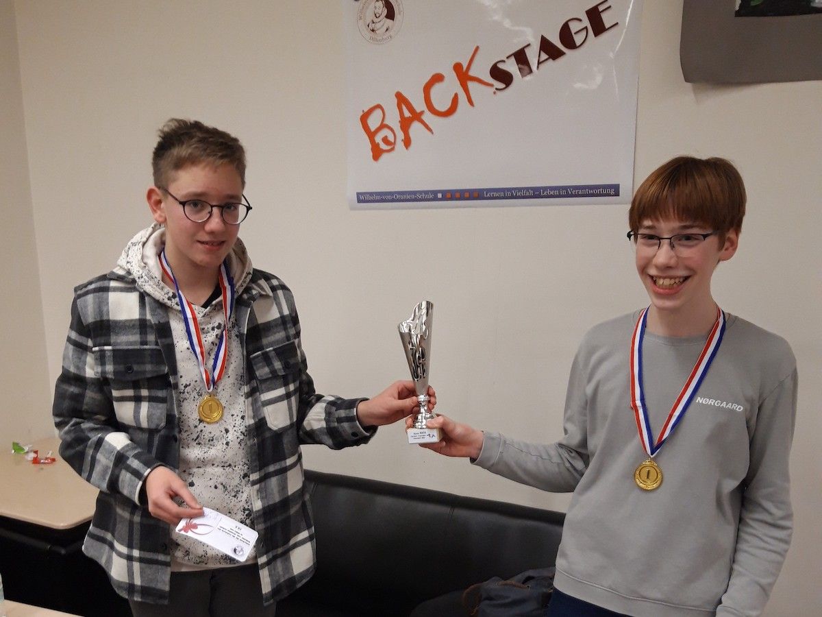 Die Gewinner des Kickerturniers: Joshua Hees und Jonatan Schmidt; auf dem zweiten Platz: Mia Rockensüß und Luisa Ebert; auf dem dritten Platz: Leni Feindler und Zoe Brandenburger (nicht auf dem Bild).