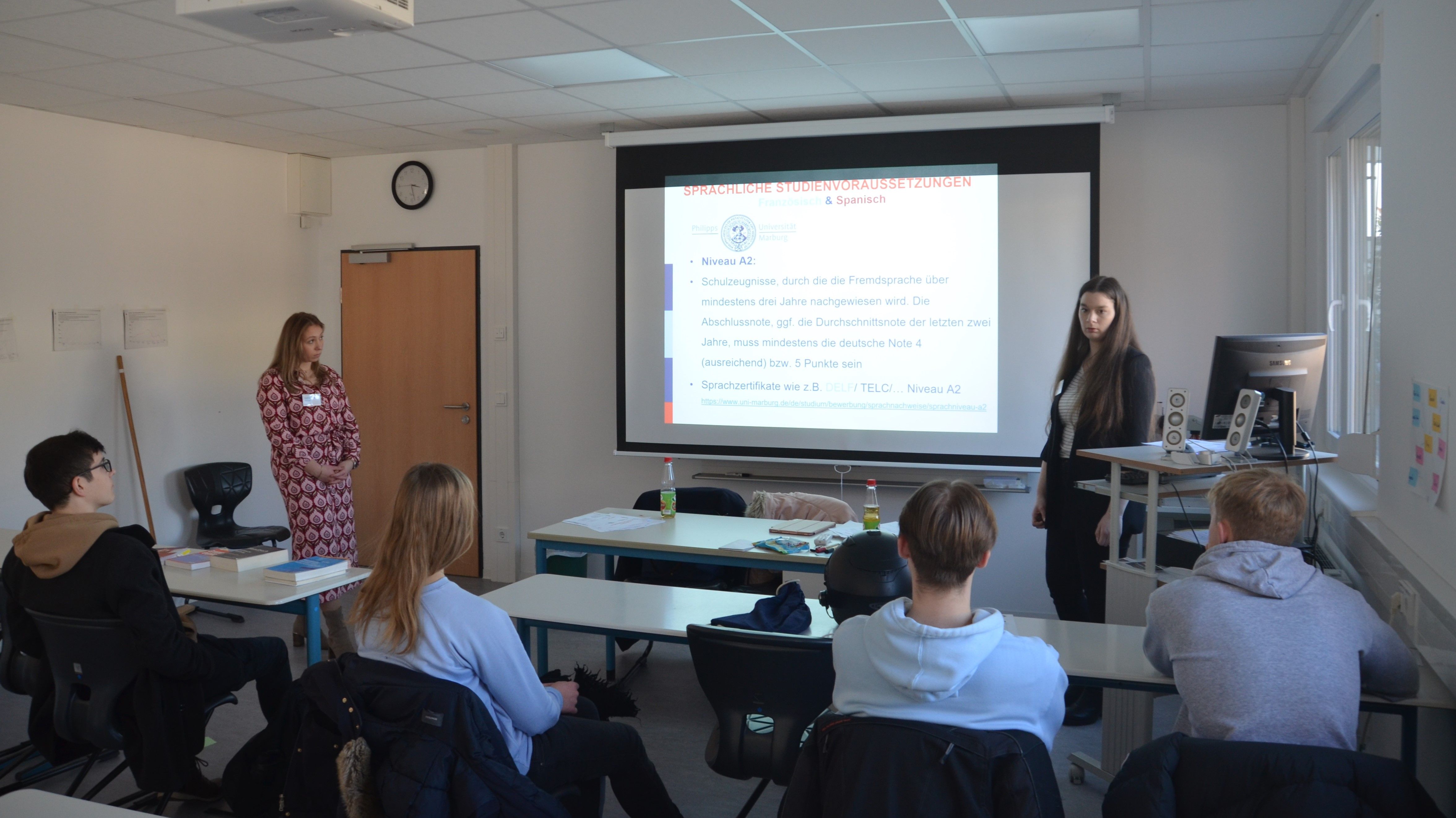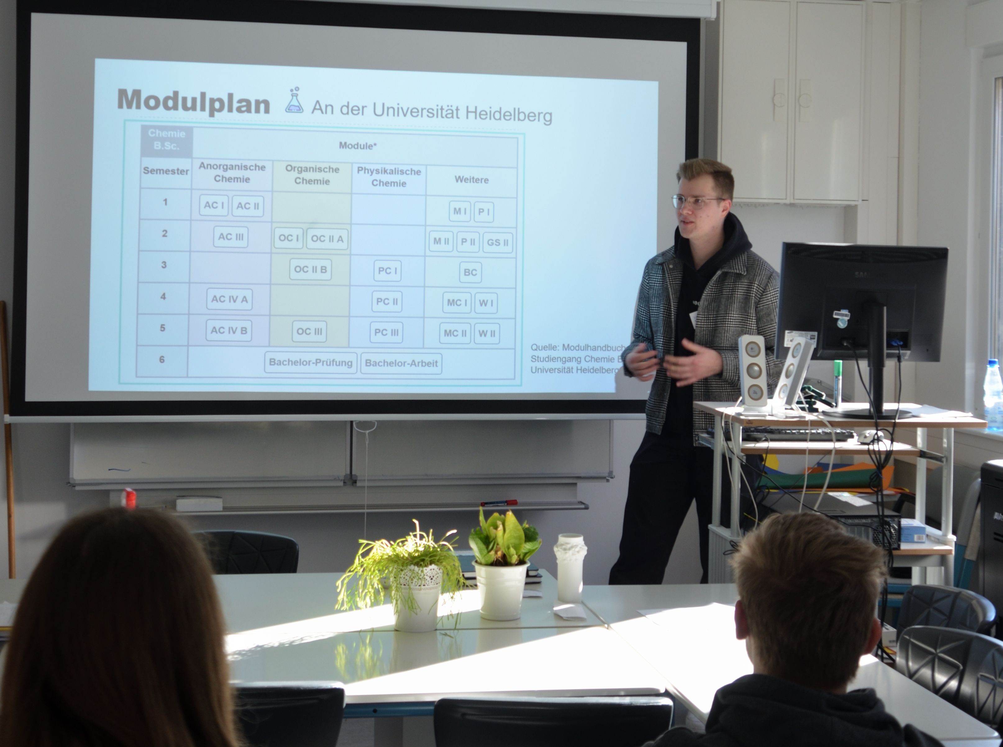 Nach der Begrüßung und einem Impulsvortrag im Plenum, den dieses Jahr Nico Hofeditz gemeinsam mit Tim Düding hält, der im selben Jahr wie er Abitur gemacht hat und nun bei der Herborner Pumpentechnik GmbH & Co KG arbeitet, gehen die Alumni in die einzelnen Räume, um ihren Studiengang oder ihren Ausbildungsberuf vorzustellen. Die Schülerinnen und Schüler der Jahrgangsstufe Q2 haben sich vorher in zwei verschiedene Angebote eingewählt, die sie nacheinander, unterbrochen von einer kleinen Pause, aufsuchen. Die Palette ist breit gefächert: Von A wie Auswärtiges Amt bis Z wie Zentralbankwesen ist für fast alle Interessenten etwas dabei. Nico Hofeditz und Tim Düding stellen den Beruf des Entwicklungsingenieurs vor – und wie man dahin kommt.