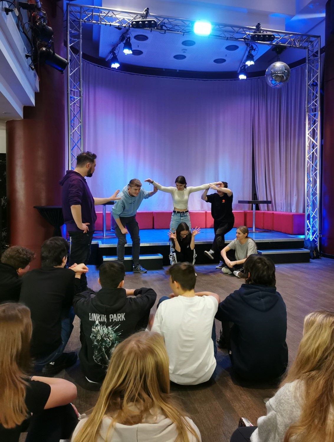 We introduced ourselves with short acting games and then got physically active with warm-up exercises. With short improvisation games like “I am a tree”, where you had to spontaneously create a scene with several people, the theatre pedagogues taught us how to perform on stage. For example, you should never stand on stage with your back to the audience. To help us deal with different roles and learn how to portray various emotions, we played the game "magic car". In this game, one of four people acted out an emotion or emotional state which the others then had to take on as well. It tested our self-confidence because it wasn't easy to present oneself differently in front of the whole class without feeling ridiculous. But because everyone did it, it wasn't embarrassing anymore. At the end of the workshop, we had 30 minutes to create our own short play in small groups.