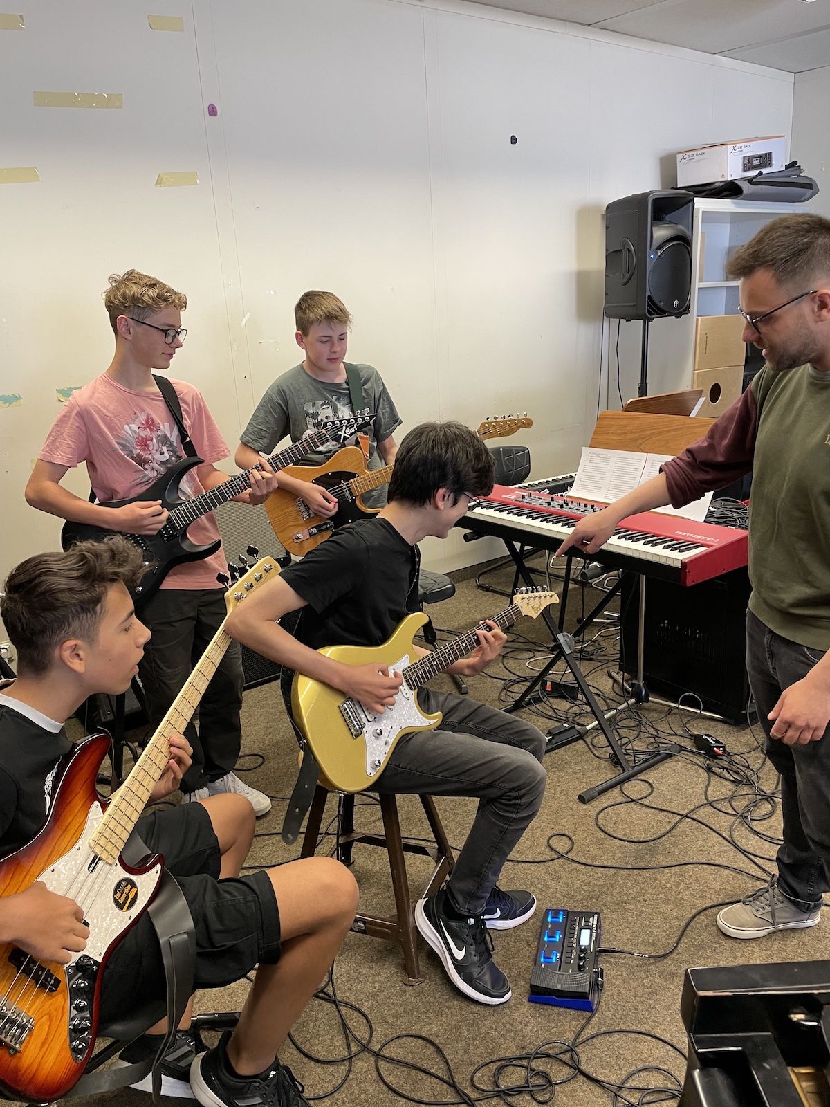 Unterstützung erhielt die Schulband „Brave Generation“ an diesem Tag durch vier Coaches der Noise Academy Wetzlar, welche in kleinen Teams an den Drums, Keyboards und Sounds, Gitarren und Bass sowie den Vocals arbeiteten. Nachdem die Band zwei ihrer Songs für einen ersten Eindruck präsentiert hatte, begaben sich die Gruppen an die Arbeit an den Songs Final Countdown, Without You und dem eigenen Song Brave Generation. Die Ergebnisse wurden im Anschluss dann wieder zusammengefügt und man konnte bereits eine deutliche Steigerung hören!