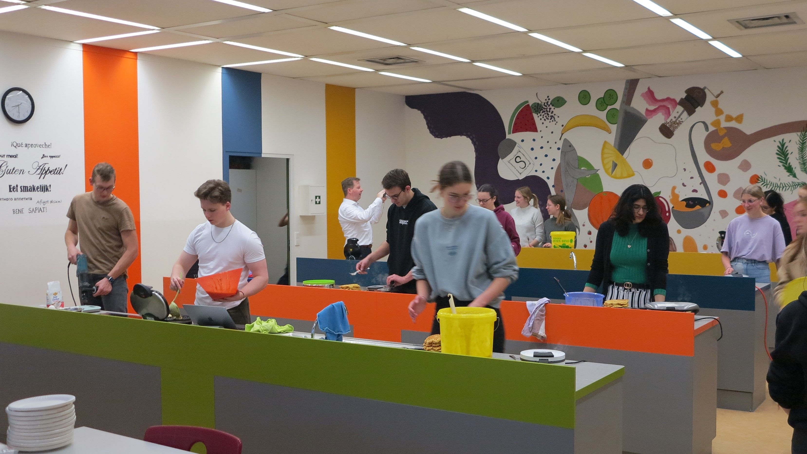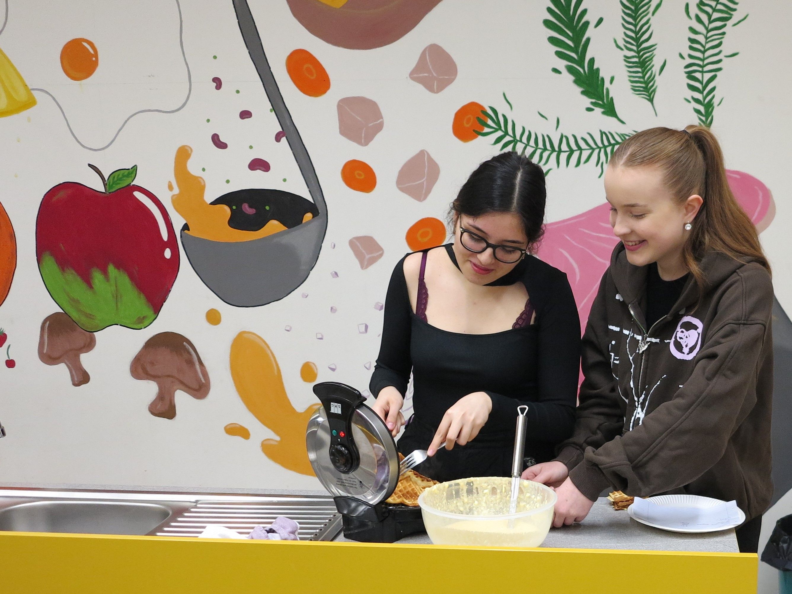 Die Schulküche glich dabei oft eher einem Strandrestaurant in der besten Urlaubszeit, innerhalb von vier Stunden wurden etwa 1.000 Waffeln von den fleißigen Waffelbäckerinnen und -bäckern produziert und der Andrang schien bis zum Schluss kein Ende zu nehmen. Eine Freude für viele Kinder war überdies das Angebot des Waffelpakets, bei dem interessierte Lehrkräfte 30 Waffeln für ihre Klassen bestellen konnten, welche dann sogar in die jeweiligen Klassen geliefert wurden.