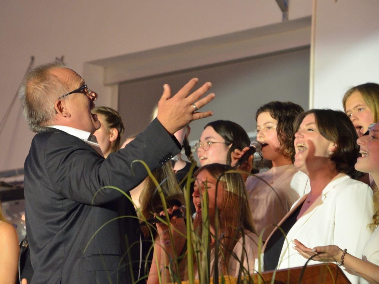 Das letzte Viertel des Konzertabends gehörte dem Schulchor unter Leitung von Armin Müller. Vermutlich niemand habe damit gerechnet, so der Oberstudienrat bei seinem letzten Konzert als WvO-Musiklehrer, dass nach der Corona-Zwangspause binnen kurzer Probenzeit wieder ein so kräftiger Chor von fast 30 Sängerinnen und Sängern zusammenkommen würde. Die Freude darüber war dem „WvO-Showman“ – Zitat von Fachsprecher und Moderator Ulrich Kögel – deutlich anzusehen. Aus dem Musicalfilm „Greatest Showman“ stammte denn auch eines der Lieder („From now on“), welches der von Armin Müller und Johanna Klöpper gemeinsam trainierte Chor mit strahlenden Gesichtern vortrug. Aber alle, die ihn kennen, wussten: Ohne das Gospel-Genre wäre Müllers Abschied musikalisch und inhaltlich nicht komplett gewesen. So endete der Abend mit „God is good“ und mit „Freedom is coming“, dem eisernen Repertoire des WvO-Chors. Beim letzten Song reihten sich zahlreiche ehemalige Schülerinnen und Schüler sowie die Familie des Breitscheiders in die Riege der Sängerinnen und Sänger ein, sodass der Abend in einem zwar etwas wehmütigen, aber doch auch fröhlich-familiären Finale gipfelte.