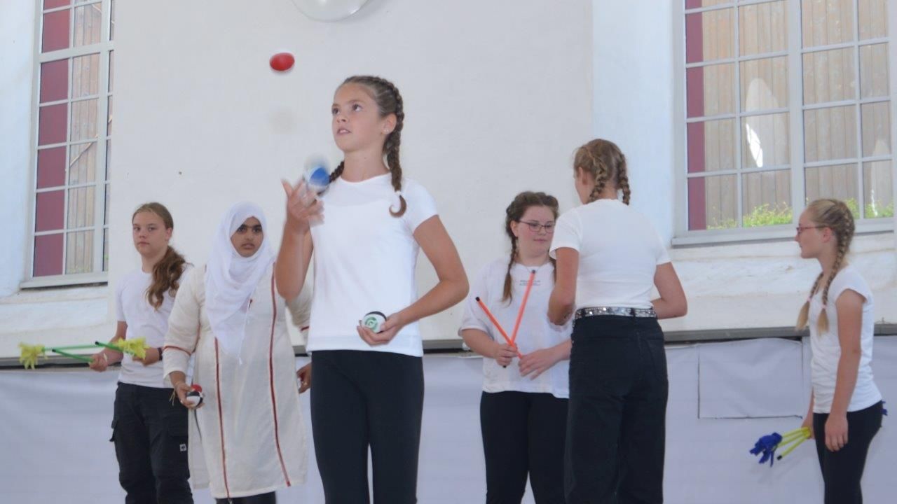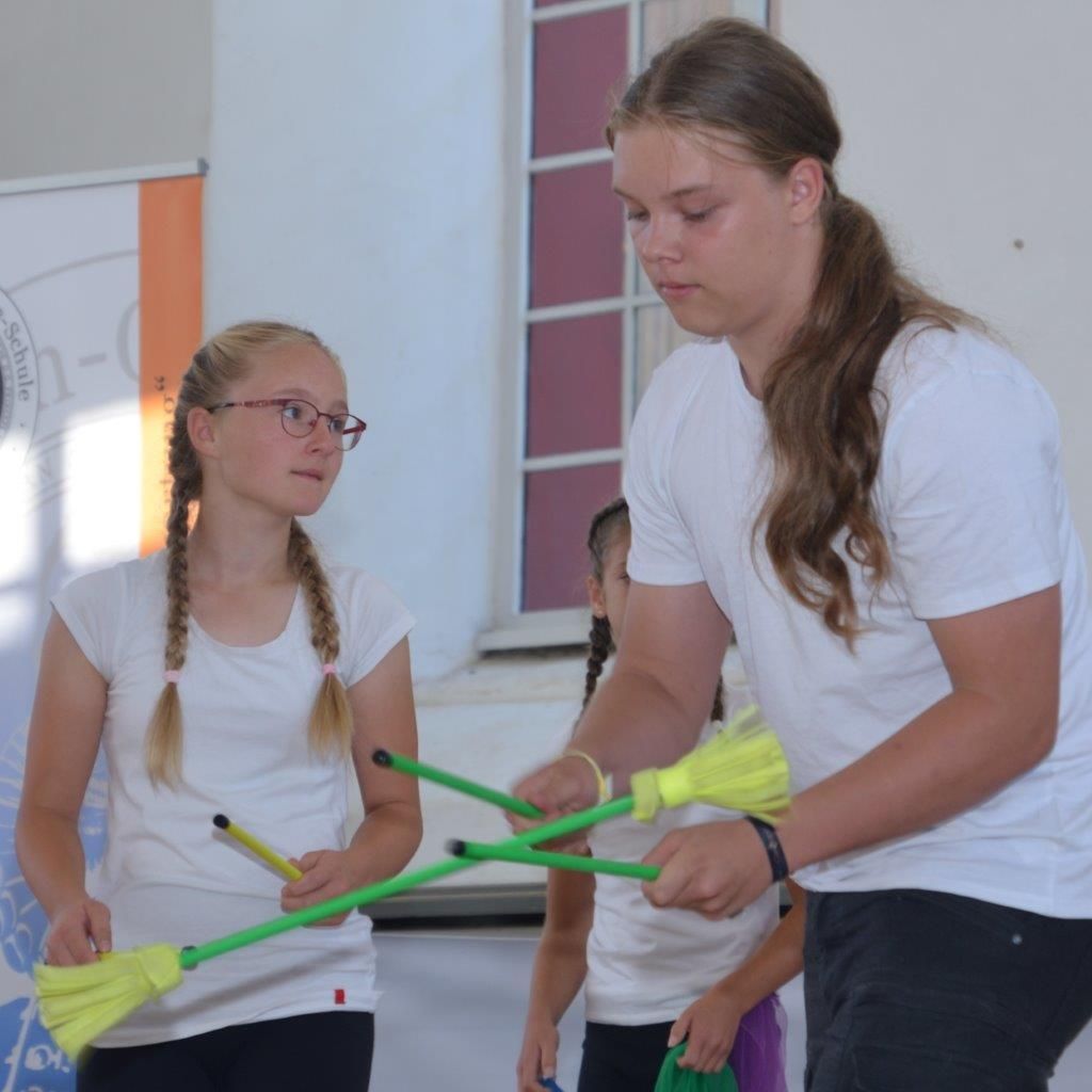 An einem strahlenden Sonnentag betraten die neuen Gymnasiasten mit ihren Eltern über den extra ausgerollten roten Teppich das angenehm kühle Reithaus und wurden dort vom Unterstufenchor (Leitung: Ulrich Kögel) mit „Applaus, Applaus“ von den „Sportfreunden Stiller“ sowie einer Darbietung der Jonglage-AG (Leitung Dr. Sebastian Jakobi) in Empfang genommen.