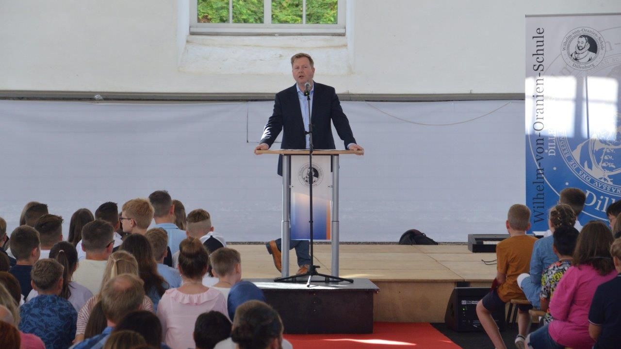 152 Schülerinnen und Schüler bilden die sechs neuen Einstiegsklassen am Dillenburger Gymnasium. Am zweiten Tag des Schuljahres begrüßte Oberstudiendirektor Martin Hinterlang und sein Team die Kinder und deren Eltern im Reithaus des benachbarten Hessischen Landgestüts. Anschließend ging es in die Unterrichtsräume im Schulgebäude.