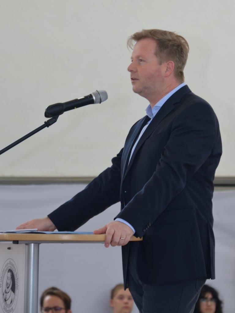 In seiner Begrüßungsrede bezog sich Schulleiter Martin Hinterlang zunächst auf das Schulmotto „Lernen in Vielfalt – Leben in Verantwortung“, um dann ein Zitat des persischen Dichter Saadi in den Mittelpunkt seiner Ausführungen zu stellen: „Alles ist schwierig, bevor es leicht wird.“ Diese zunächst ebenso paradox wie banal anmutende Erkenntnis illustrierte Hinterlang den neuen Sextanern am Bergsteigen: „Wenn wir vor einem großen Berg stehen, sieht sein Gipfel fast unerreichbar aus. Ohne Anstrengung schaffen wir es nicht. Erst ganz oben am Ziel merke ich, dass es gar nicht so schwer war und ich mich leicht fühle, weil mein Erfolg mich begeistert.“ Mit diesem eindrücklichen Bild lud Hinterlang die Schülerinnen und Schüler ein, keine Angst vor den anstehenden Herausforderungen zu haben, sondern sich auf deren erfolgreiche Bewältigung zu freuen.