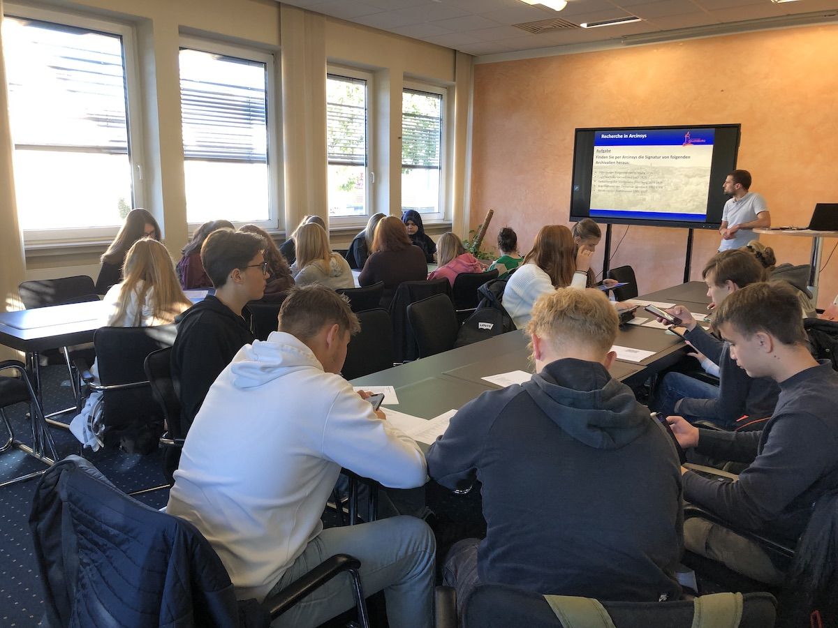 Gruppenfoto im Gruppenraum: Eigenständige Signaturrecherche über das Online-Archivinformationssystem Arcinsys, in dem seit Sommer 2023 die Bestände des Dillenburger Stadtarchivs zu finden sind.