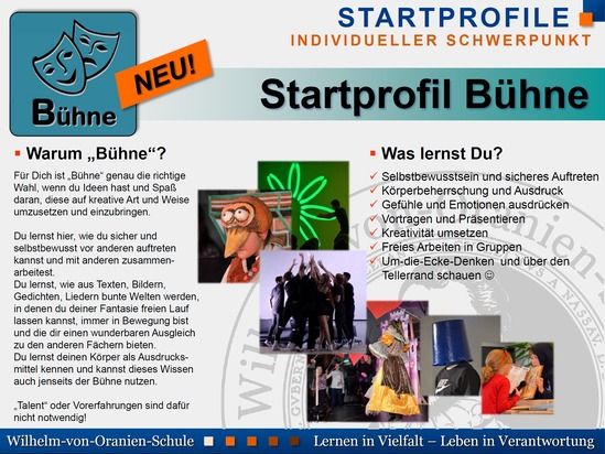 Bereits seit über zehn Jahren können die Grundschüler ein Startprofil wählen, wenn Sie an die WVO wechseln: „Amadeus“ (musikalischer Schwerpunkt), „Bewegung“ (Sport), „Creativ“ (Basteln, Werken, Kochen) und „Dynamo“ (Forschen und Experimentieren) sind bewährte und beliebte Angebote. Das bisherige Startprofil „English“ wird nun ab 2024/25 durch das Startprofil „Bühne“ ersetzt. Das neue Startprofil soll, soll Fachsprecher Darstellendes Spiel Daniel Eisert, „die sprachliche Kreativität, körperliche Ausdrucksfähigkeit und das Selbstbewusstsein im Auftreten mit anregenden Spielszenen und kleineren Theaterdarbietungen fördern“. Auch die Schulleitung ist überzeugt, damit ein weiteres attraktives Angebot für die Kinder zu machen, in welchem abseits der traditionellen Fächer mit Freude und ohne Notendruck persönliche Entfaltungsmöglichkeiten geboten werden.