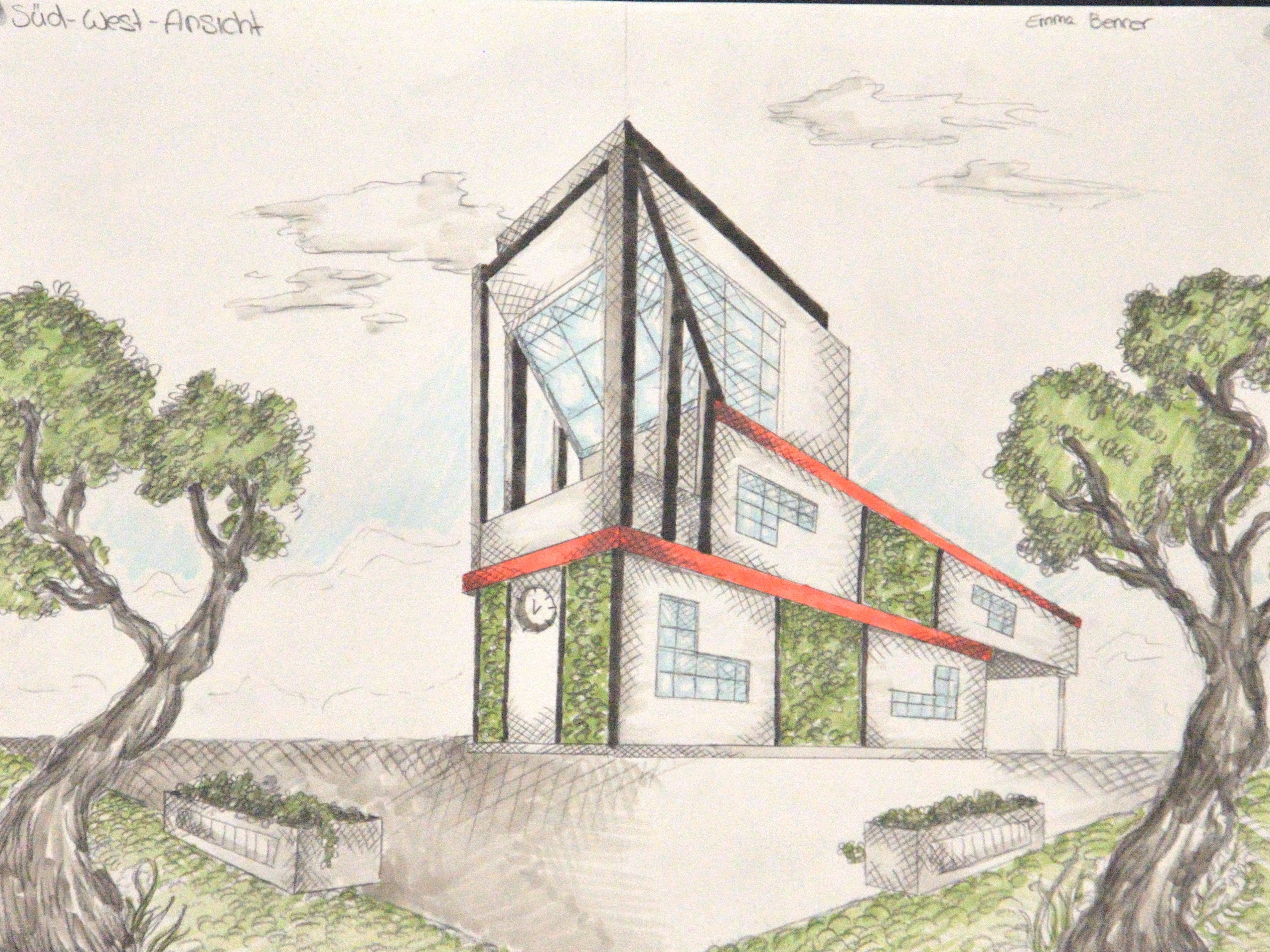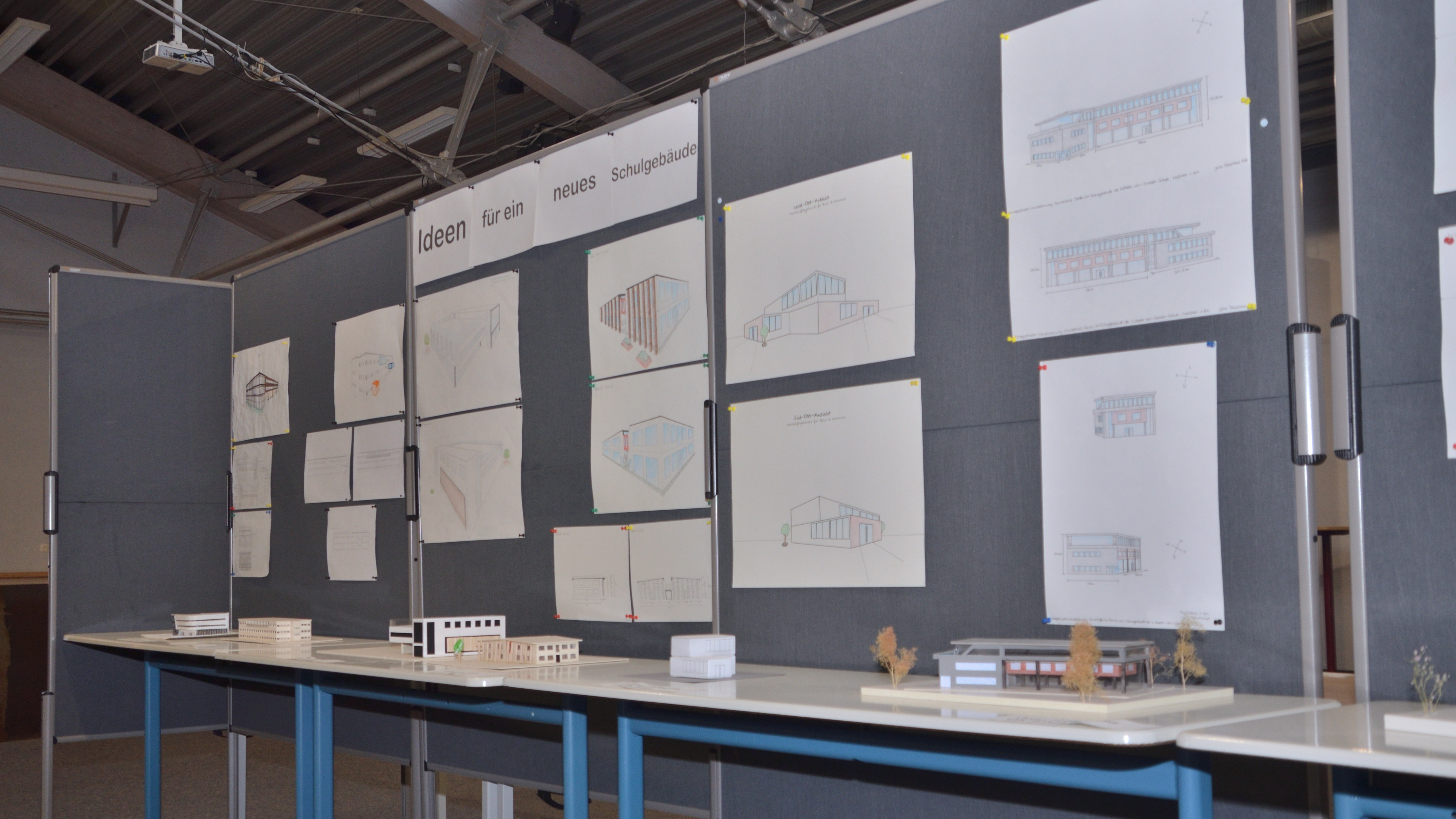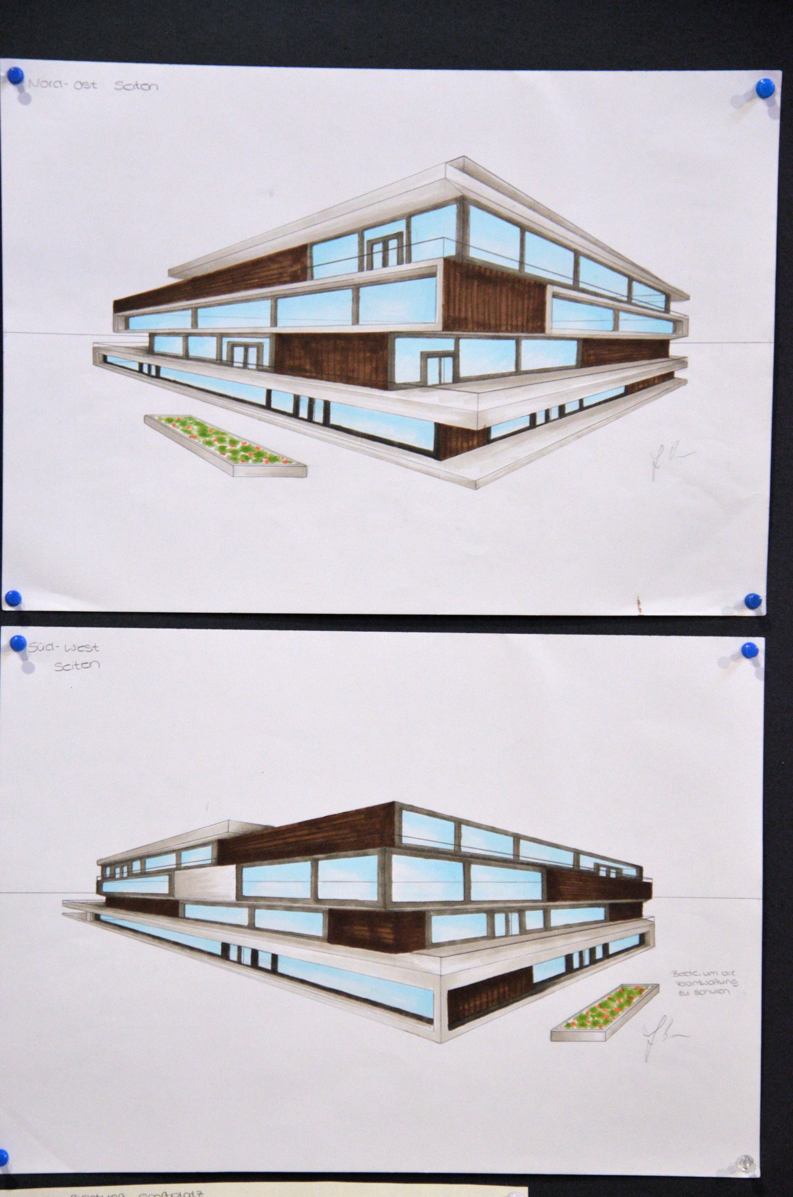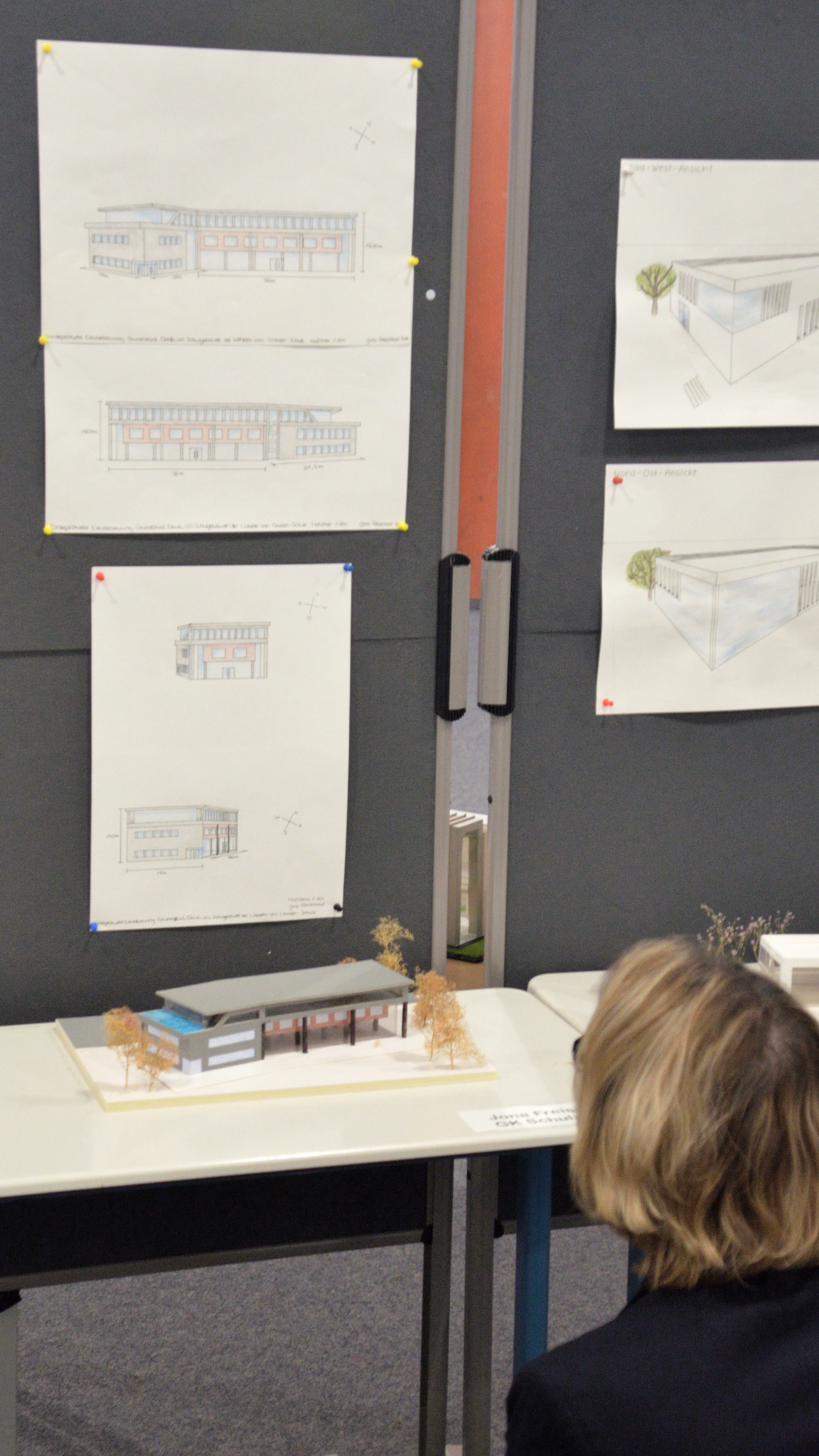 Im Forum der Schule wurden die Kunstwerke über mehrere Wochen der Schulöffentlichkeit zur Ansicht ausgestellt. Anfang Februar nahmen sich außerdem die Schulleitungsmitglieder Martin Hinterlang, Andrea Stühler, Stefan Riemer und Markus Hoffmann Zeit, die Entwürfe genauer zu sichten und sich vom hauseigenen Architekturnachwuchs erklären zu lassen. Die Pläne und Modelle waren mal sehr fantasievoll, mal sehr nüchtern und realistisch, aber allesamt durchdacht und faszinierend abwechslungsreich gestaltet. Es zeichnete sich aber ab, dass es ein gewisses Grundbedürfnis der Schülerinnen und Schüler gibt, genügend „Frei“-Raum zur Erholung und Interaktion zur Verfügung zu haben. Zahlreiche Entwürfe warteten mit einem Pool oder begrünten Dachterrassen auf.
