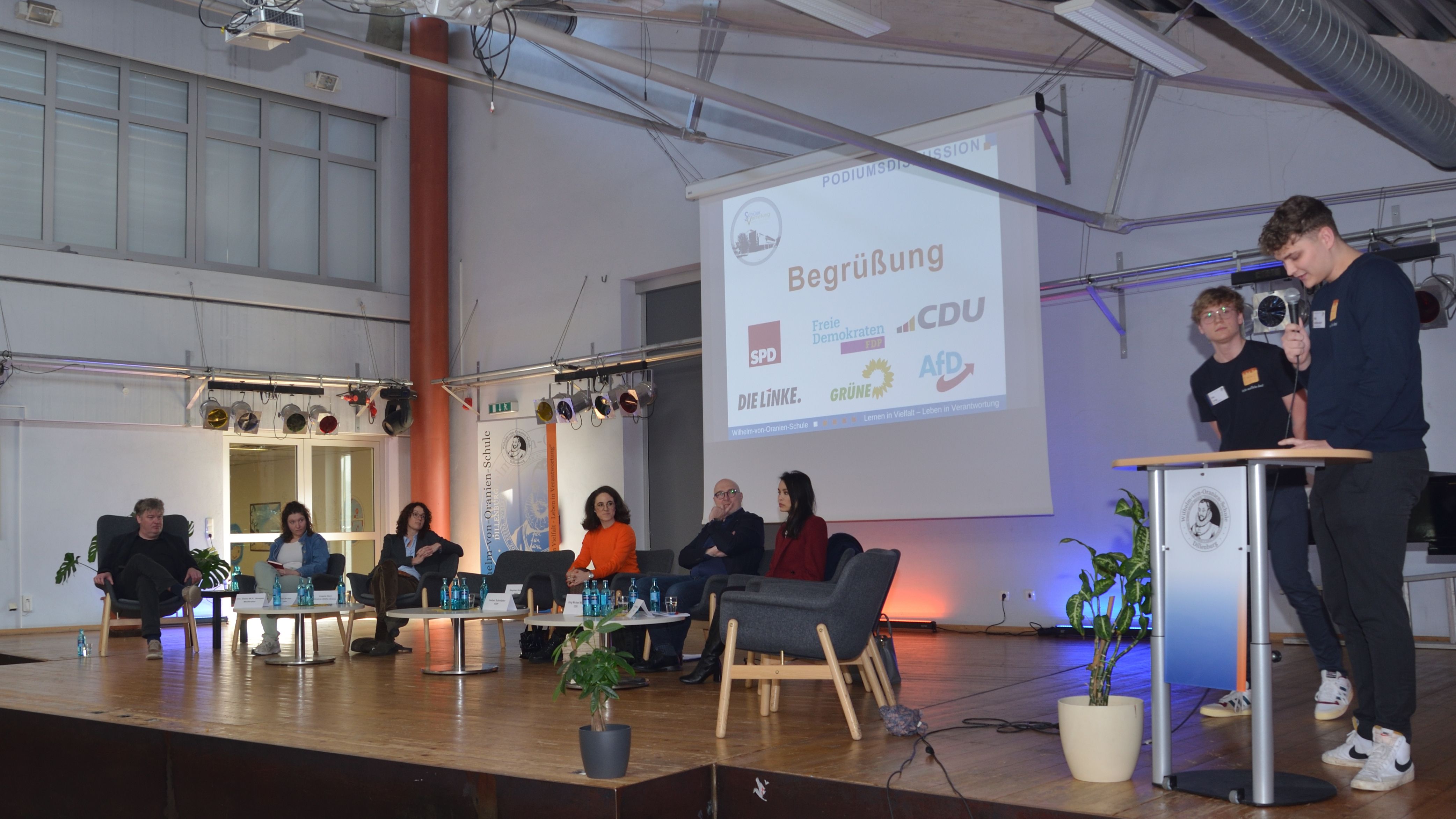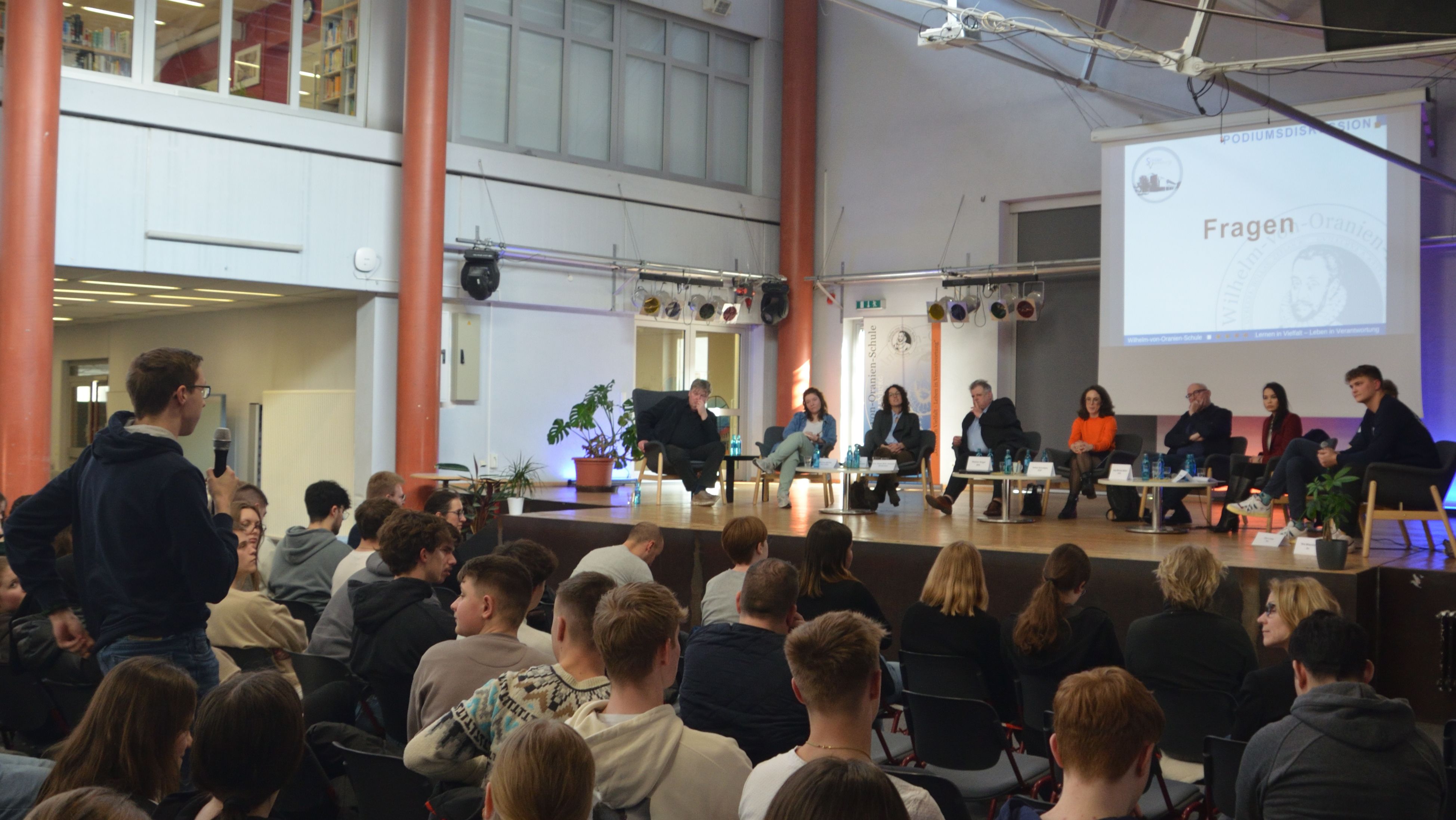 Am Mittwoch, dem 6. März, erfüllte eine aufgeregte Atmosphäre die Flure der Wilhelm-von-Oranien-Schule (WvO), als die Schülerinnen und Schüler der Einführungs- und Qualifikationsphase gespannt darauf warteten, was sie bei der bevorstehenden Podiumsdiskussion erwartet. Pünktlich zur achten Stunde versammelten sie sich erwartungsvoll im Forum, um die Politiker zu begrüßen.