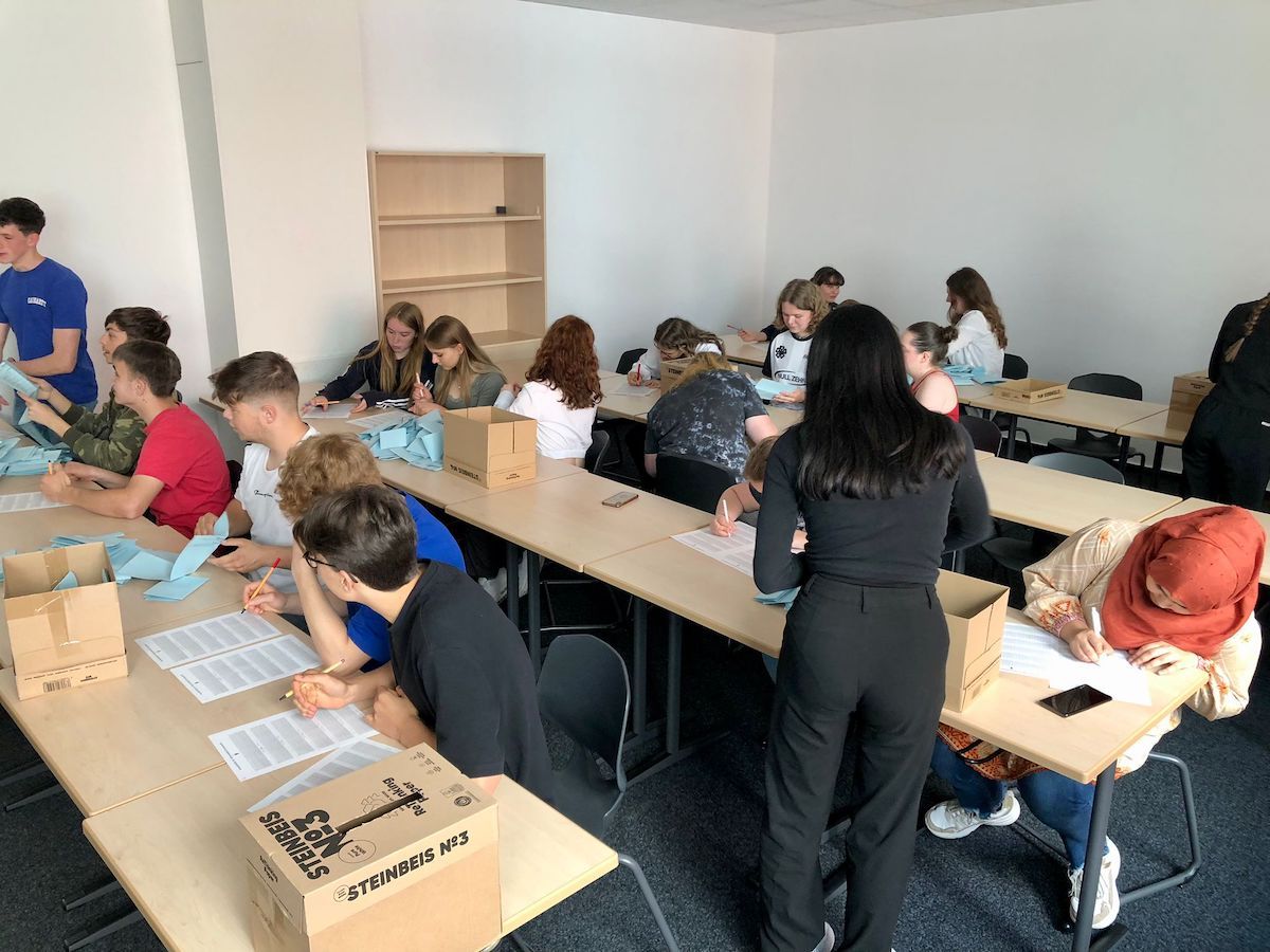 Vor dem eigentlichen Wahlakt fand im Politik- und Wirtschaftsunterricht eine intensive Auseinandersetzung mit dem Wahlprozess statt: Wie wird gewählt, wer darf wählen, was wird gewählt und vor allem: Warum ist es wichtig, wählen zu gehen? Anschließend setzten sich die Jugendlichen ausführlich mit den einzelnen Parteien und ihren Spitzenkandidaten auseinander, um eine fundierte persönliche Wahlentscheidung treffen zu können. In der Woche vor der Europawahl war es endlich so weit, denn die Schülerinnen und Schüler konnten ihre Stimme im Schulwahllokal abgeben. Die Wahl wurde von den Lehrkräften Felix Pinter und Nida Aydin organisiert. Die Stimmzettel wurden von der Klasse E2A unter der Leitung von Kati Weigel und Felix Pinter ausgewertet.
