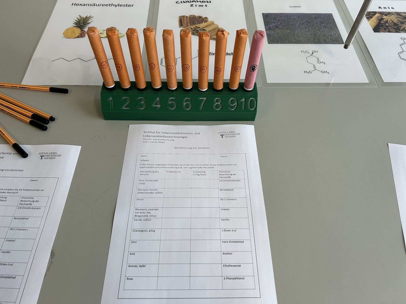 Nach einer Begrüßung und einem einführenden Vortrag zum Thema „Geschmack und Geruch“ durch Herrn Prof. Zorn durften wir unter Anleitung von Herrn Dr. Fraatz und vier Mitarbeiterinnen und Mitarbeitern des Instituts verschiedene Versuche durchführen.