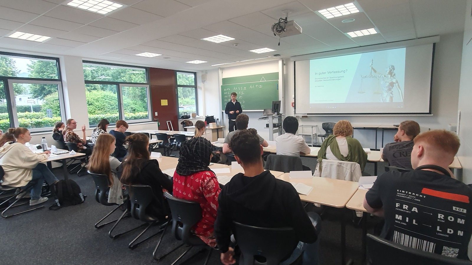 Am 21. Juni besuchte Jan Hasenkrug, Bachelor der Politikwissenschaften und momentan Student an der juristischen Fakultät der Universität Münster, seine ehemalige Wirkungsstätte, um sein Wissen an Schülerinnen und Schüler der Jahrgangsstufen 10 bis Q4 weiterzugeben, die an der von Jan Harms geleiteten Begabtenförderung teilnehmen.