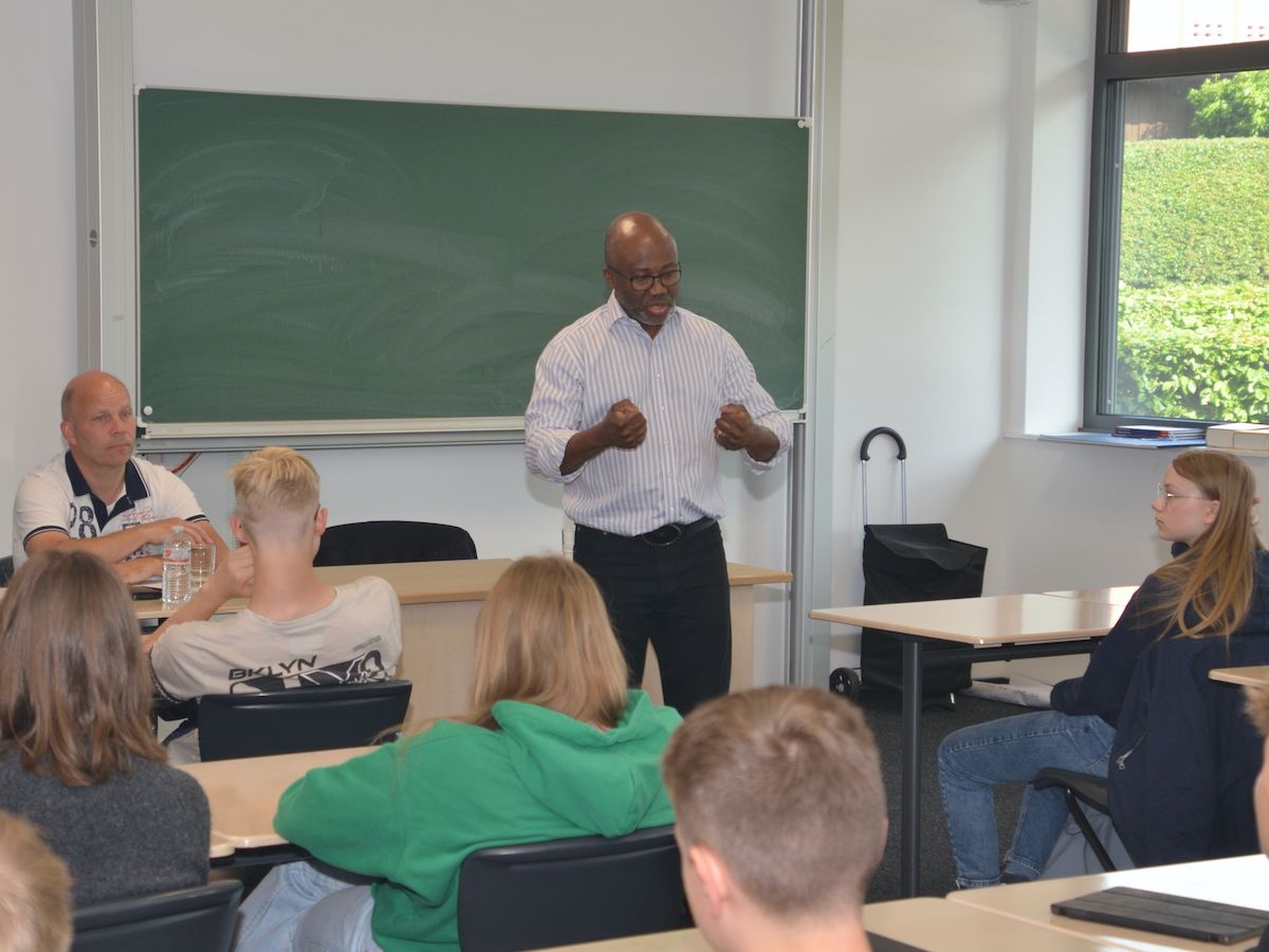Zu Beginn der Doppelstunde, an welcher die Kurse der Lehrer Nico Hartung, Kerstin Renkhoff und Julia Silbermann teilnahmen, erzählte Dr. Ondo-Meva aus seiner spannenden Biografie. Er stammt aus einer angesehenen Familie in Kamerun, sein Vater war dort stellvertretender Kultusminister und international in UNO-Gremien mit dem Thema Bildung befasst. Als junger Mann kam Ondo-Meva nach Europa, zunächst nach Paris, und dies sei für ihn schon ein gravierender Einschnitt gewesen. „Überall Marmor“, erinnert sich Ondo-Meva, „wohin man auch schaute – das war in meiner Heimat anders.“ Aber die optischen Unterschiede und kulturellen Eigenarten traten rasch in den Hintergrund, als er bemerkte, dass er in Europa und dann speziell in Deutschland – er studierte in Marburg und Hannover – immer wieder mit merkwürdigen Nachfragen oder unbegründeter Skepsis gegenüber seiner Person konfrontiert wurde. Warum wurde er bei Auslandsreisen an der Grenze so viel intensiver kontrolliert als andere Reisende? Und dann auch noch von ein und demselben Zollbeamten, der ihn sowohl bei der Hinreise wie auch bei der Rückreise herauswinkte und filzte? Warum wurde er, als er seine Bewerbungsunterlagen einreichte, von der Sekretärin penetrant ausgefragt, ob er das alles wirklich selbst geschrieben habe? Warum wurden er und seine Familienangehörigen am Bahnhof von der Polizei um ihre Ausweise gebeten und warum gab es ungläubige Nachfragen, ob sie wirklich alle promovierte Akademiker seien, wie den Unterlagen zu entnehmen war? Kurzum – alle diese Erlebnisse zeigten ihm damals und nun in der Doppelstunde den Schülerinnen und Schülern, wie sehr doch ausschließlich eine dunkle Hautfarbe für Vorurteile beim Gegenüber sorgen kann. Er selbst, so Ondo-Meva, habe gelernt, mit diesen Ungerechtigkeiten umzugehen, aber am schlimmsten sei es für ihn, wenn seine Kinder oder seine Frau damit im Alltag konfrontiert würden und er dann nicht unmittelbar eingreifen könne, weil er nicht dabei sei. Dr. Ondo-Meva appellierte an seine Zuhörer: „Die Sprache ist die schärfste Waffe des Menschen! Bestimmte Worte können sehr verletzen. Deshalb muss man sich gut überlegen, wie man mit seinem Gegenüber spricht.“ Empathie und Reflexion, so die Botschaft des Erlebnisberichts, sind daher unabdingbar, um alltagsrassistische Situationen zu vermeiden.