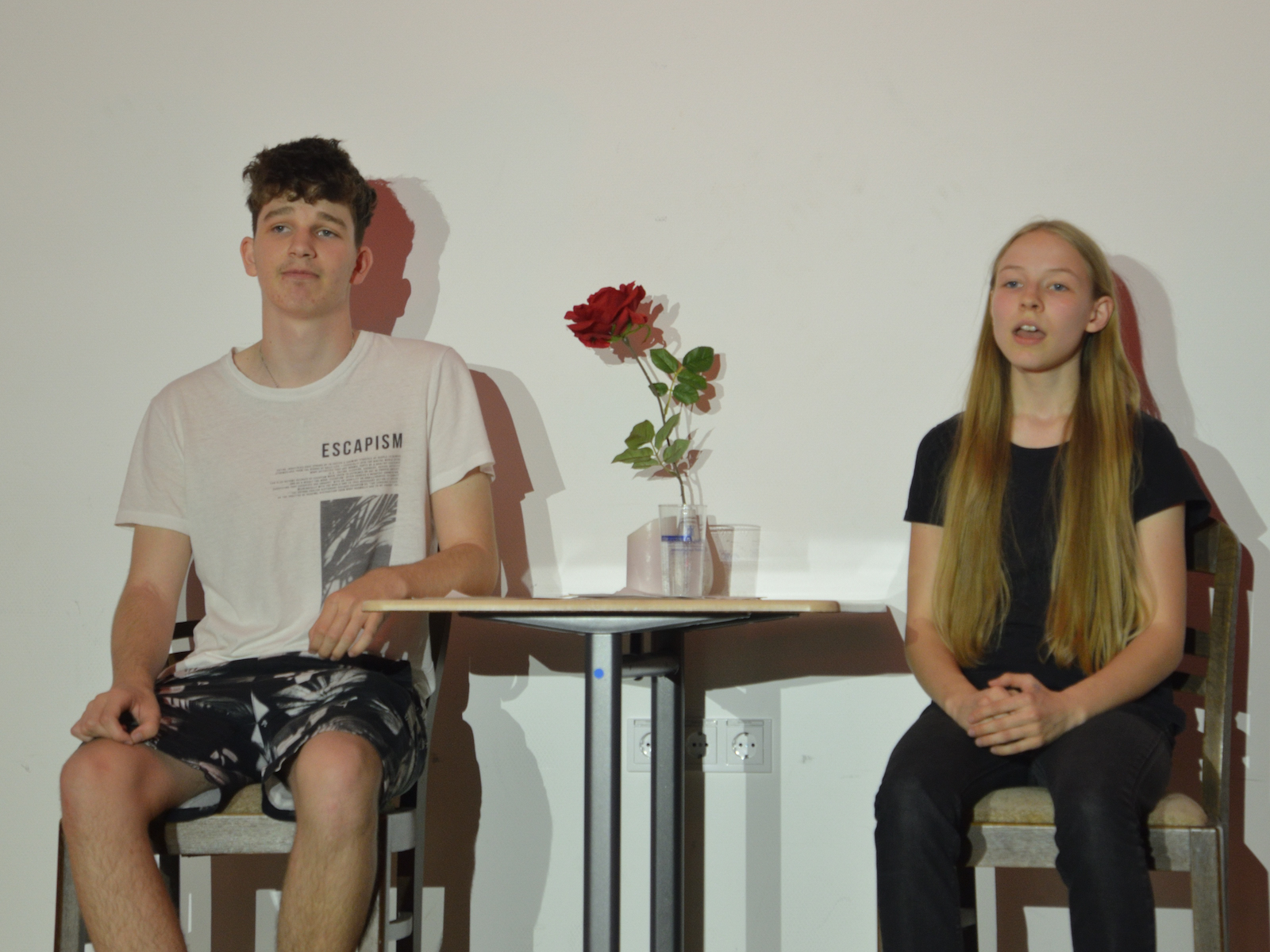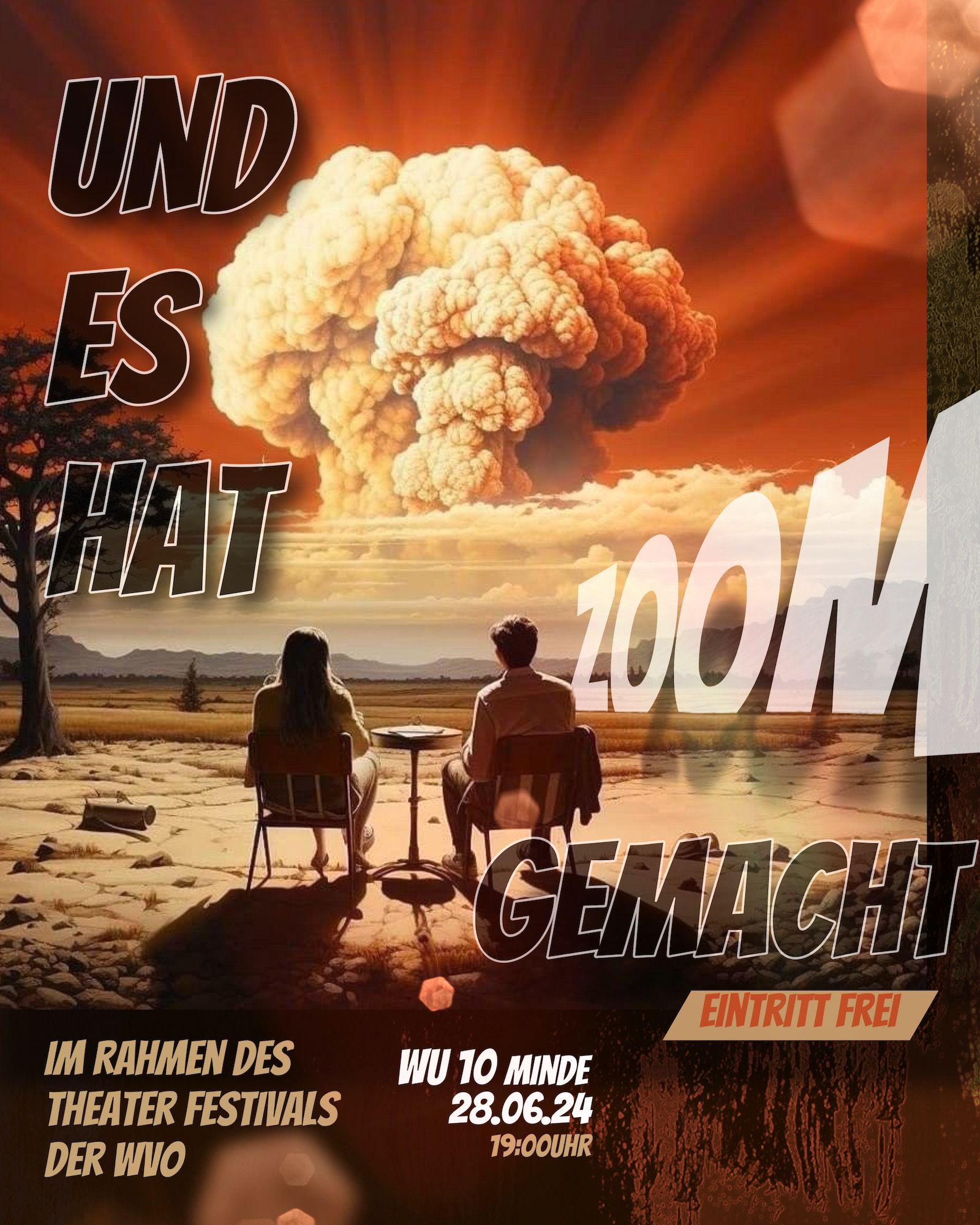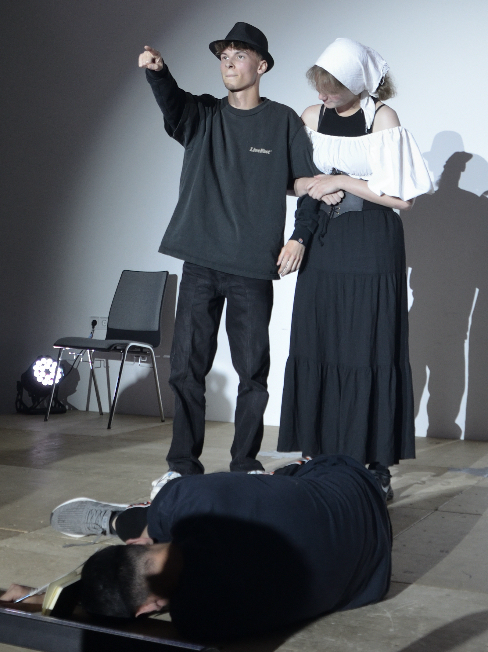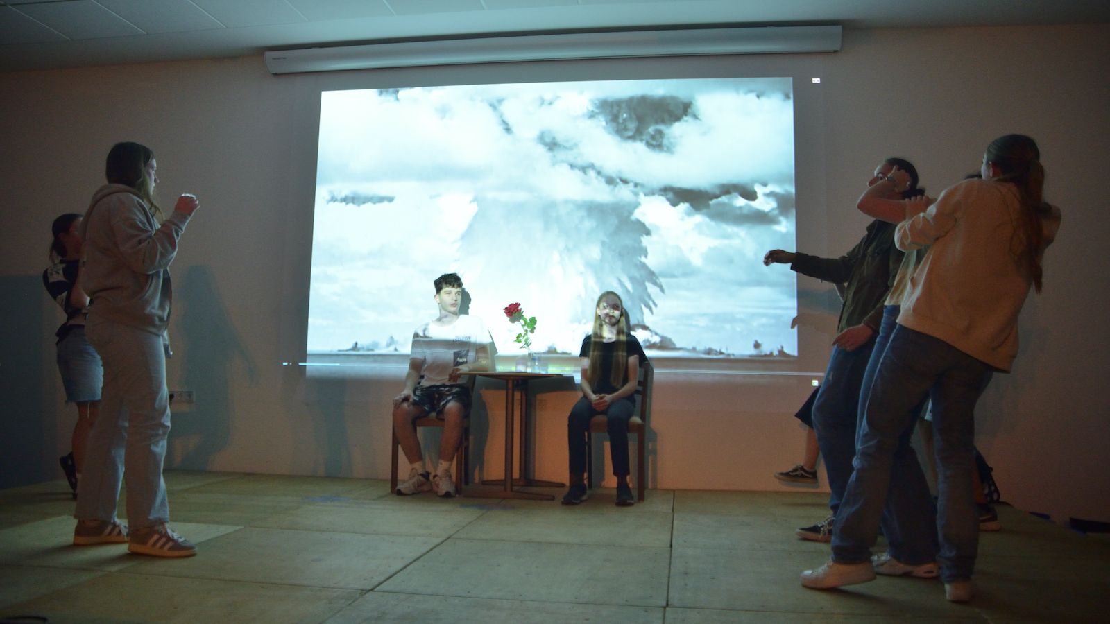 Der jüngste Theaternachwuchs, der beim Festival sein Stück präsentieren durfte, war der Wahlunterrichtskurs 10 von Harald Minde mit dem Stück „Und es hat ZOOM gemacht“. Nicht ohne Grund war auf dem Werbeplakat die Warnung „FSK ab 12“ abgedruckt, denn es wurde auffällig viel und auffällig spektakulär gestorben in dieser Collage aus Spielszenen und Rezitationen von Liedtexten aus Liebesliedern und Schnulzenschlagern. Die groteske Montage von ausgelutschten Zuneigungsbekundungen einerseits und Katastrophen mittleren bis globalen Ausmaßes andererseits – von Stromschlägen bei ungeschickten DIY-Arbeiten bis Atombombenexplosionen war so ziemlich alles dabei – bot sowohl Raum für die große Spielfreude der Mannschaft wie auch für die Minde-typischen pantomimischen Slapstickeinlagen.