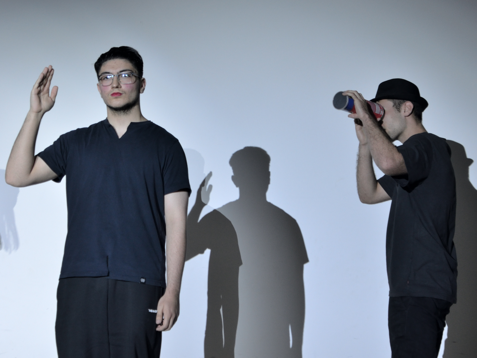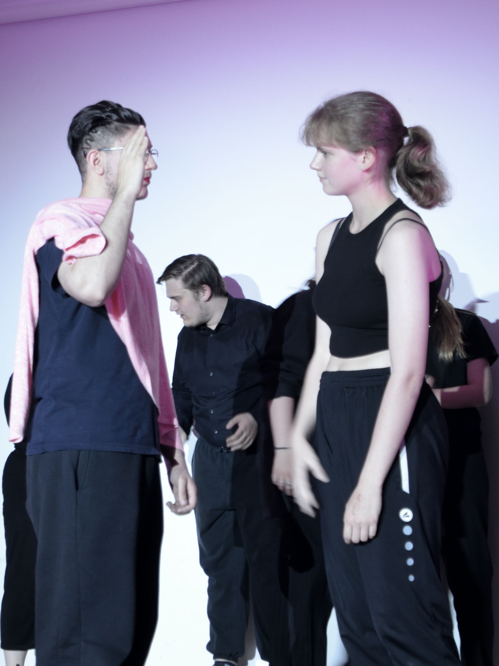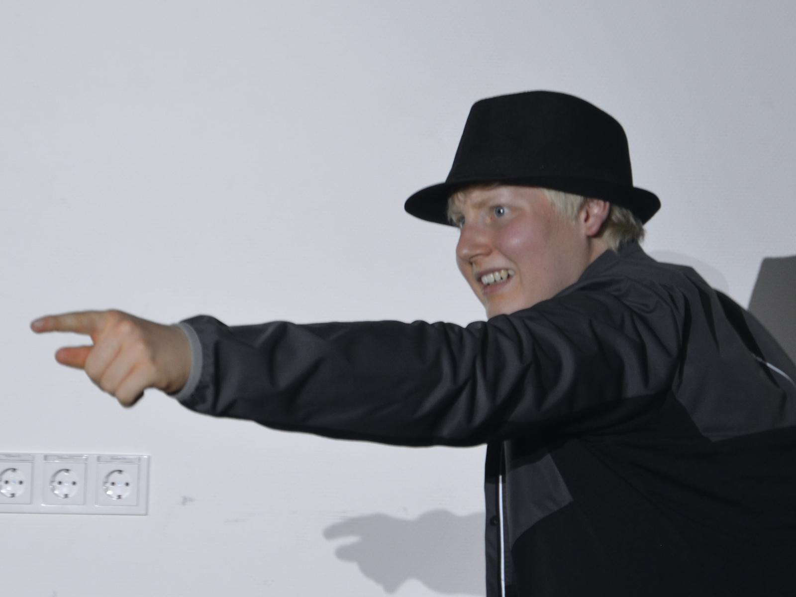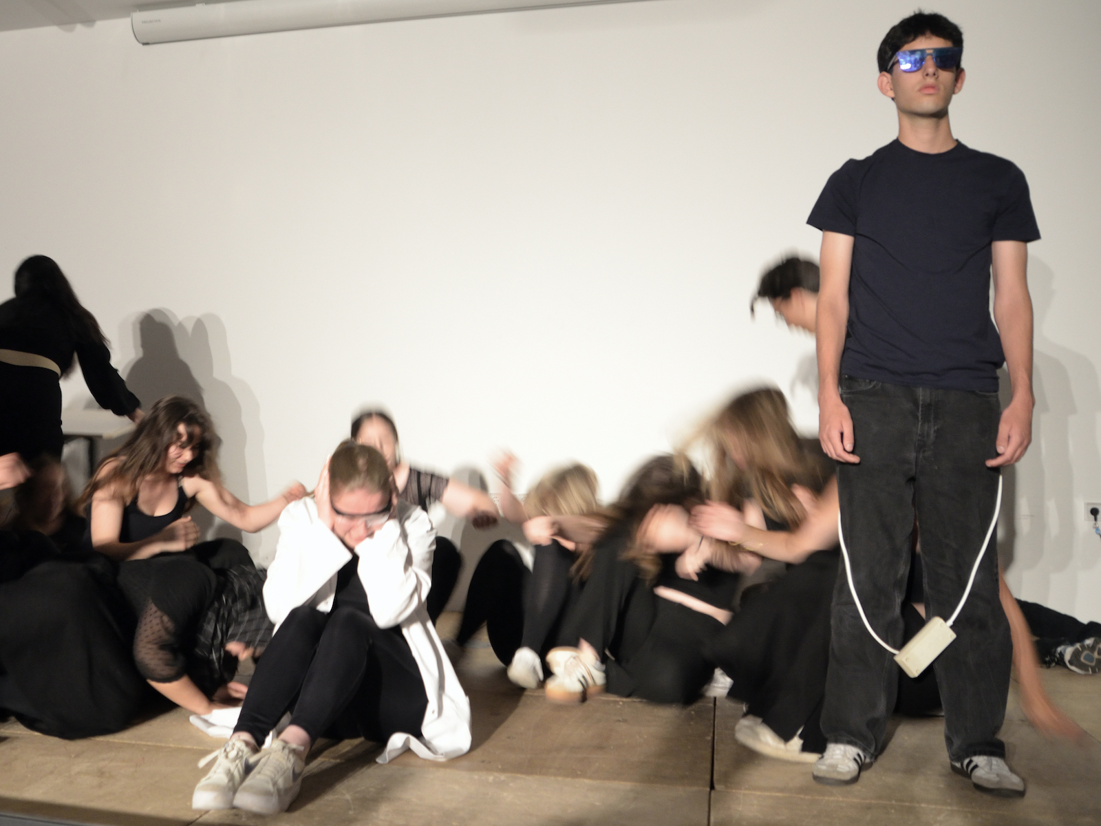 Der jüngste Theaternachwuchs, der beim Festival sein Stück präsentieren durfte, war der Wahlunterrichtskurs 10 von Harald Minde mit dem Stück „Und es hat ZOOM gemacht“. Nicht ohne Grund war auf dem Werbeplakat die Warnung „FSK ab 12“ abgedruckt, denn es wurde auffällig viel und auffällig spektakulär gestorben in dieser Collage aus Spielszenen und Rezitationen von Liedtexten aus Liebesliedern und Schnulzenschlagern. Die groteske Montage von ausgelutschten Zuneigungsbekundungen einerseits und Katastrophen mittleren bis globalen Ausmaßes andererseits – von Stromschlägen bei ungeschickten DIY-Arbeiten bis Atombombenexplosionen war so ziemlich alles dabei – bot sowohl Raum für die große Spielfreude der Mannschaft wie auch für die Minde-typischen pantomimischen Slapstickeinlagen.
