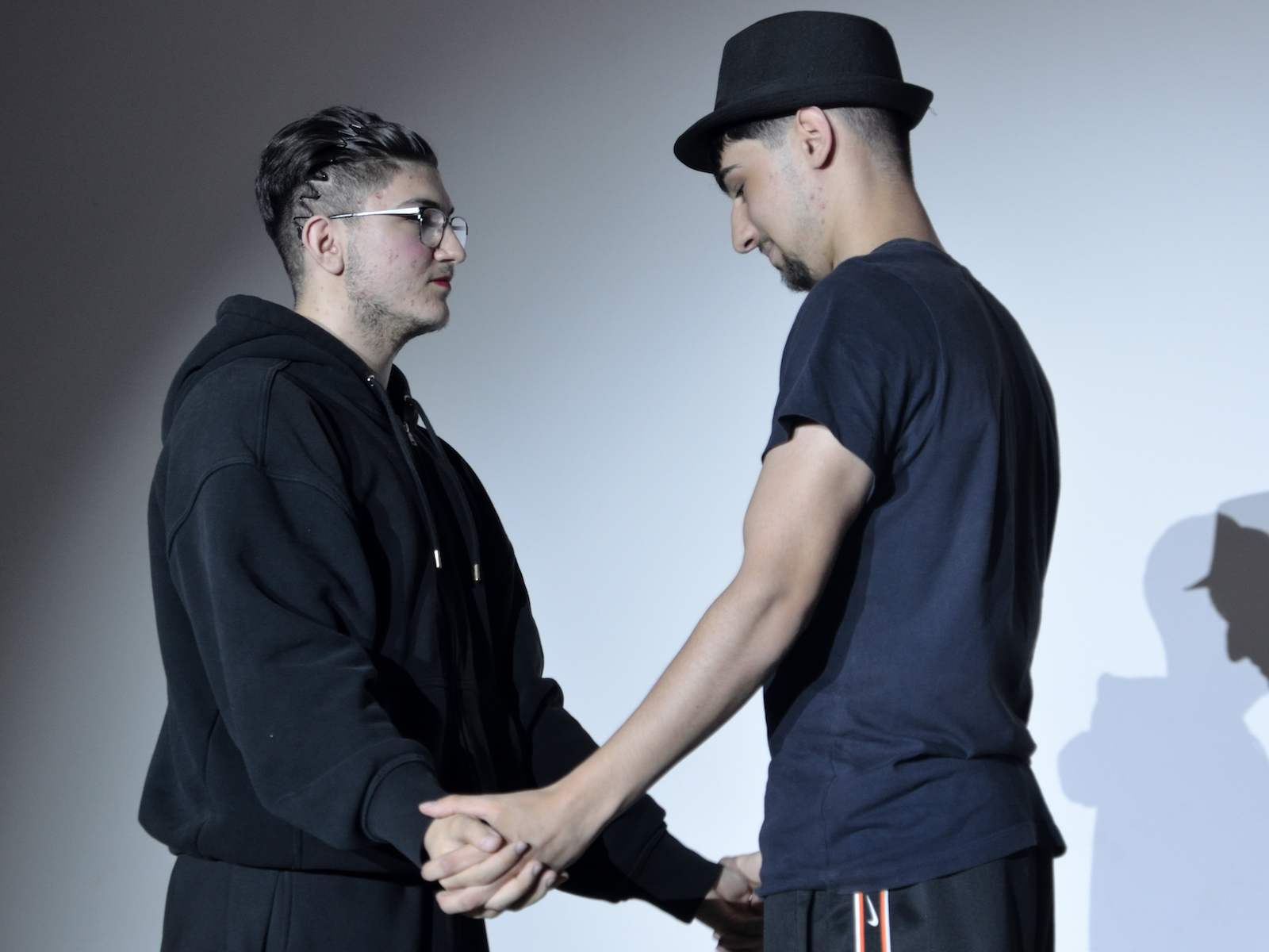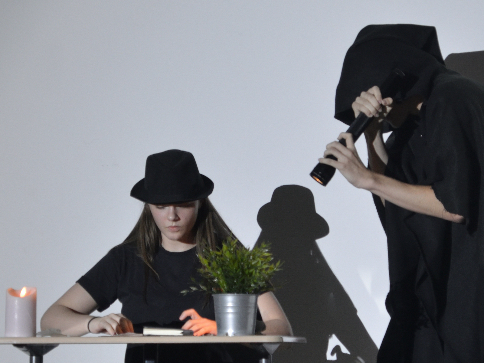 Vordergründig einem älteren literarischen Stoff zugewandt, doch thematisch in dieselbe Kerbe schlug der Q2-Kurs von Jana Gehlen, der sich E.T.A. Hoffmanns Nachtstück „Der Sandmann“ widmete, welcher zugleich in Hessen Abiturlektüre ist. Die Truppe machte aus der Vorlage ein „Sandmännchen“ und verarbeiteten die Parade-Erzählung der Schwarzen Romantik in kurze Spielszenen mit manchmal eher schwarzem Humor und mit wechselnder schauspielerischer Besetzung. So wusste man als Zuschauer manchmal nicht, ob man mit dem armen Nathanael, der – vom grausamen Advokaten Coppelius als Kind traumatisiert – eher Mitleid haben oder ihn auslachen sollte, wenn er dem zwielichtigen Wetterglashändler Coppola und noch viel mehr dem Automatengeschöpf Olimpia auf den Leim ging. Sehr hellsichtig hat E.T.A. Hoffmann in dieser Figur die Ängste vor den Täuschungen durch Künstliche Intelligenz vorausgeahnt, sodass auch in diesem Stück der rote Faden des Abends aufgegriffen wurde.