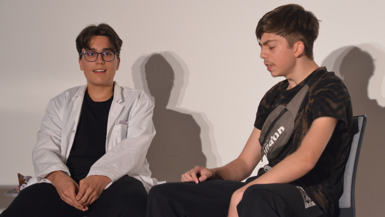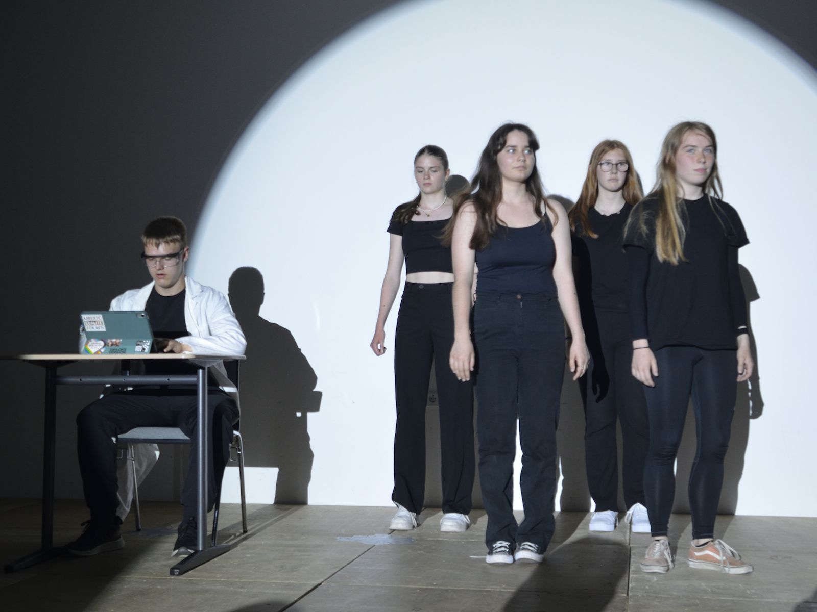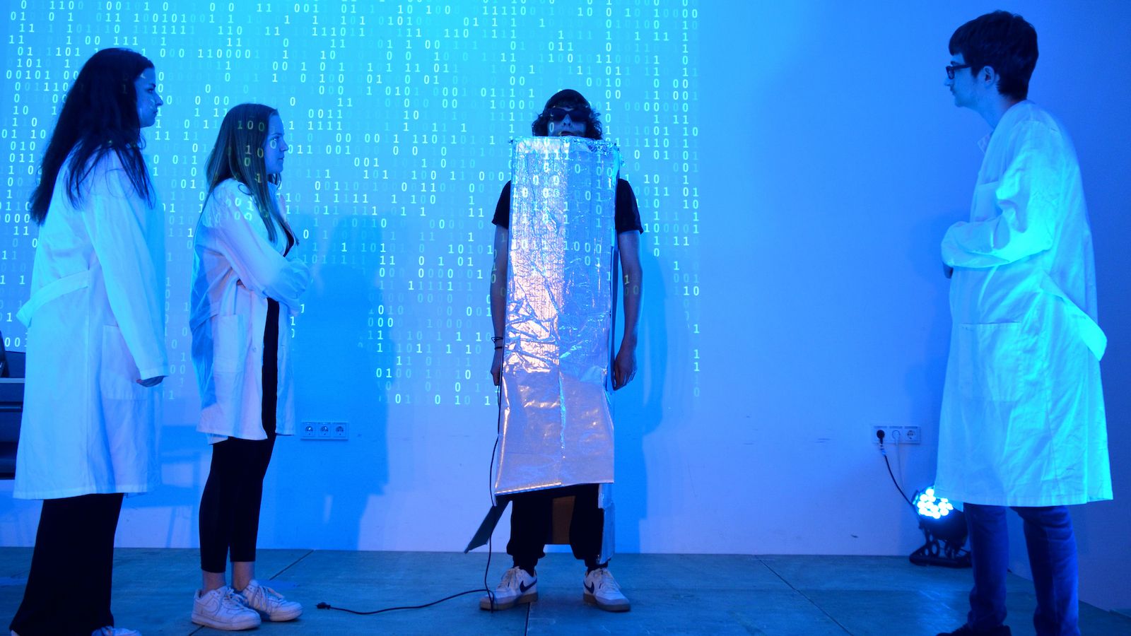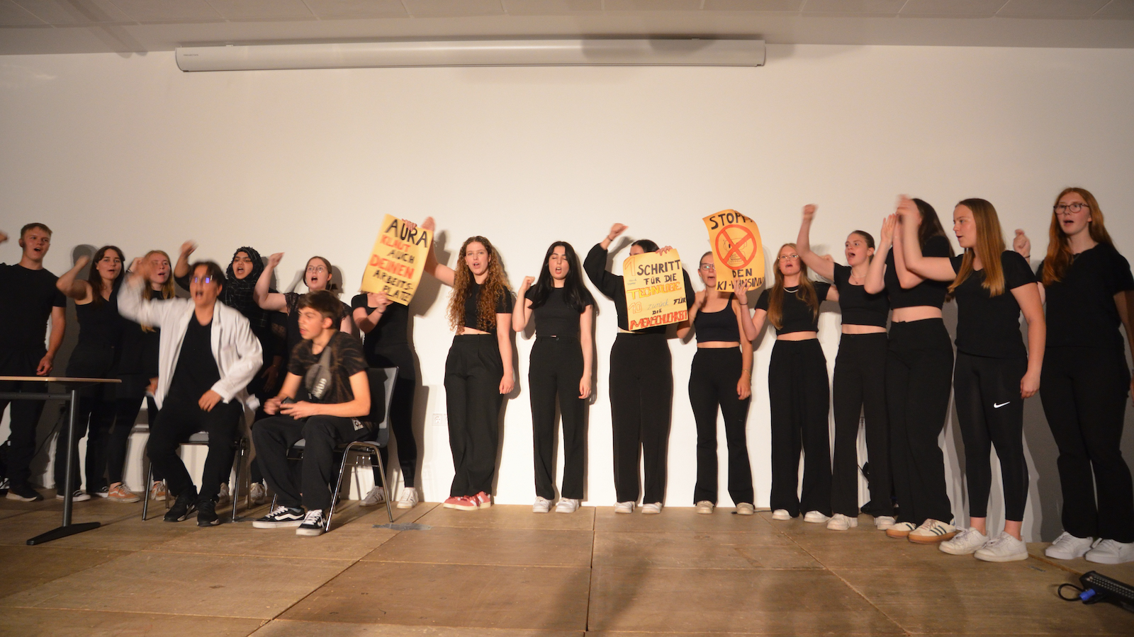 Die Schauspieler des E2-Kurses präsentierten also das selbst(?) geschriebene Stück „Aura macht Theater – ein Stück von, mit und über KI“, in welchem die Experimente eines finanziell klammen Wissenschaftlers mit Künstlicher Intelligenz gänzlich aus dem Ruder laufen und schließlich zu einer Spaltung der Gesellschaft in Pro-Aura-Aktivisten und Widerstandskämpfer führen. Im Stil von Brechts Epischem Theater wurde jeder Akt vorher mit einer kurzen Inhaltsangabe eingeführt und dann die Spirale der gesellschaftlichen Eskalation eindrucksvoll weitergedreht, bis sogar in Talkshows auftretende Minister KI-gesteuerte Statements herunterratterten. Die Chancen, aber noch mehr die Gefahren einer außer Kontrolle geratenen KI wurden dem Publikum in „Aura“ auf beklemmende Art und Weise vor Augen geführt.