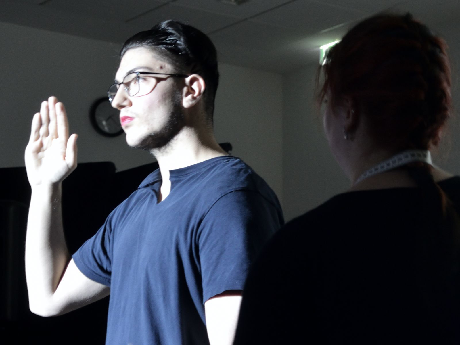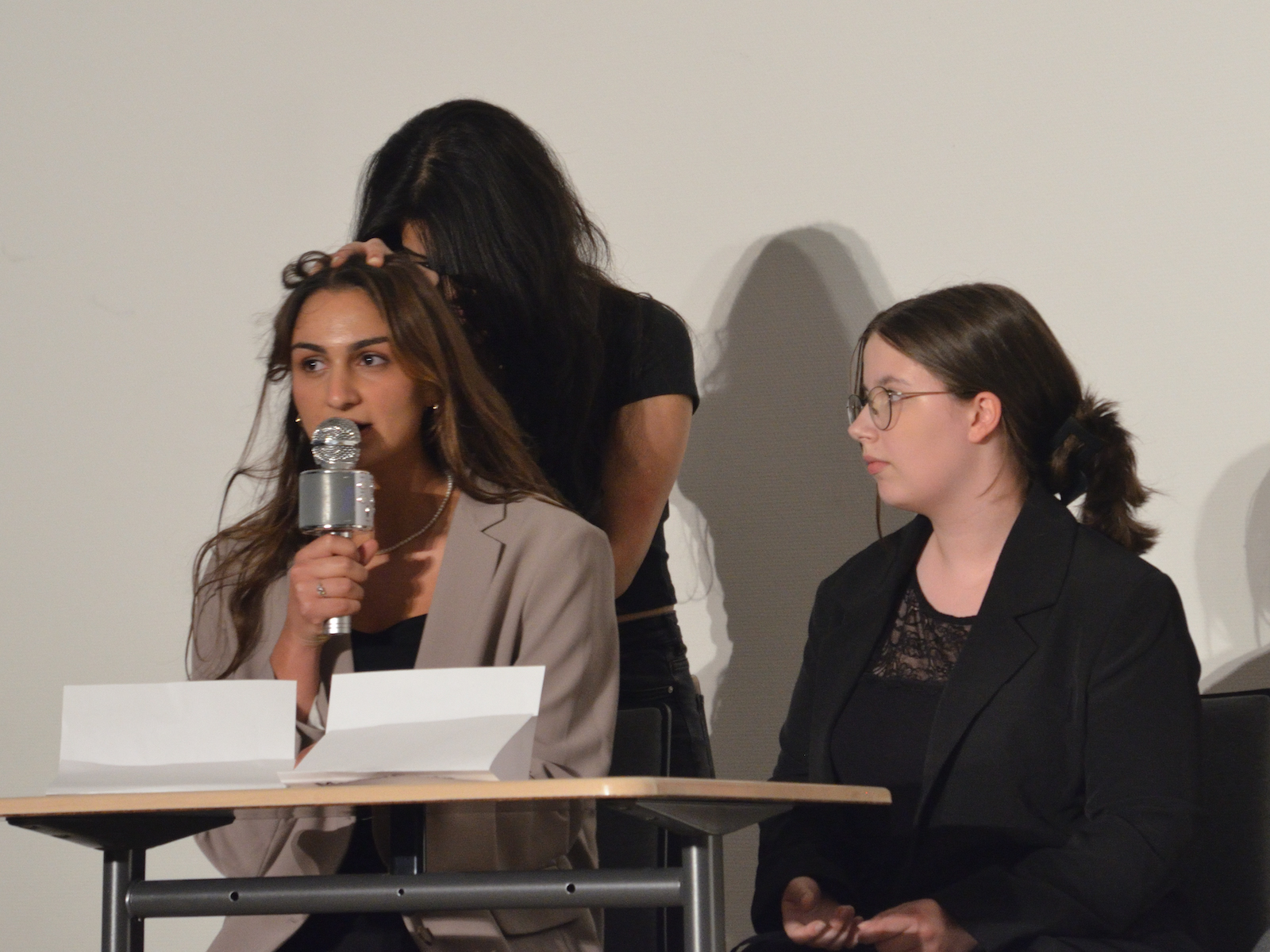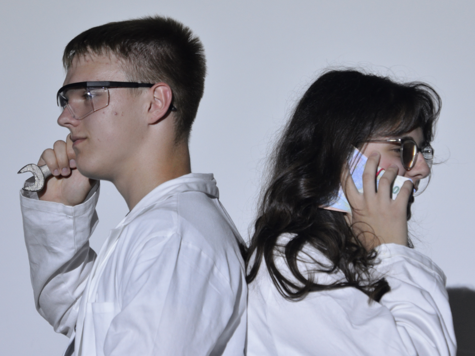 Die Schauspieler des E2-Kurses präsentierten also das selbst(?) geschriebene Stück „Aura macht Theater – ein Stück von, mit und über KI“, in welchem die Experimente eines finanziell klammen Wissenschaftlers mit Künstlicher Intelligenz gänzlich aus dem Ruder laufen und schließlich zu einer Spaltung der Gesellschaft in Pro-Aura-Aktivisten und Widerstandskämpfer führen. Im Stil von Brechts Epischem Theater wurde jeder Akt vorher mit einer kurzen Inhaltsangabe eingeführt und dann die Spirale der gesellschaftlichen Eskalation eindrucksvoll weitergedreht, bis sogar in Talkshows auftretende Minister KI-gesteuerte Statements herunterratterten. Die Chancen, aber noch mehr die Gefahren einer außer Kontrolle geratenen KI wurden dem Publikum in „Aura“ auf beklemmende Art und Weise vor Augen geführt.