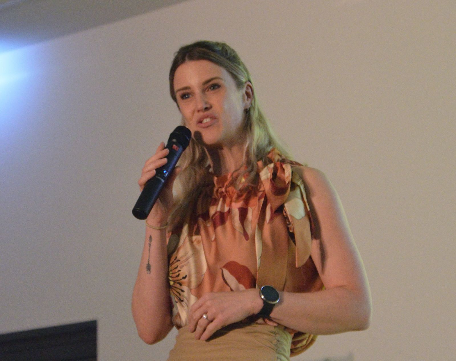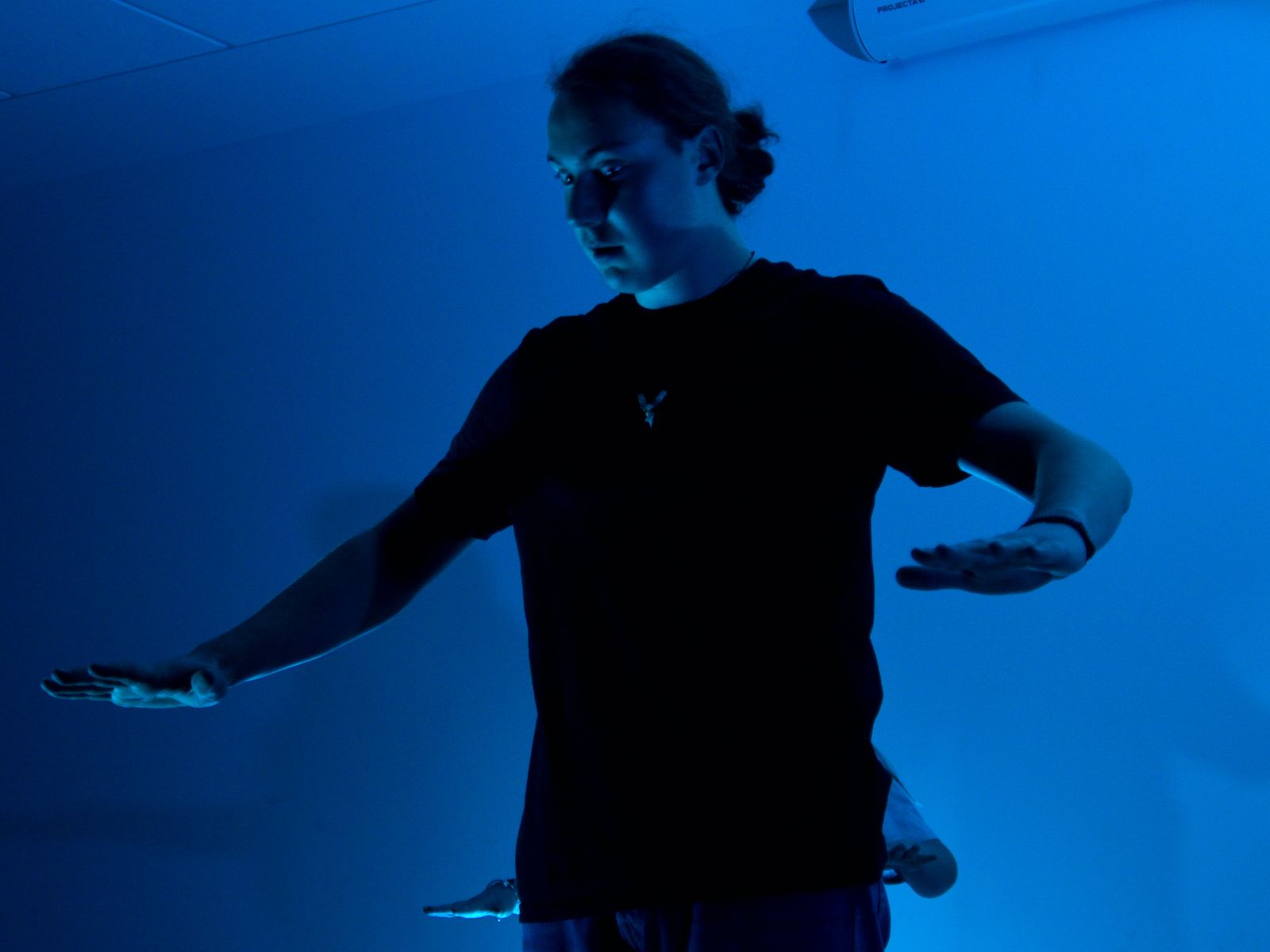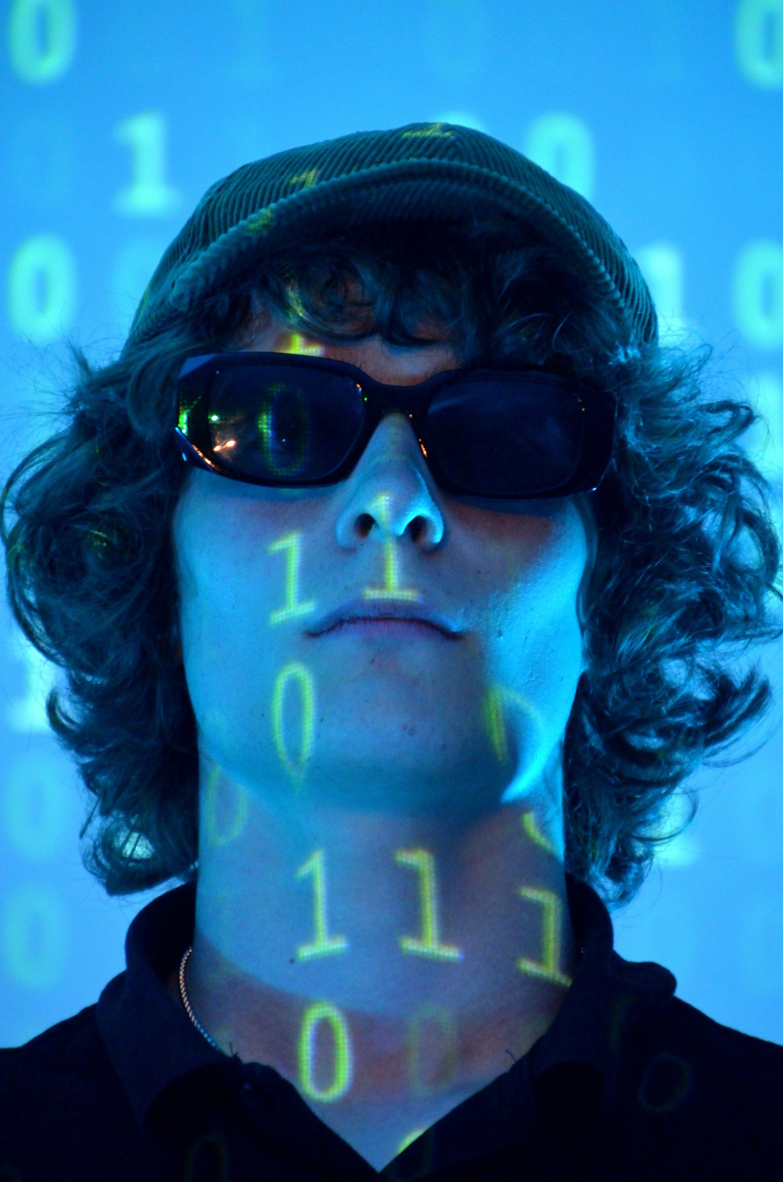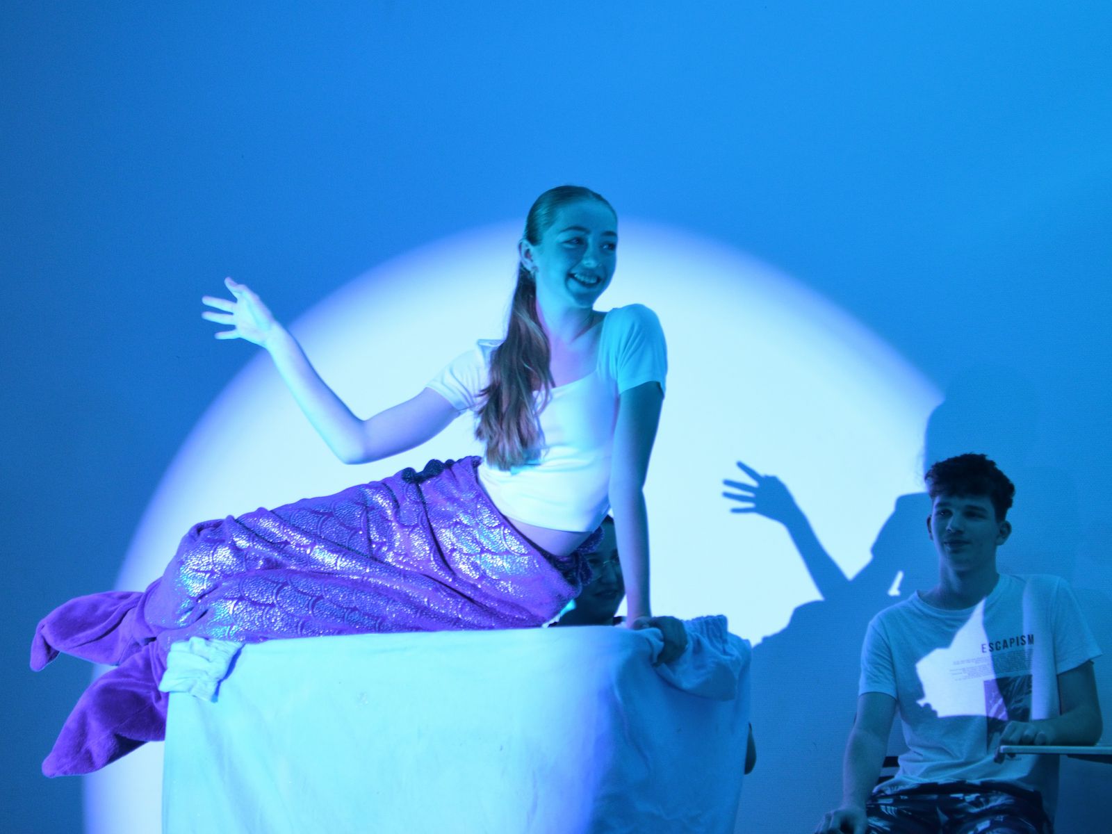 Die Schauspieler des E2-Kurses präsentierten also das selbst(?) geschriebene Stück „Aura macht Theater – ein Stück von, mit und über KI“, in welchem die Experimente eines finanziell klammen Wissenschaftlers mit Künstlicher Intelligenz gänzlich aus dem Ruder laufen und schließlich zu einer Spaltung der Gesellschaft in Pro-Aura-Aktivisten und Widerstandskämpfer führen. Im Stil von Brechts Epischem Theater wurde jeder Akt vorher mit einer kurzen Inhaltsangabe eingeführt und dann die Spirale der gesellschaftlichen Eskalation eindrucksvoll weitergedreht, bis sogar in Talkshows auftretende Minister KI-gesteuerte Statements herunterratterten. Die Chancen, aber noch mehr die Gefahren einer außer Kontrolle geratenen KI wurden dem Publikum in „Aura“ auf beklemmende Art und Weise vor Augen geführt.
