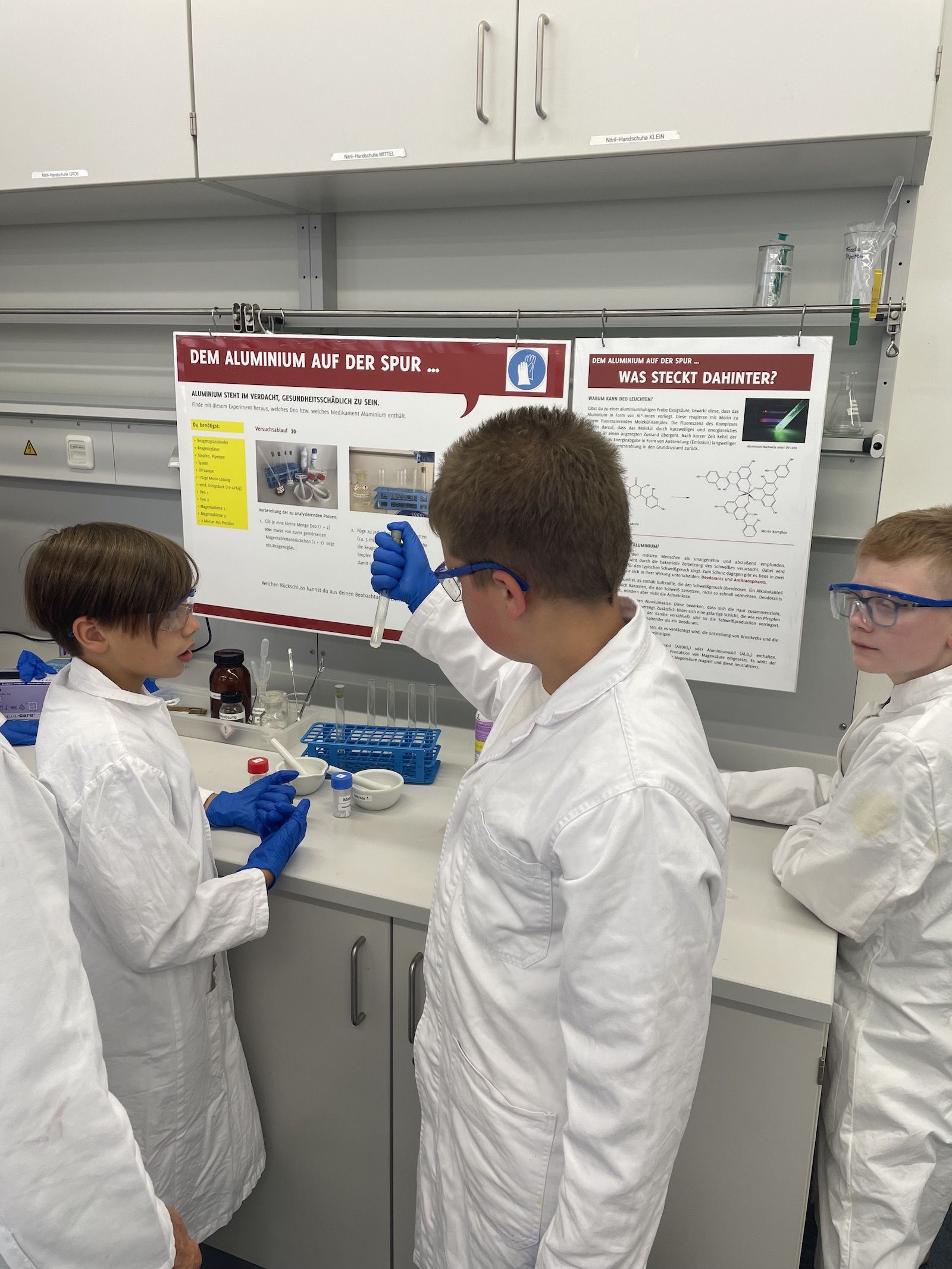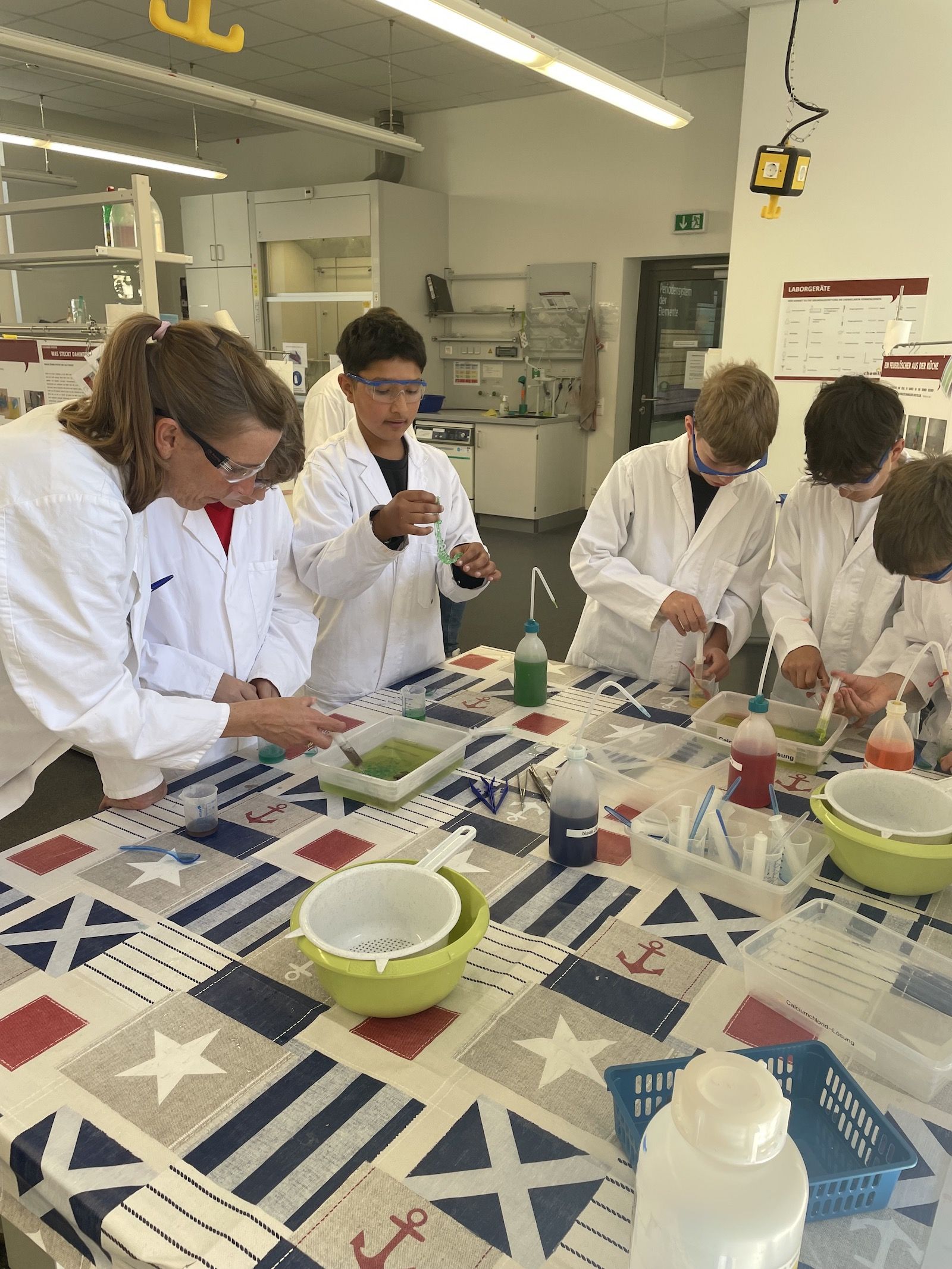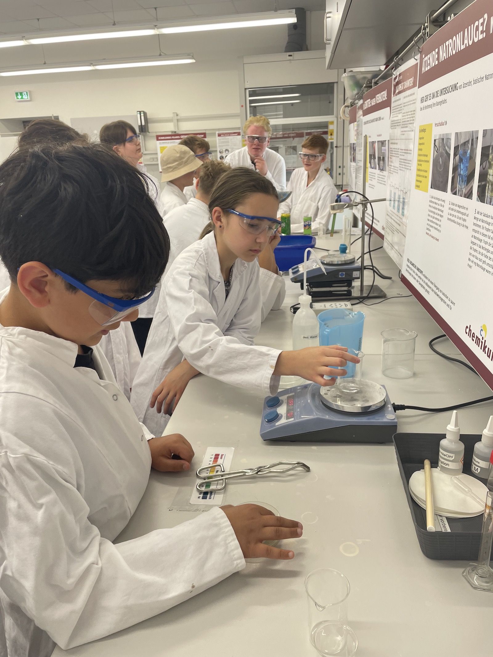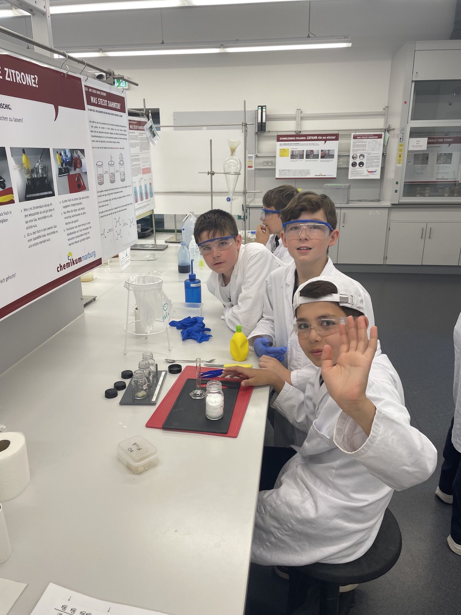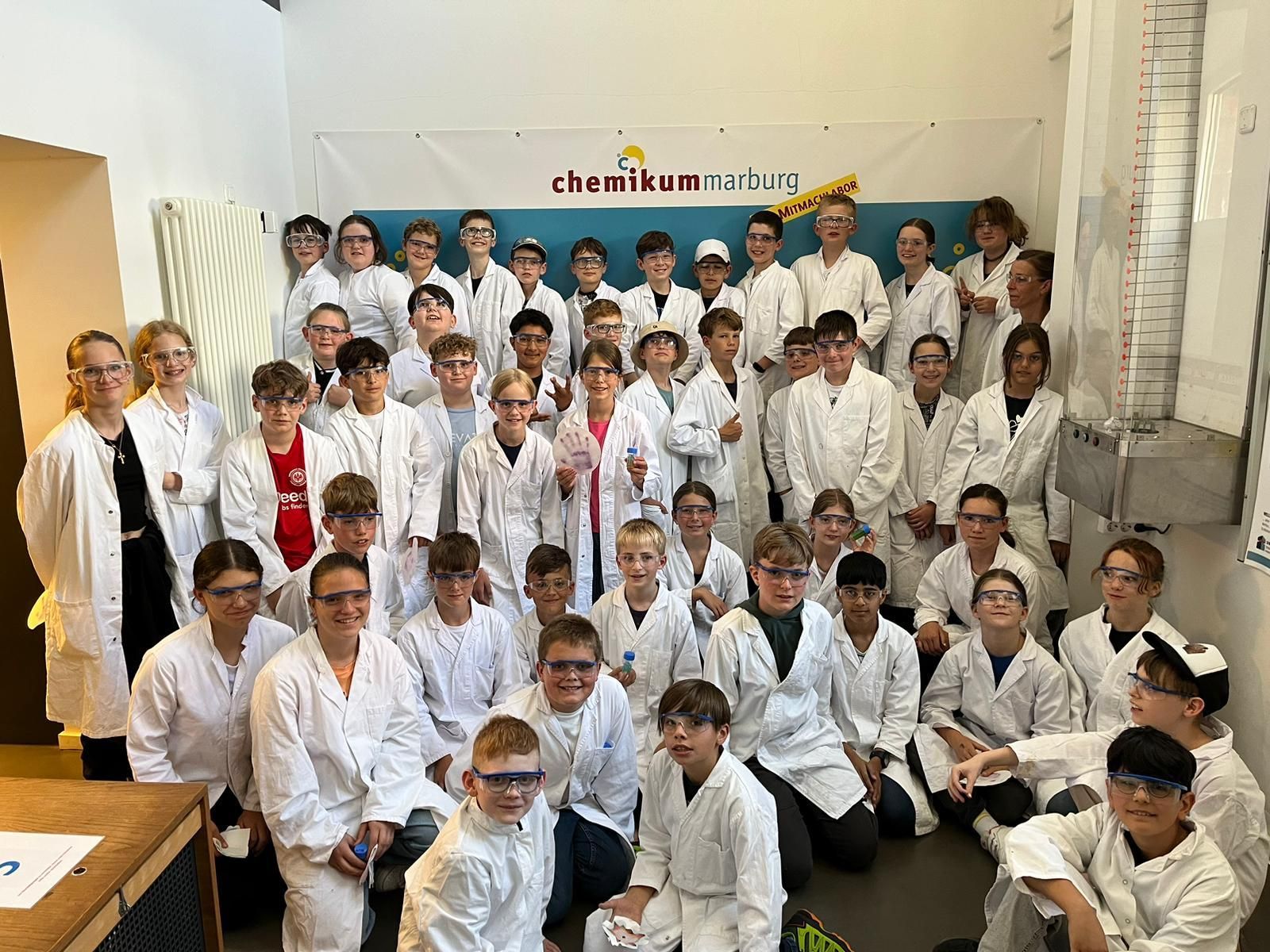 Im Rahmen eines Projekttags besuchten die drei Kurse der Jahrgangstufe 5 Anfang Juli das Chemikum in Marburg. Ausgerüstet mit Laborkittel und Schutzbrille konnten die Schülerinnen und Schüler vor Ort in Kleingruppen weitgehend eigenständig ihre Laborkenntnisse und ihr Vorwissen aus dem Profilunterricht dazu nutzen, viele spannende Forscherfragen experimentell beantworten zu können. Dabei hatten alle Experimente einen klaren Bezug zum Alltag und waren zugleich sehr abwechslungsreich. Mit Hilfe von didaktisch aufbereiteten Infotafeln konnten sich die Forscherteams über den genauen Ablauf und auch über die fachlichen Hintergründe der Experimente informieren. Und sollten dann mal ein Reagenz- oder Becherglas fehlen oder sich grundsätzlich Fragen ergeben, stand das hilfsbereite und kompetente Betreuungspersonal des Chemikums mit Rat und Tat den Jungforschern zur Seite.