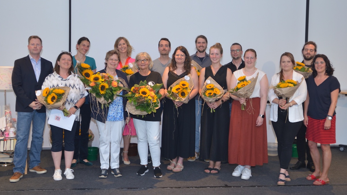 Viele Ehrungen und Abschiede, von links: Schulleiter Martin Hinterlang, Sabine Busch, Katja Schöwel, Corinna Klein, Mirjam Maage (Abschied in Auslandsschuldienst), Rosi Kowalski, Jan Schlimm, Hannah Brill, Tim Schilp, Elena Makris, Andreas Göbel, Mareike Schwarz, Ines Liebnitz, Patrick Huttel, Pesonalratsvorsitzende Julia Schäfer-Schmitt