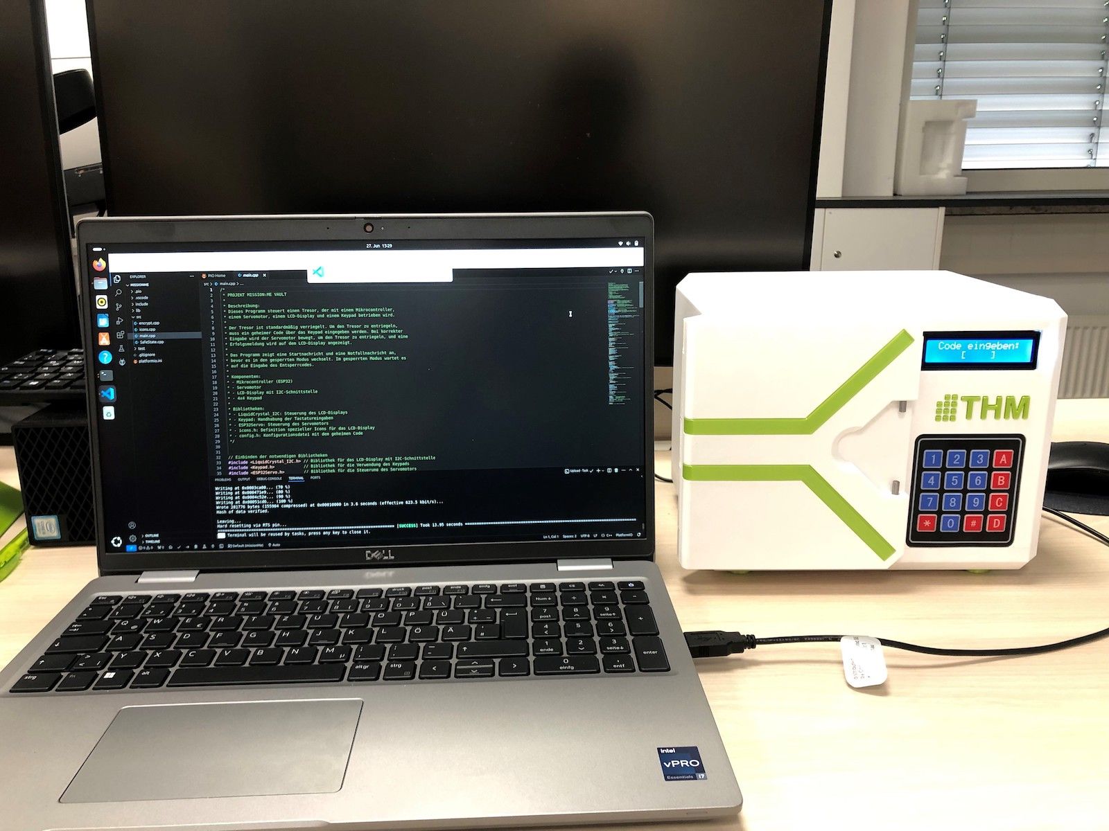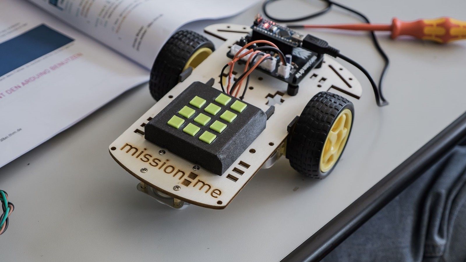 Eine weitere Mission nannte sich „Tech Treasure“. Ein Student führte uns durch die Arbeitsräume, in denen weitere Studierende an ihren Projekten arbeiteten oder programmierten. Danach bekam dann jeder Teilnehmer eine Box, die einen Motor, Drähte und ein Steckbrett im Inneren beinhaltete. Eine erste Aufgabe war es, mithilfe eines Bauplans und einer Tabelle die Drähte richtig mit dem Streichbrett und Motor zu verbinden. Dabei bekamen wir hilfreiche Einblicke in die Bestandteile wie Aktoren, Sensoren und die Steuerungstechnik. Die zweite Aufgabe bestand darin, die Box an einen Computer anzuschießen und zu programmieren, um es möglich zu machen, auf die Anzeigetafel der Box vom Computer aus schreiben zu können. Dieser Teil gefiel mir besonders gut, obwohl ich zuvor wenige Berührungspunkte mit Informatik hatte. Ich lernte mehrere Befehle und Teile zum Aufbau eines Codes und das Zurückgreifen auf eine Library, zur Vereinfachung des Programmierens. Um letztendlich die Box öffnen zu können, bekamen wir ein Rätsel, in dem es Ziel war, später auf die Kaprekar-Konstante zu kommen. Mit dieser Kombination ließ sich die Box öffnen. Im Inneren der Box befand sich ein sogenannter MINTI, das ist eine 3D-gedruckte mission:me-Figur. Auf dem MINTI stand „Ingenieur-Informatik“, womit dann der Studiengang dieser Mission aufgedeckt wurde.