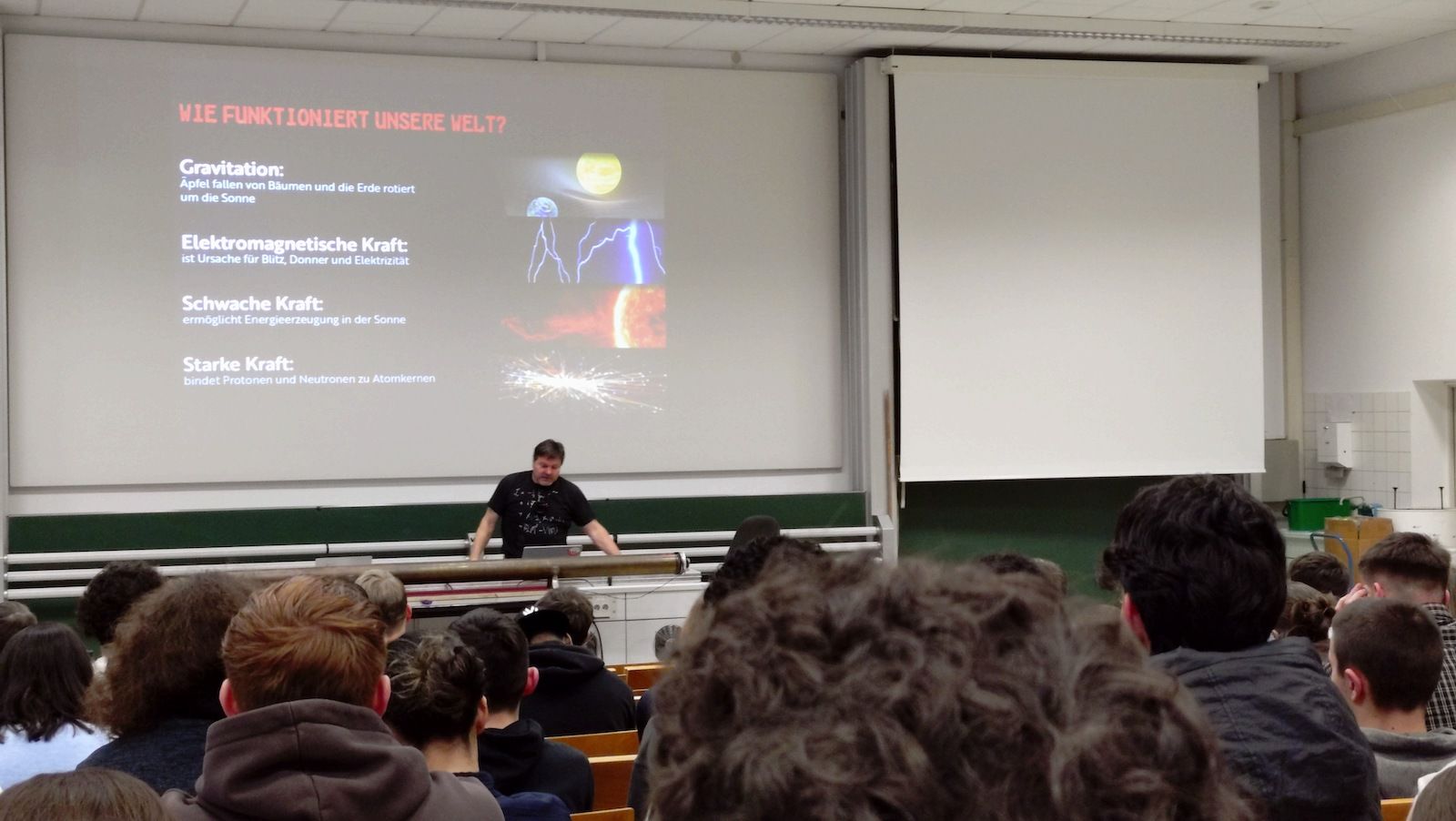 Nach einer herzlichen Begrüßung durch Herrn Ohmann leitete Herr Lenz die Veranstaltung mit einem fesselnden Vortrag unter dem Titel „Einmal zum Urknall und zurück“ ein. Er nahm die Teilnehmenden mit auf eine Reise durch die Physik – von den kleinsten Teilchen bis hin zu den größten Strukturen des Universums. Im Anschluss erkundeten die Schülerinnen und Schüler verschiedene Workshops und erhielten Einblicke in aktuelle Forschungsfelder und das Physikstudium.