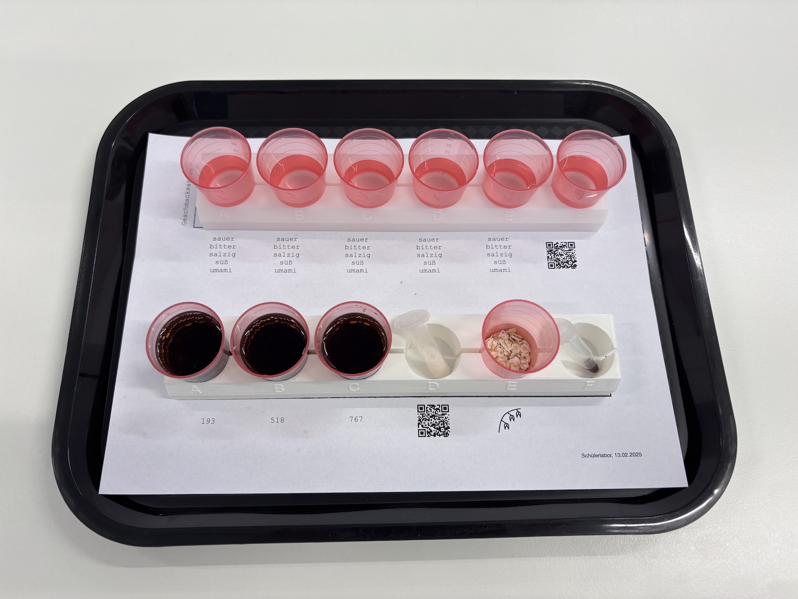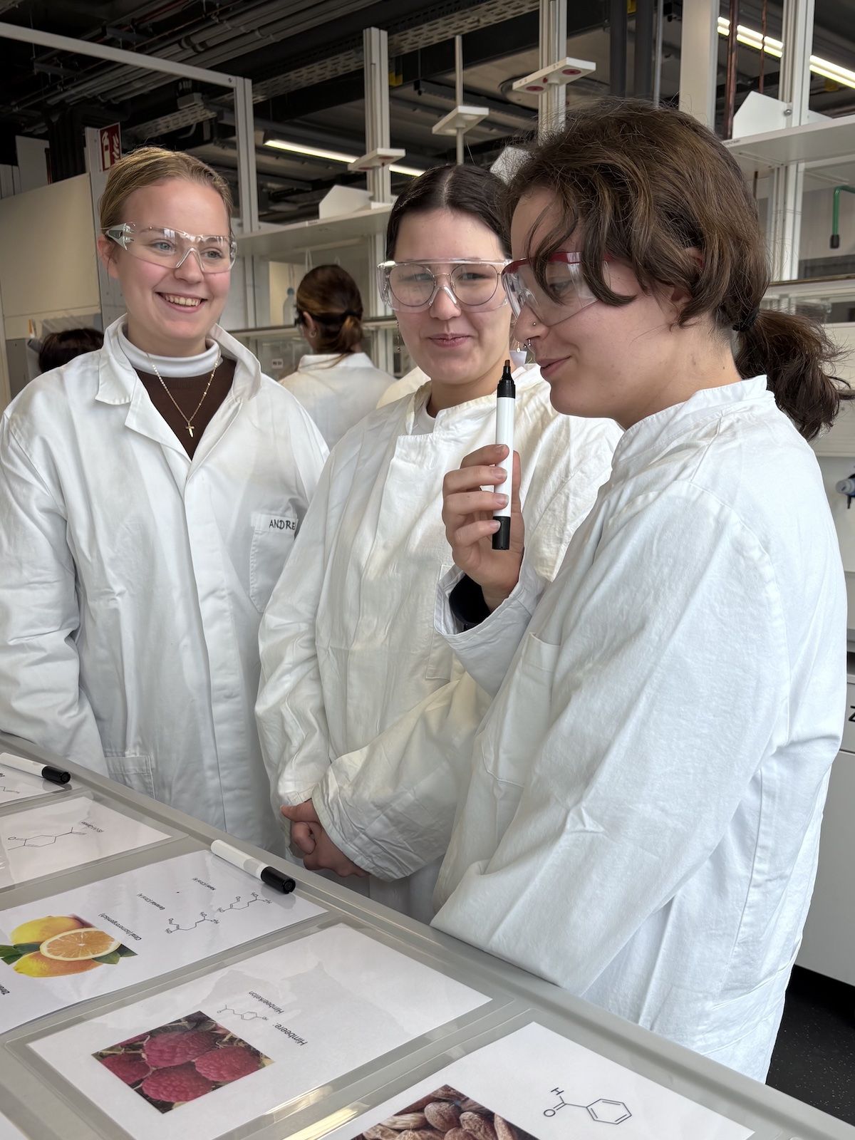 Nach unserer Ankunft im Eingangsbereich der Universität wurden wir herzlich empfangen und begaben uns direkt zu unserer ersten Station des Tages. Dort erhielten wir von Herrn Prof. Dr. Zorn und Herrn Dr. Fraatz eine kurze Einführung in die Lebensmittelchemie. Sie erklärten uns, wie Geschmacks- und Geruchssinn auf biochemischer Ebene funktionieren, und wir konnten unser bereits erlerntes Wissen sinnvoll verknüpfen. Zum Abschluss dieser Einführung nahmen wir an einem kleinen Experiment teil, bei dem wir unseren Geschmackssinn auf die Probe stellen konnten.