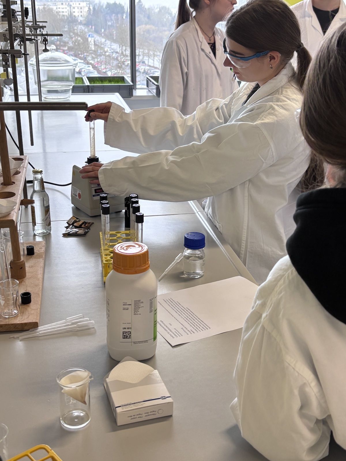 Anschließend wurde es praktisch: Im Labor, ausgestattet mit Kitteln und Schutzbrillen, führten wir unter Aufsicht verschiedene Experimente zu Gerüchen und Lebensmitteln durch. Besonders eindrucksvoll waren die Geruchsstifte, deren Düfte wir blind bestimmten Dingen zuordnen mussten – darunter Minze, Mandeln und Pilze.