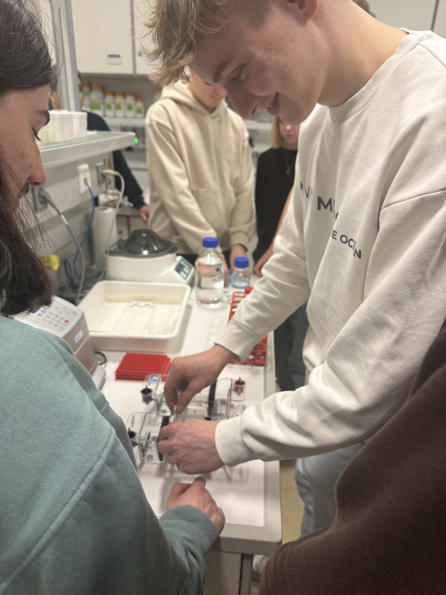 Das Besondere hierbei war die Untersuchung der eigenen DNA, genauer eines nicht codierenden Abschnitts mit der Bezeichnung D1SD80 auf Chromosom 1. Aus einer eigenen Speichelprobe isolierten die Schüler*innen zunächst ihre DNA aus den Zellen der Mundschleimhaut. Da man für ein aussagekräftiges Ergebnis ausreichend Erbgut benötigt, musste die Probe mittels der PCR-Methode ausreichend vervielfältigt werden. Dazu mussten in mühevoller Arbeit die erforderlichen Komponenten, wie Primer, Nucleotide und natürlich die eigene DNA, im Mikroliter-Bereich pipettiert werden.