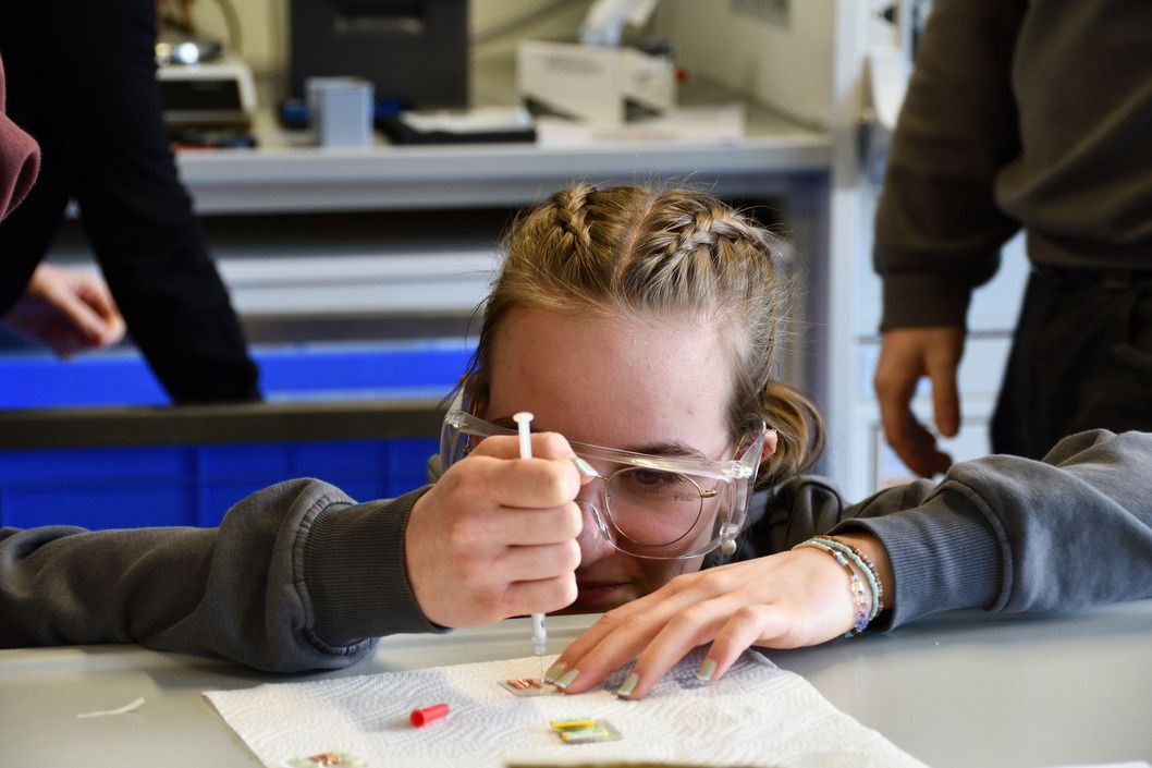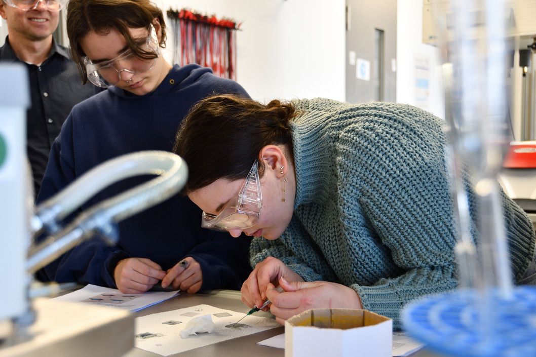 Nach der Einführung ging es direkt ins Labor. Dort durften wir selbst ein OLED-Modell bauen. Begeistert von der beeindruckenden Ausstattung machten wir uns in Zweiergruppen an die Arbeit. Mit Unterstützung von Mitarbeitenden gelang es jeder Gruppe, mindestens ein OLED erfolgreich zum Leuchten zu bringen.