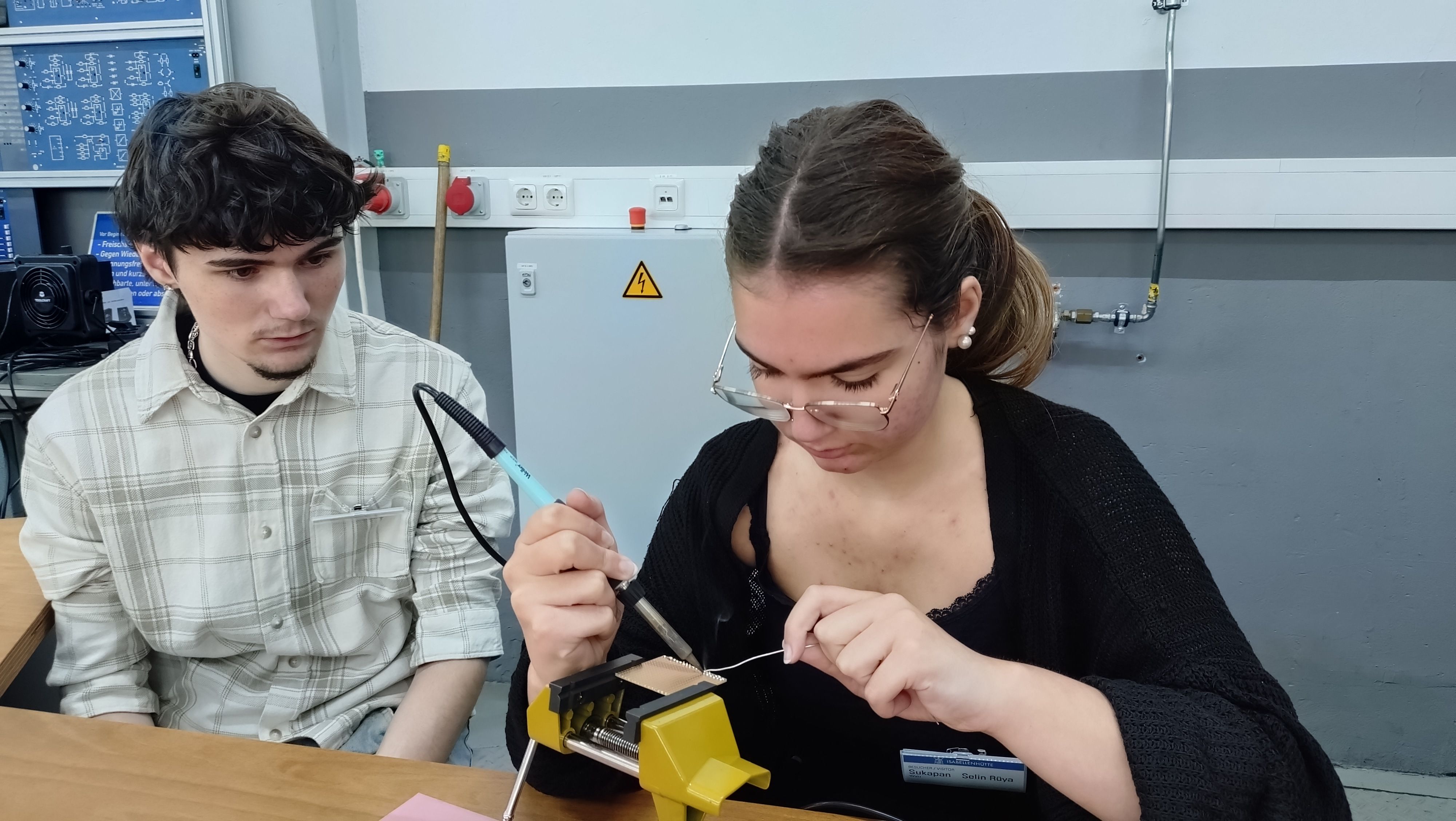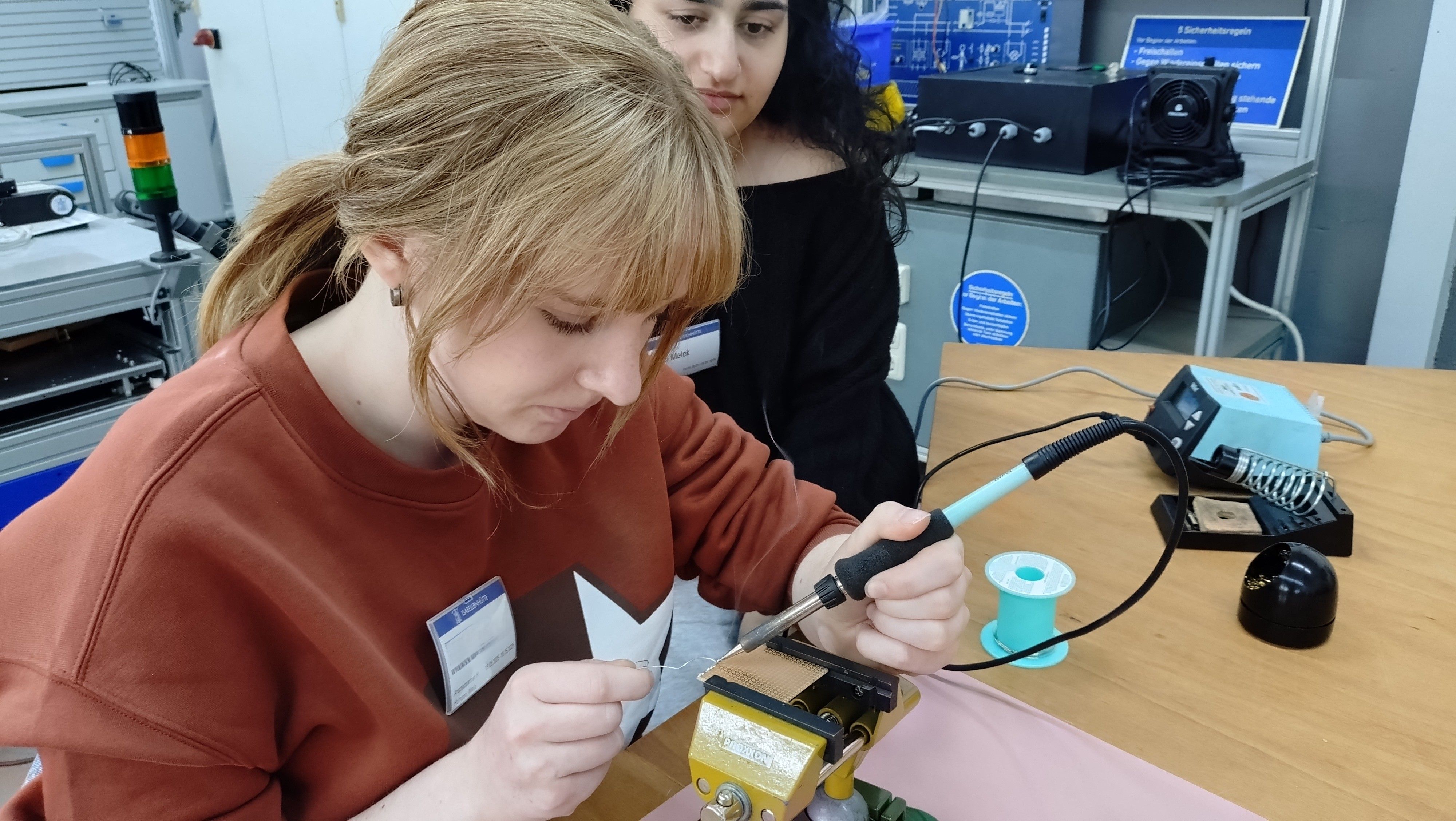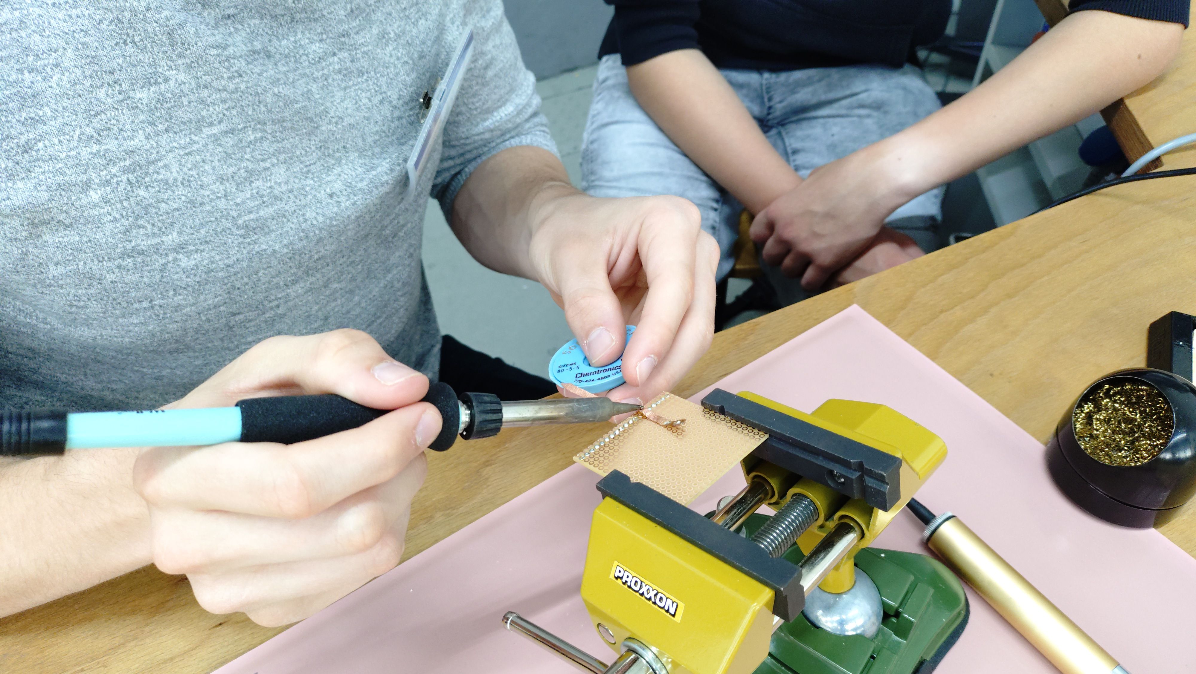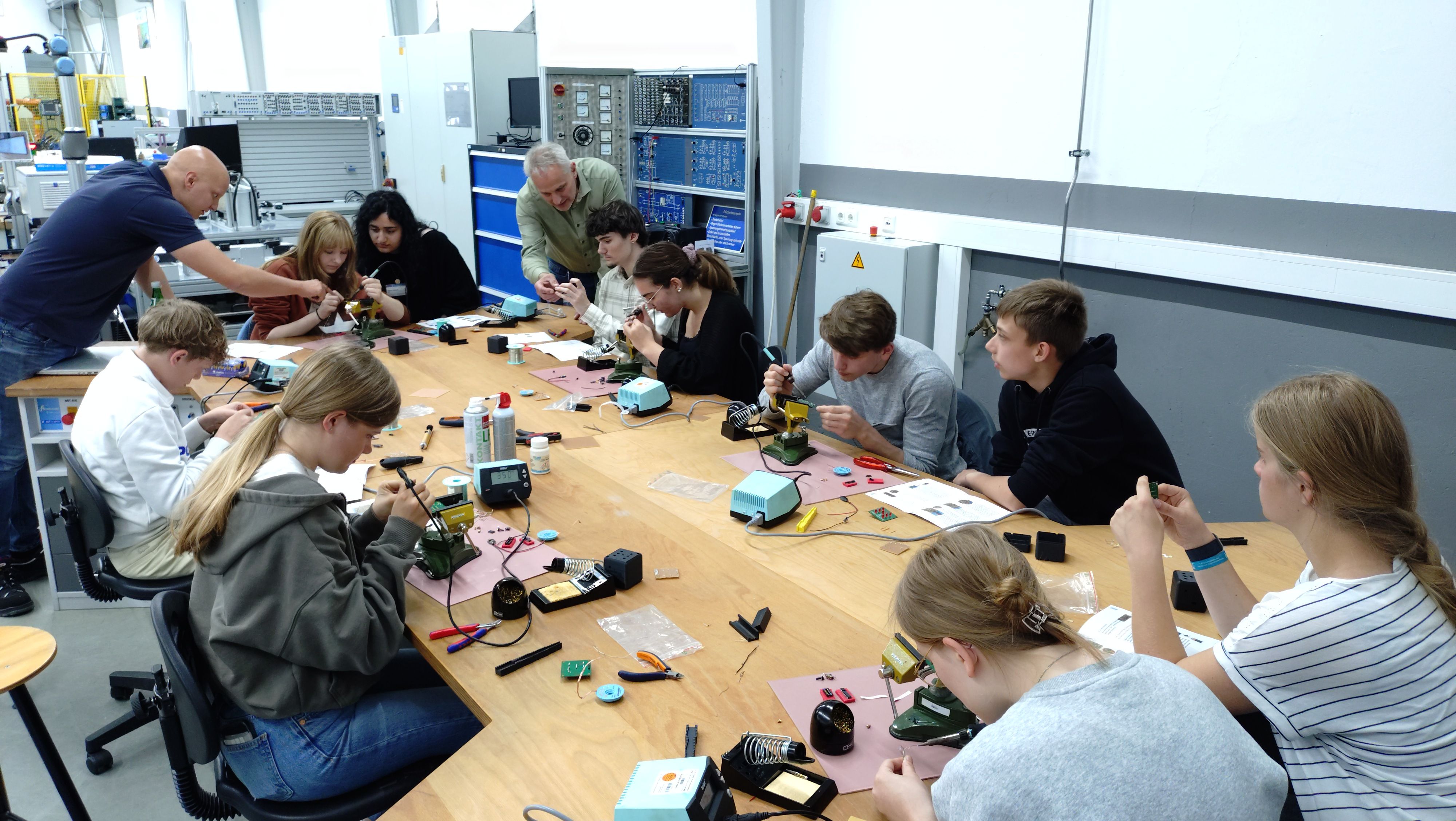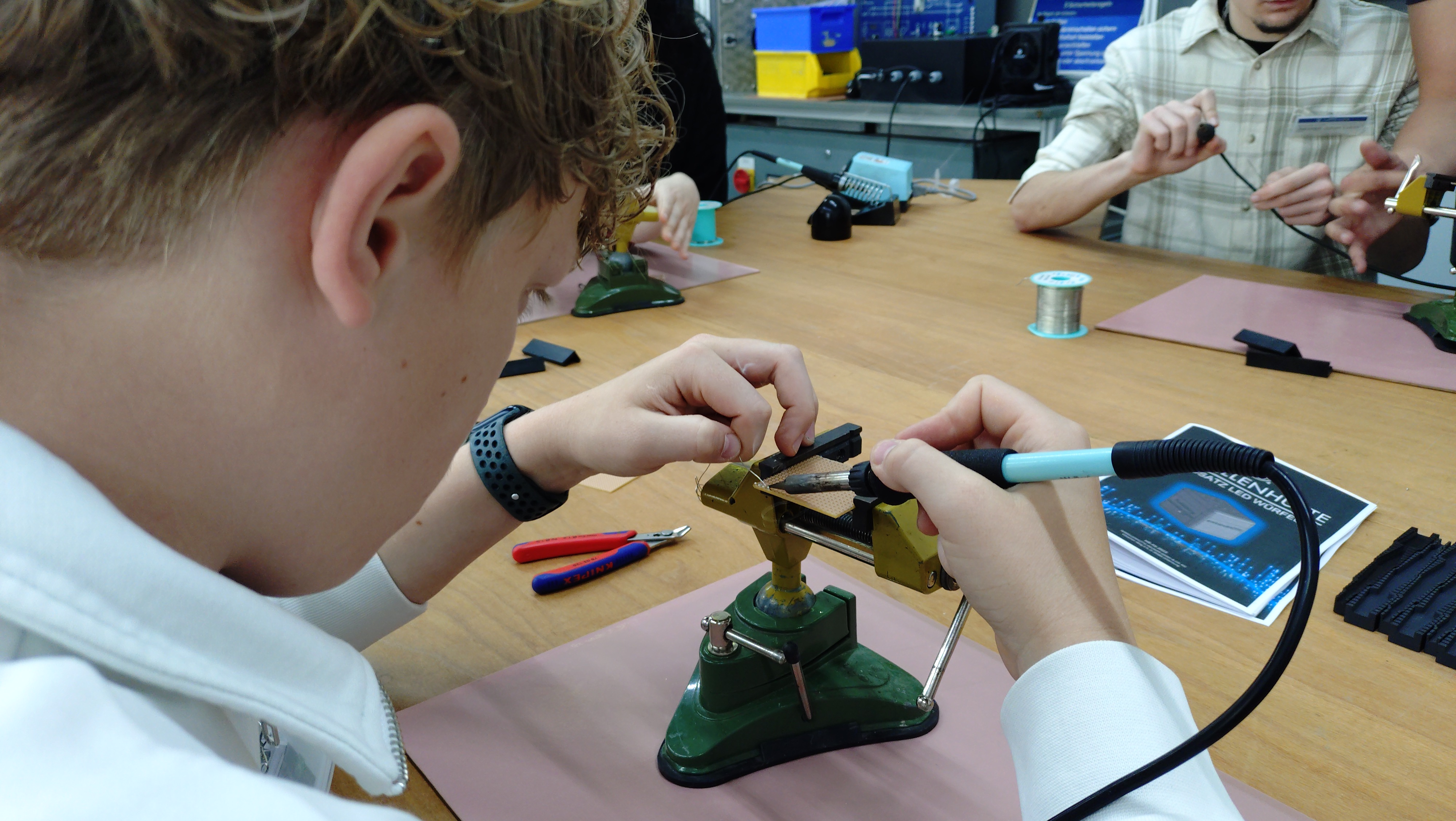 Schon bald begannen sie, auf Lochrasterplatinen ihre ersten Lötpunkte zu setzen und den Umgang mit den unterschiedlichen Werkzeugen zu erlernen. Das Highlight des Tages war ein eigenes Lötprojekt: der Bau eines LED-Würfels. In einzelnen Schritten löteten die Jugendlichen die benötigte Schaltung und setzten daraus schließlich einen funktionsfähigen Würfel zusammen, den sie am Ende des Workshops stolz mit nach Hause nehmen konnten.
