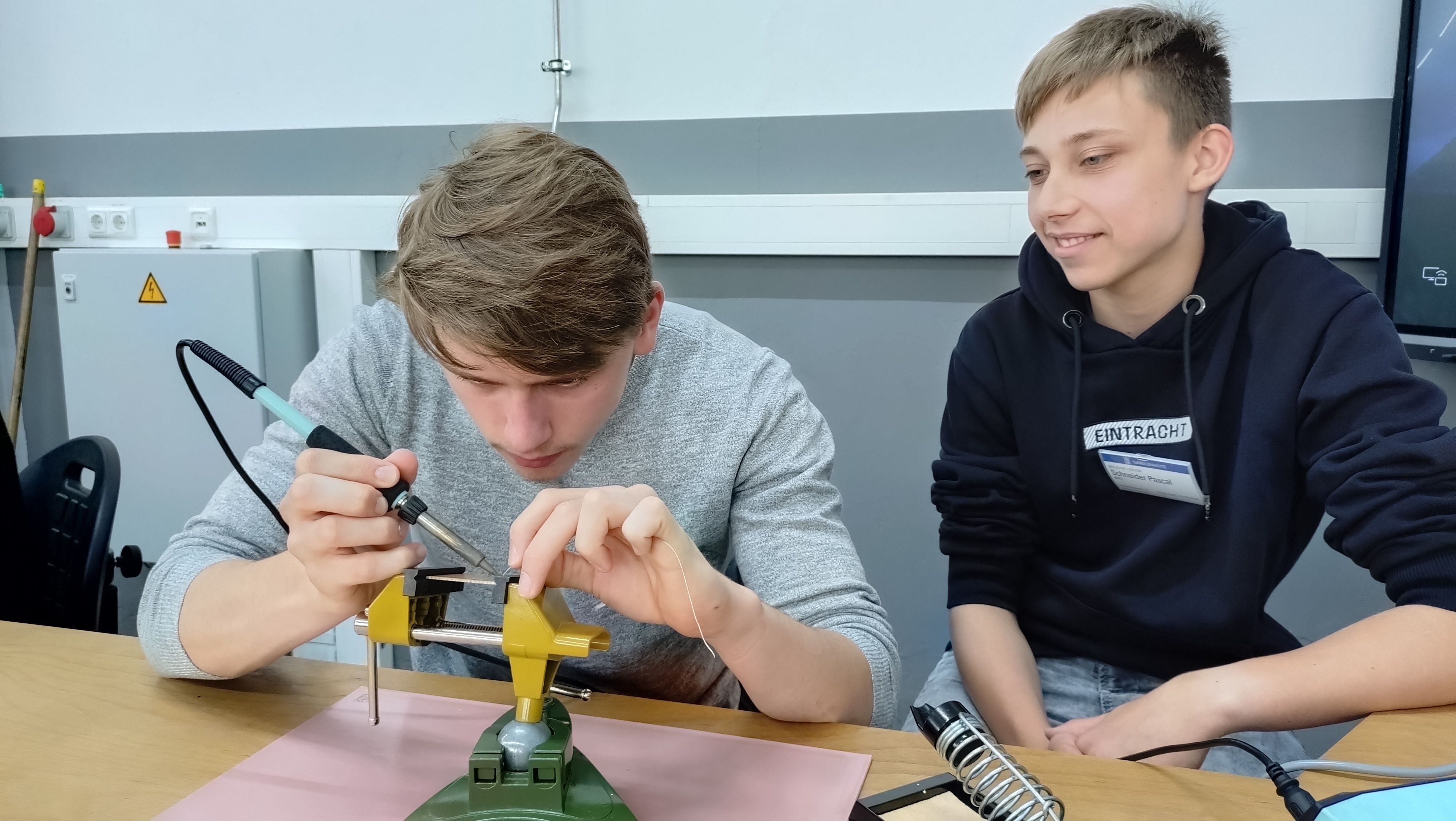 In der Isabellenhütte durften die Jugendlichen des WU-Kurses Dynamo plus einen Tag voller spannender Löt-Erfahrungen sammeln. Nachdem Ausbildungsleiter Mario Hofmann das Unternehmen mit seinen Produkten und Kooperationen vorgestellt hatte, erhielten die Teilnehmer eine Einführung in verschiedene Löttechniken.